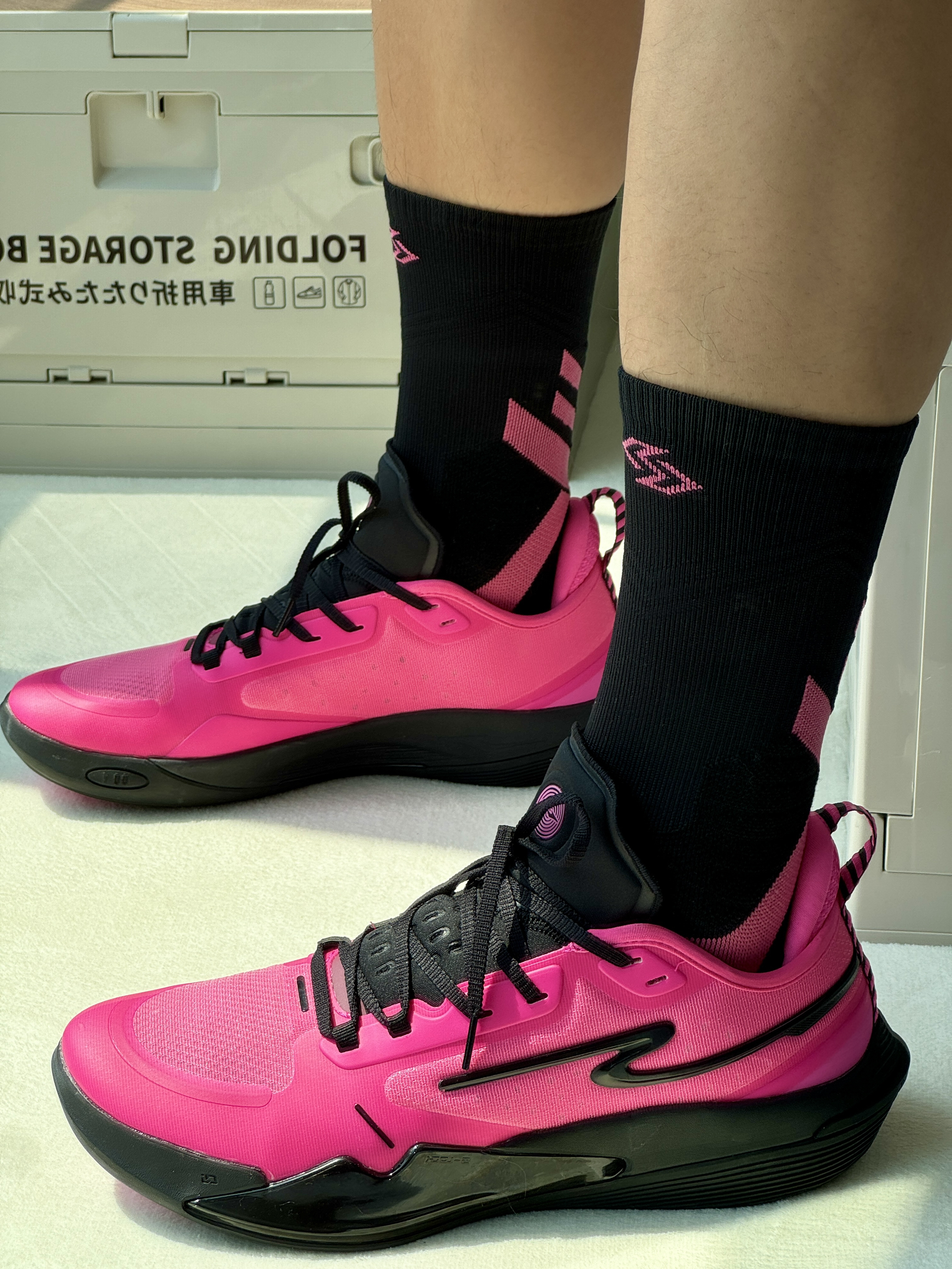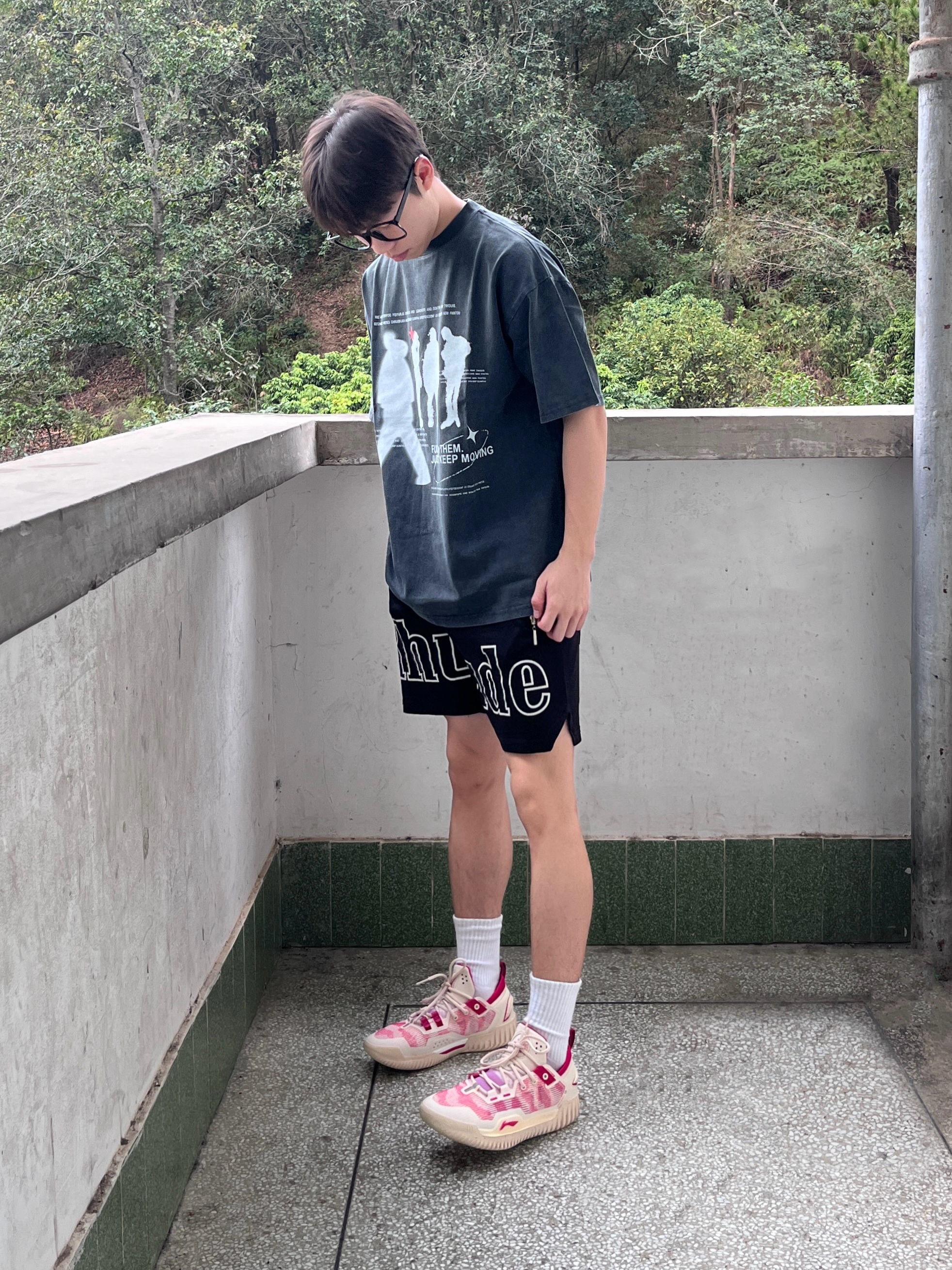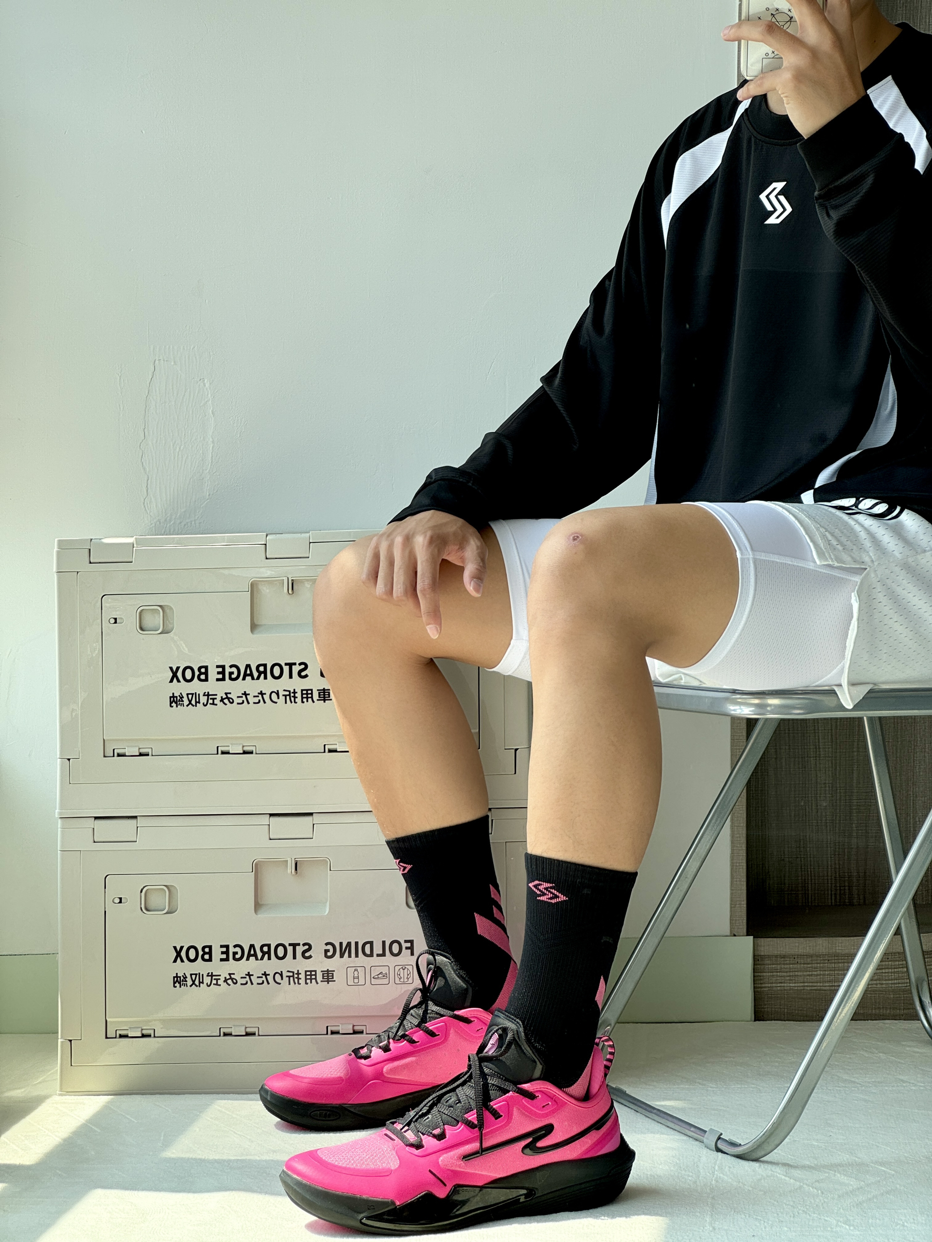 oi大家好这里是爱球鞋穿搭的小学生的故事今日份黑粉色球鞋穿搭有点小酷吧 👔🩳 降温了黑色投篮服搭配白色短裤打球合适又百搭 👟 奇袭1黑粉黑粉的火龙果配色搭配黑粉色球袜打球这样穿我赌你肯定会觉得酷!