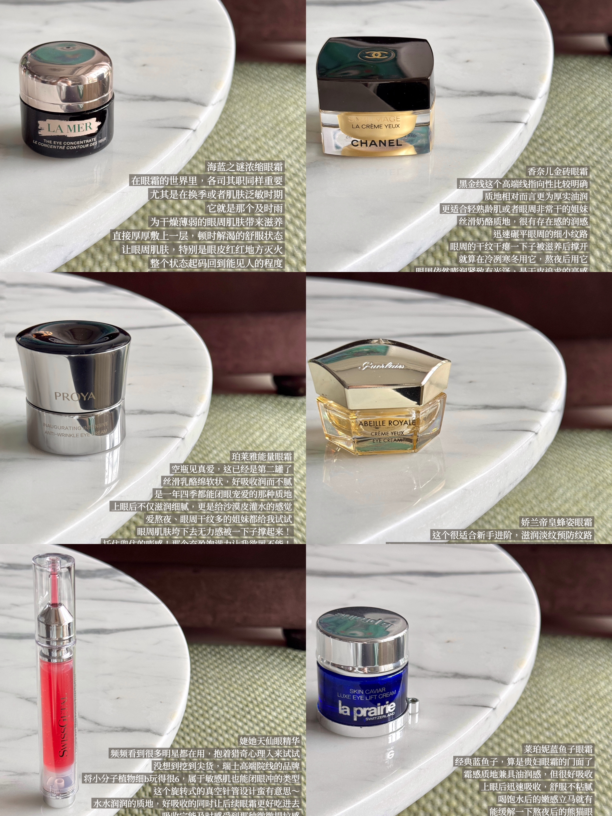 说到抗时光保养,眼部护理无疑是关键一环 经常听到这么一句话,你从几岁开始注重眼周保养 眼部保养的起始年龄,往往定格了眼周肌肤的状态 虽略带夸张,但精心呵护过眼周 确实在视觉上更显年轻 以下这几款值得投资的眼霜/眼精华 推荐给有预算的姐妹~ - 珀莱雅能量眼霜 婕她天仙眼精华 海蓝之谜浓缩眼霜 莱珀妮蓝鱼子眼霜 娇兰帝皇蜂姿眼霜 香奈儿金砖眼霜 #抗老眼霜 #贵妇眼霜 #护肤就爱小众品牌 #珀莱雅能...