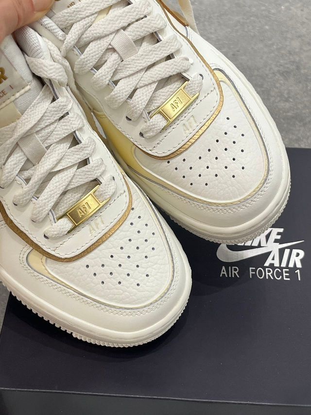 鞋子整体配色以白色为主金色点缀,看起来很精神好有高级感哦,皮革的鞋面加厚的鞋底时尚百搭,哪个女孩子能拒绝这样一双空军呢?