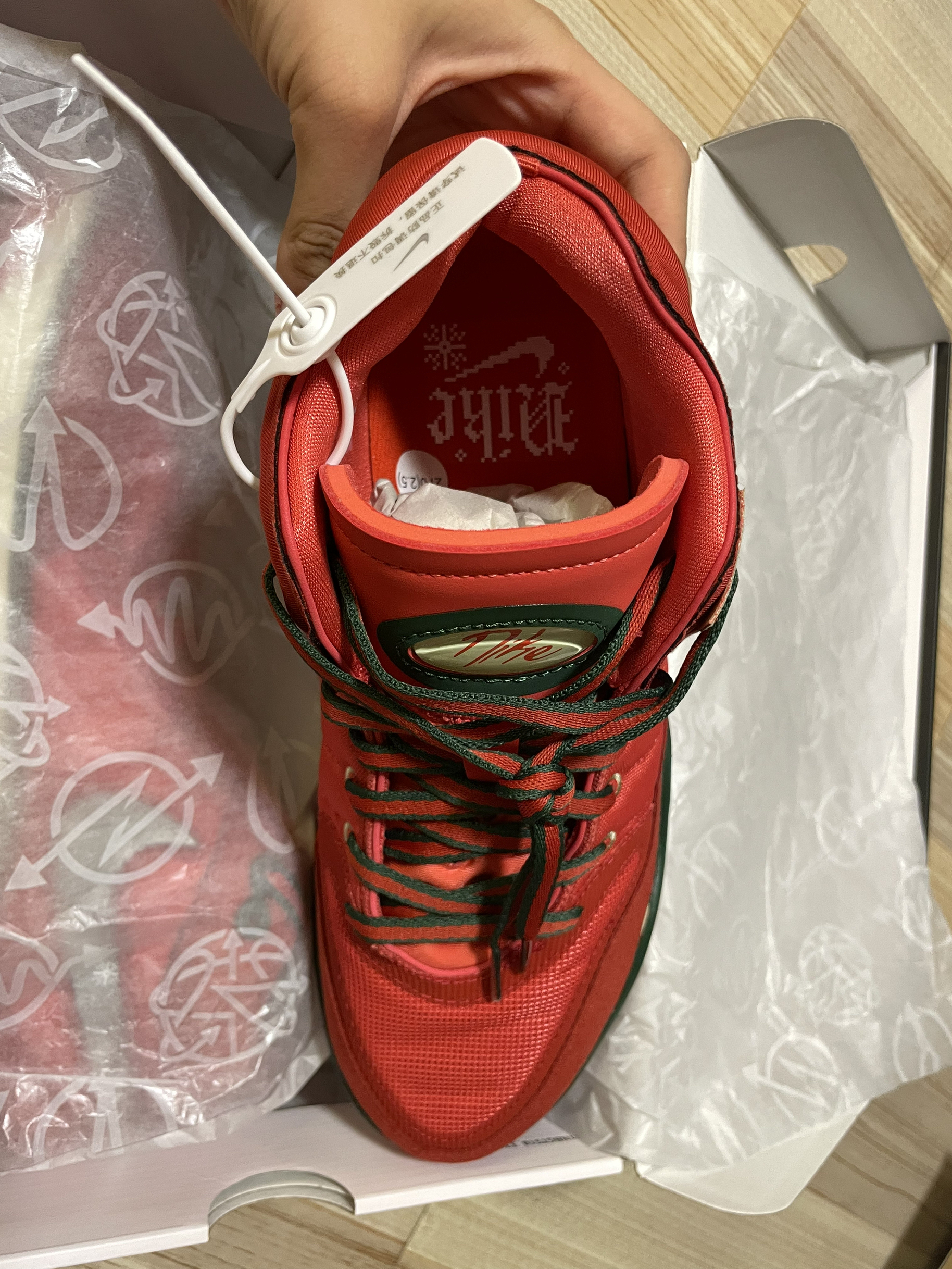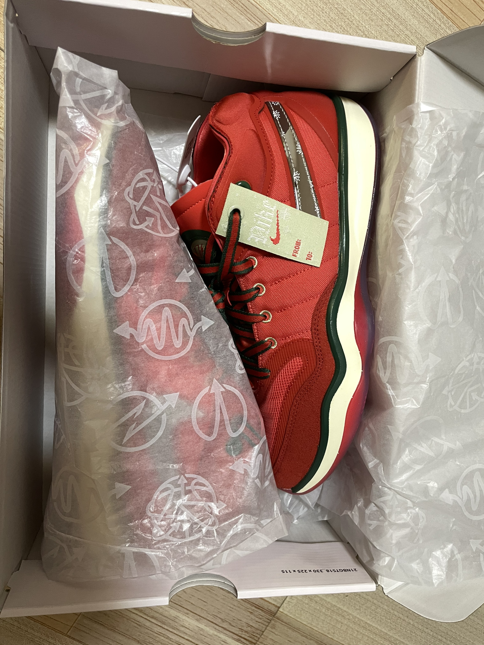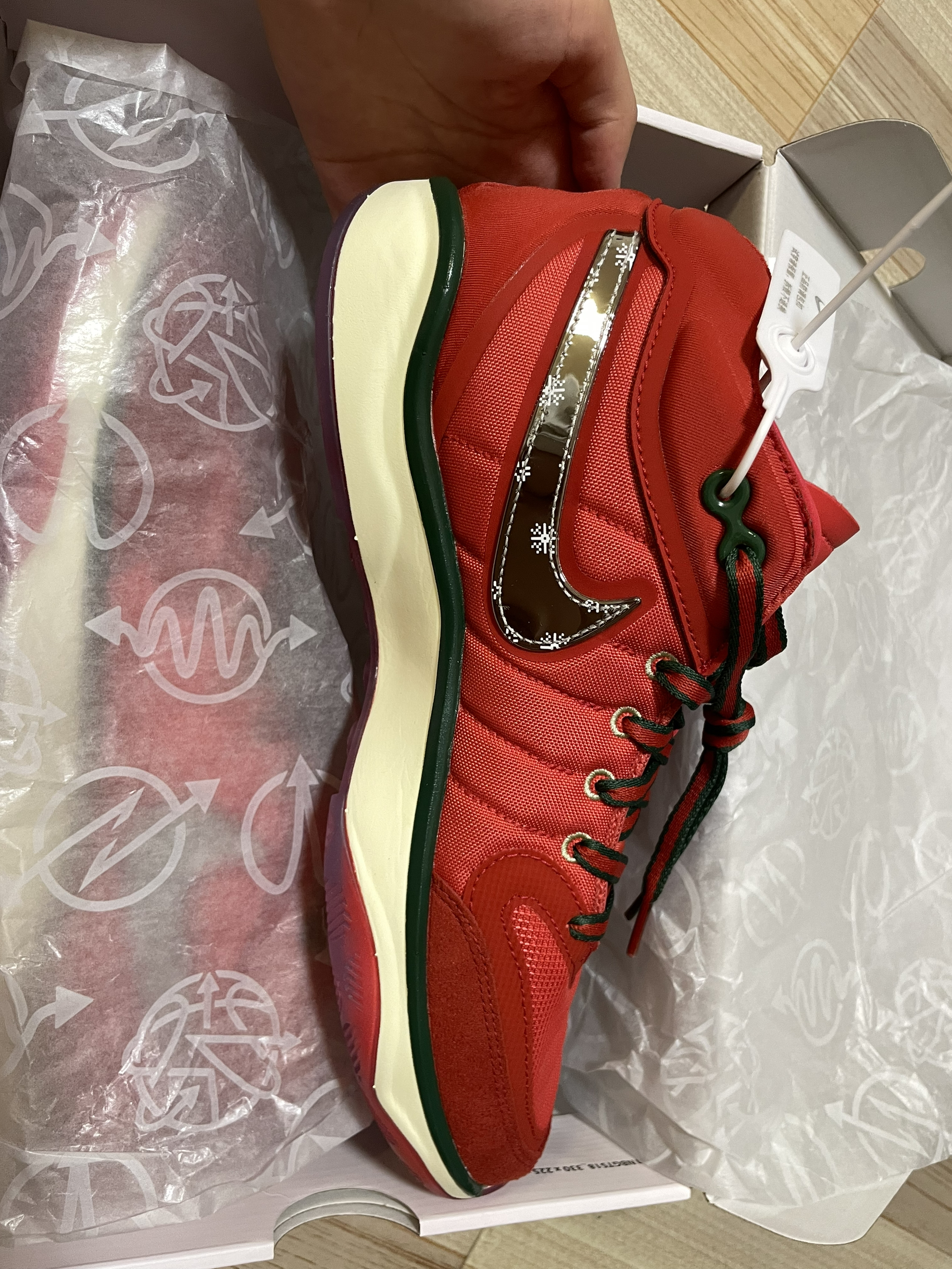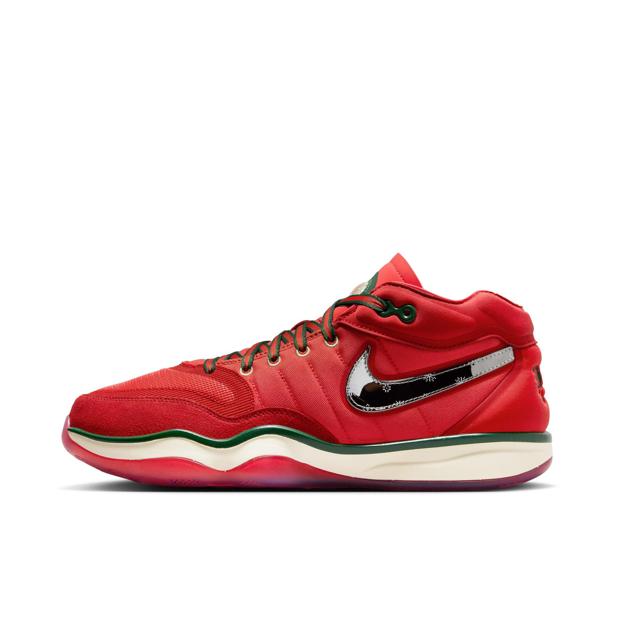 整体以醒目的红色装扮示人 鞋带以红绿双带呈现和鞋面绿色相呼应 鞋侧swoosh采用镜面银色妆点还有雪花图案点缀 非常特别的设计 总之是又帅又能打的实战鞋之一