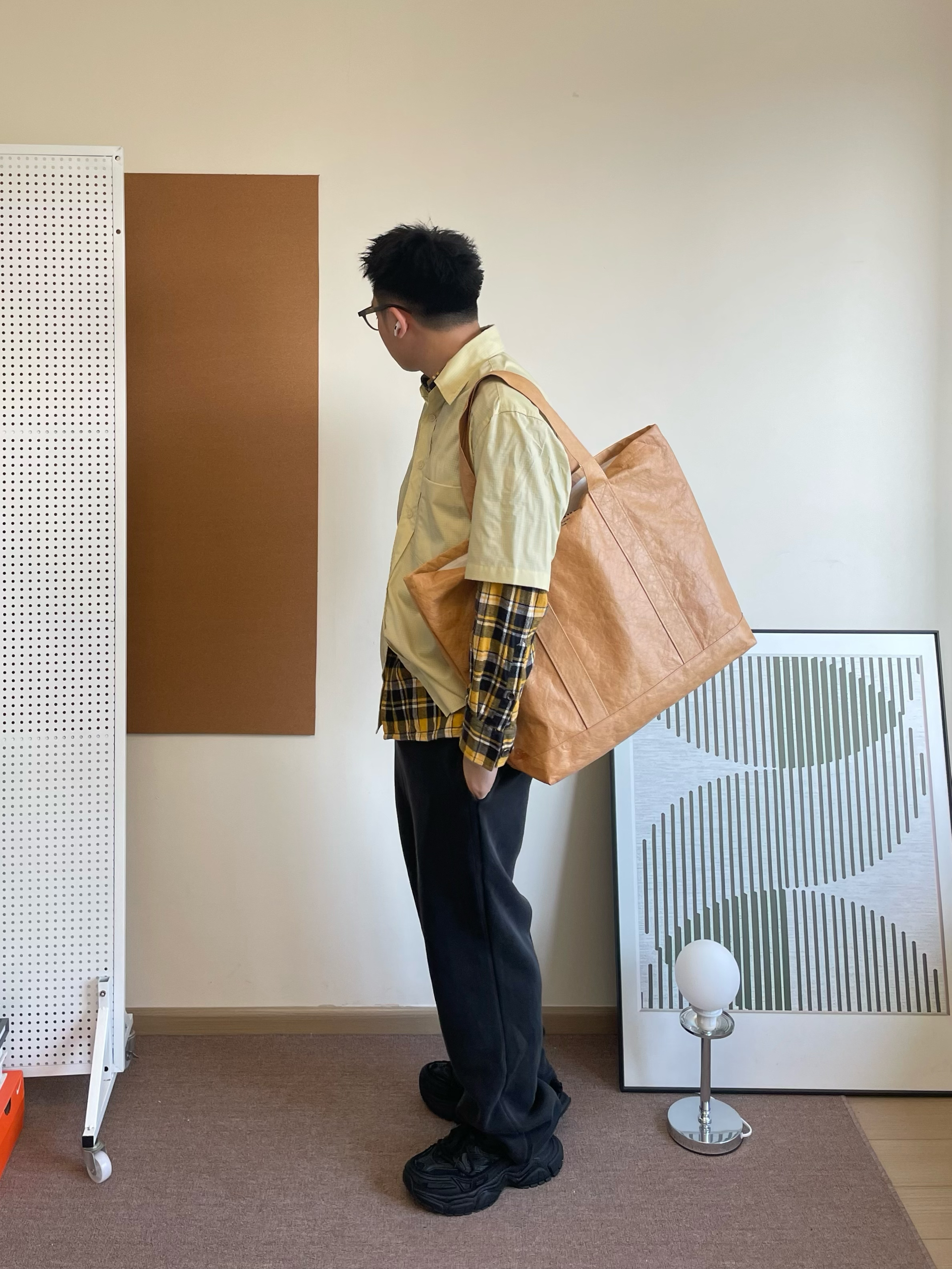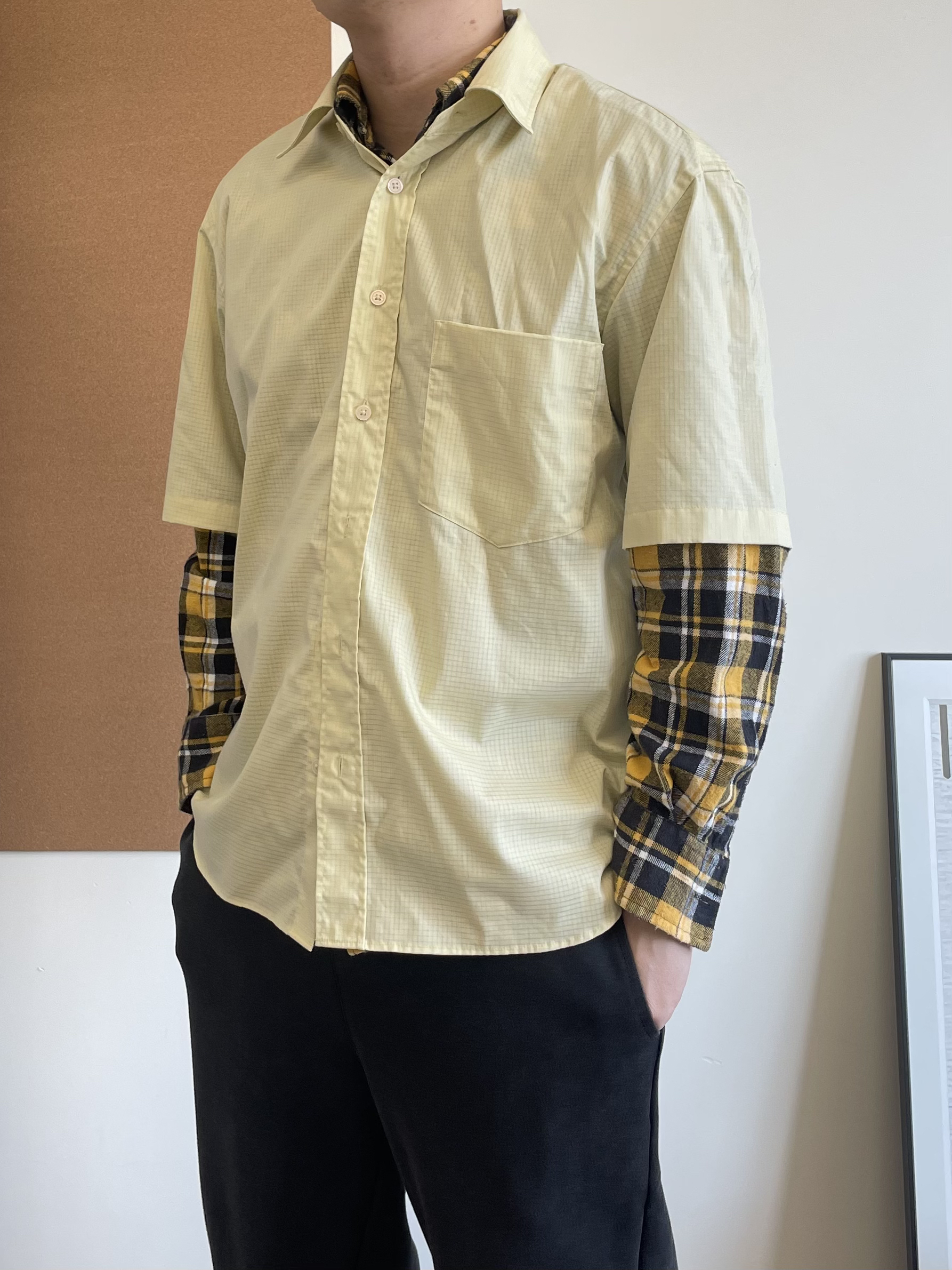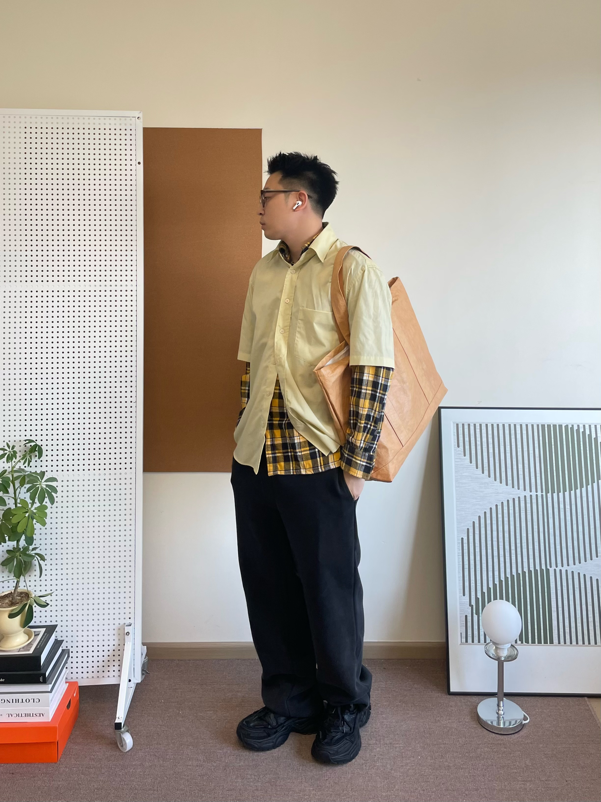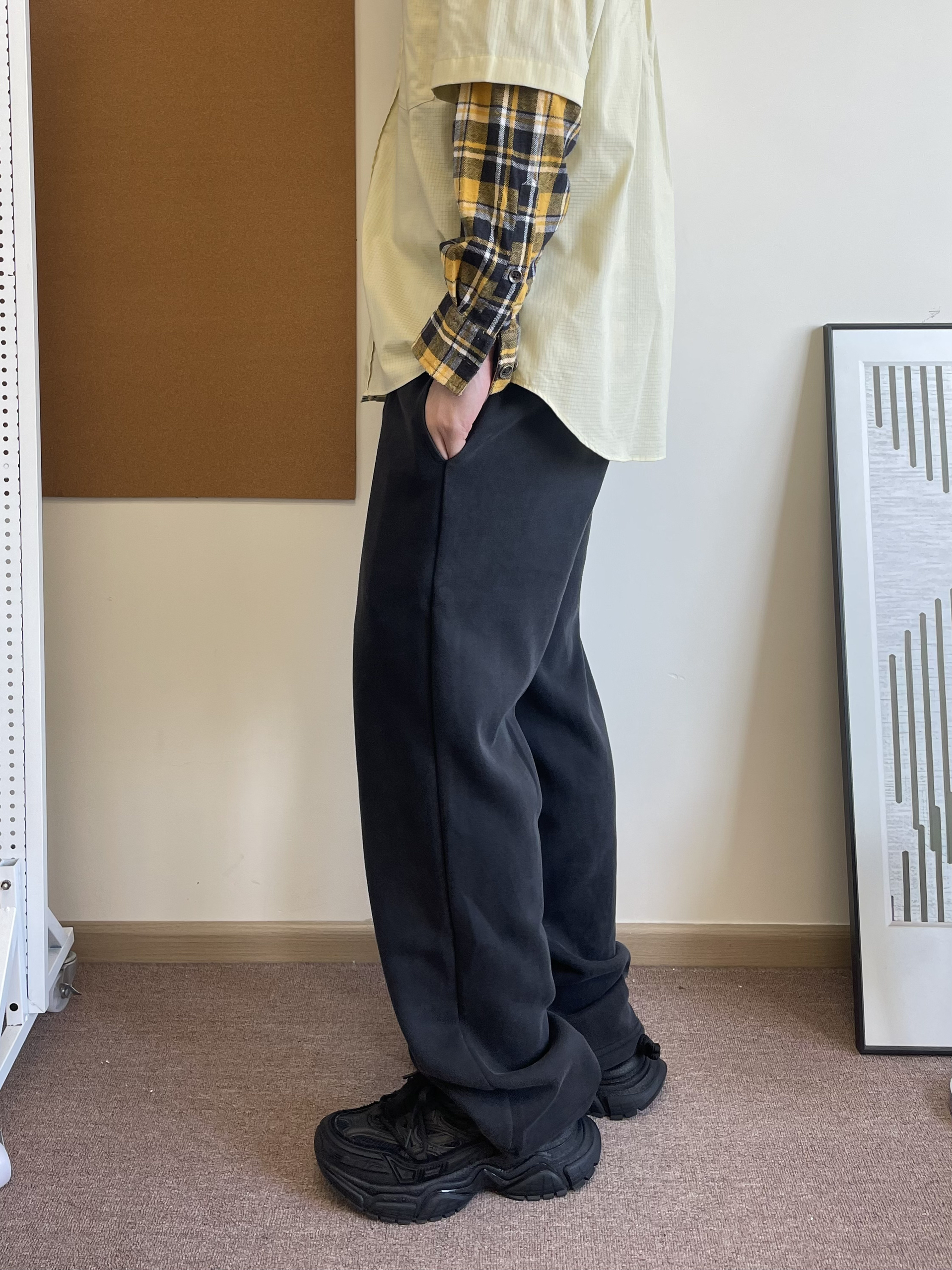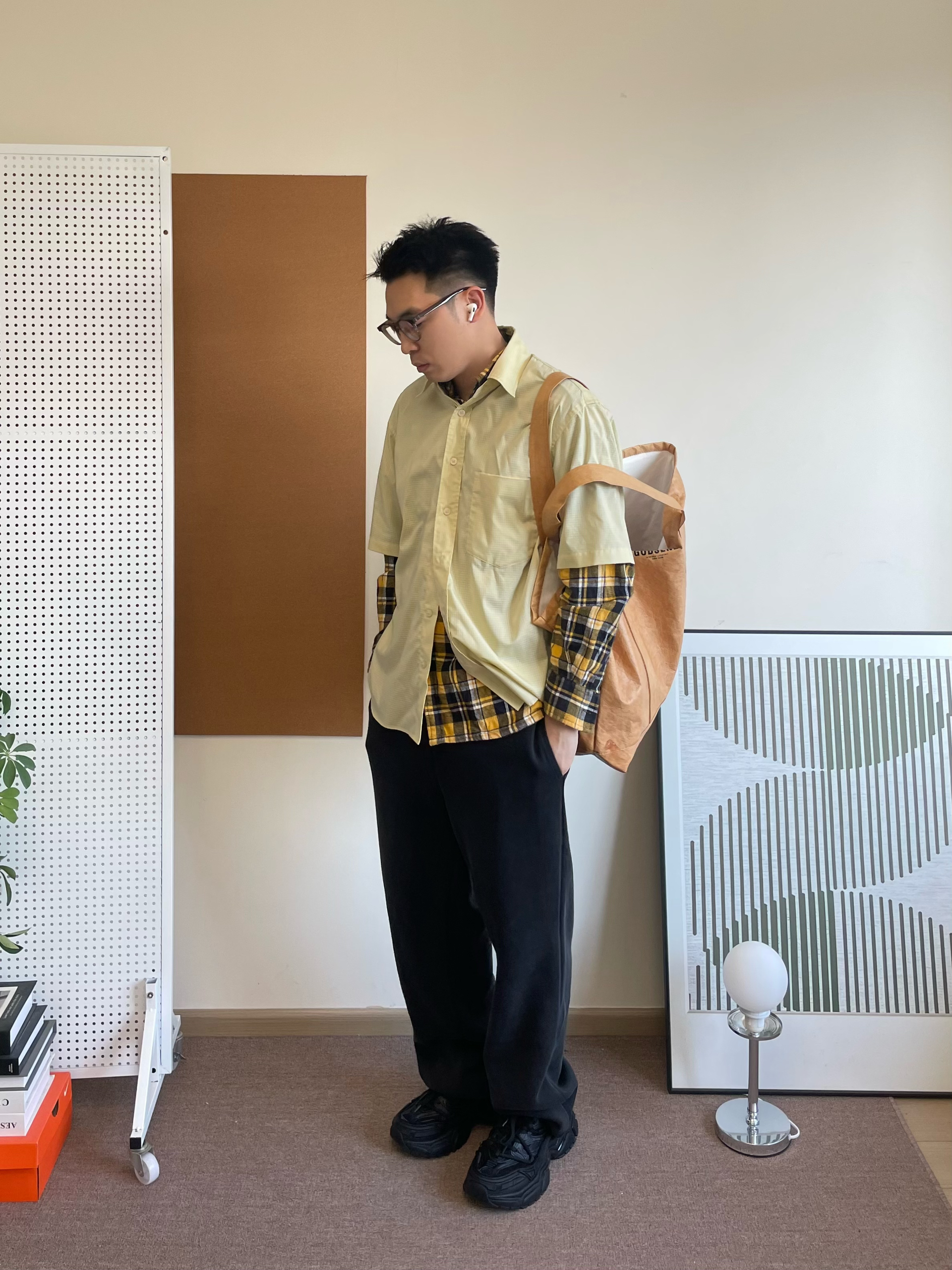 🧡我选择了一件黄色格纹衬衫作为内搭,叠穿了一件同色系短袖,增加了层次感。黄色格纹给沉闷的秋冬带来一抹亮色,而且同色系的搭配让整体更加和谐统一。 🖤下装是一条深灰色的简约卫裤,舒适又百搭。它的版型很适合小个子,不会显得拖沓,反而能拉长腿部线条。 👟鞋子我搭配了一双百搭黑武士老爹鞋。它的厚底设计可以增加身高,而且款式时尚,搭配休闲装还是运动装都很合适。
