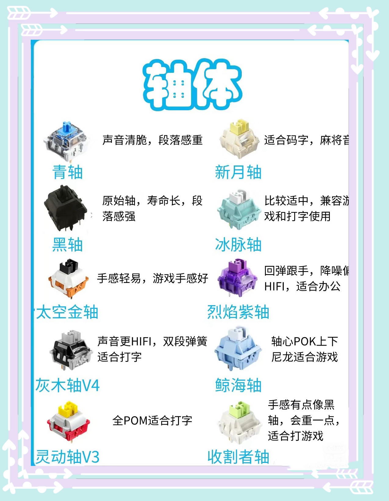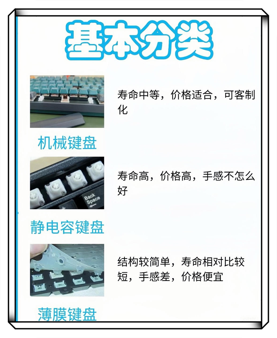 一、键盘分类 (一)机械键盘 其具有寿命中等、价格适宜以及可定制的特点。 (二)静电容键盘 此类型键盘寿命长但价格高,手感欠佳。 (三)薄膜键盘 结构简单,寿命较短,手感差且价格便宜。 二、轴体 (一)青轴 声音清脆,段落感明显,适合文字输入,会发出类似麻将的声音。 (二)黑轴 作为原始轴,寿命长且段落感强,适中的特性使其兼容游戏和打字。 (三)太空金轴 手感轻盈,在游戏操作时手感良...
