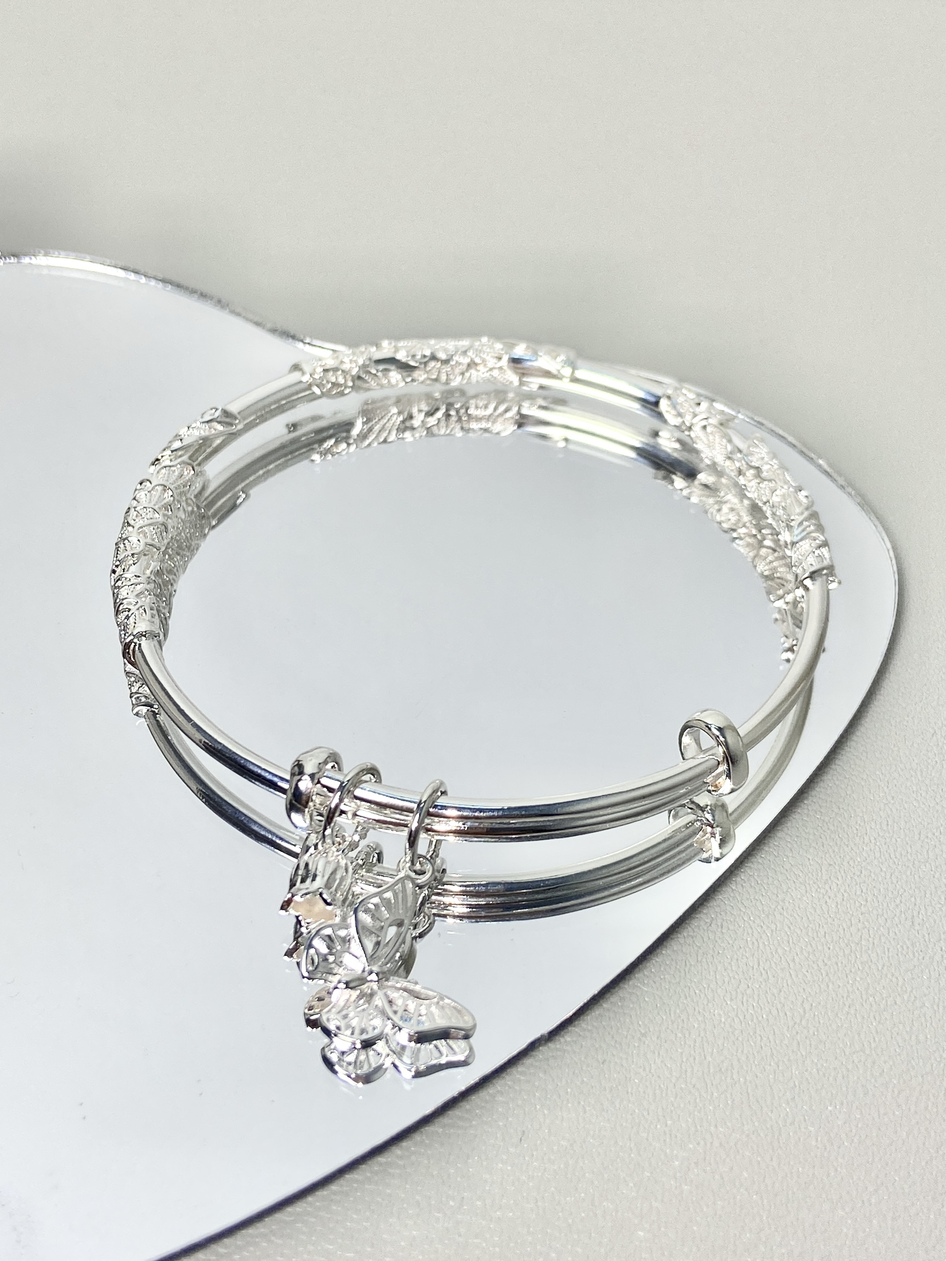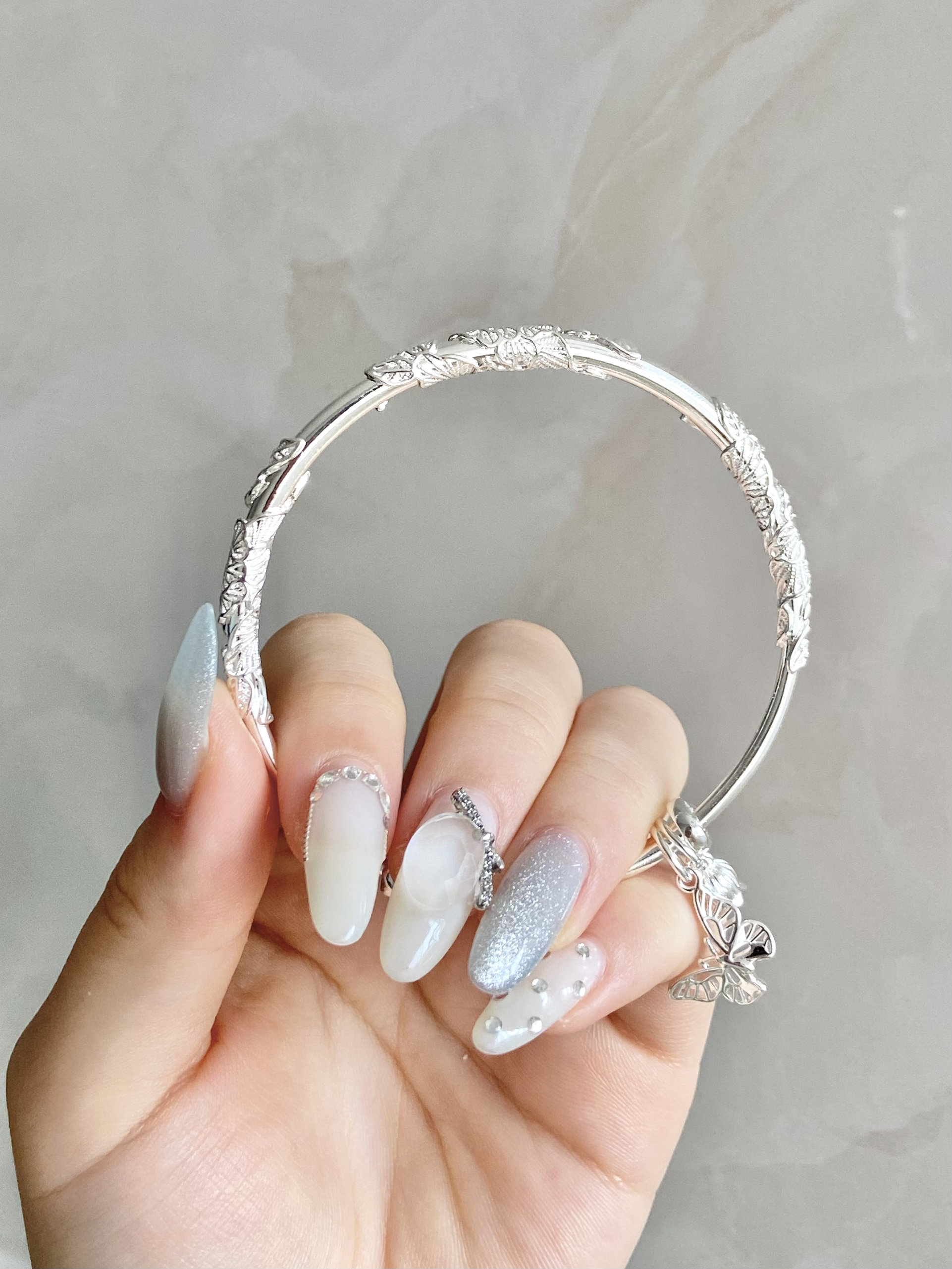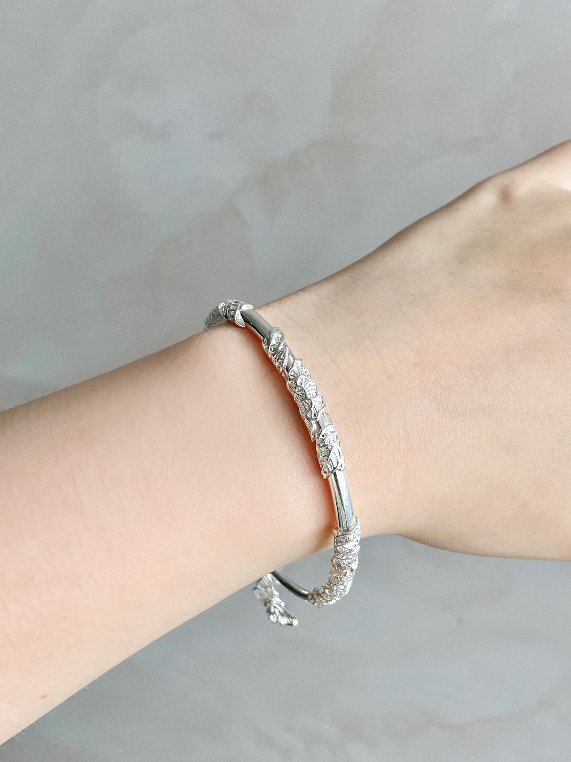 女孩子👧的手上都应该有漂亮的银手镯~ 卡蒂罗的繁花似锦手镯真就一眼爱上! 立体的繁花雕刻好精致~ 银镯子质感满满 还有小蝴蝶🦋和铃铛🔔的吊坠 敲可爱☺️ 显白又温柔~ 戴在手上真的舍不得摘下来了