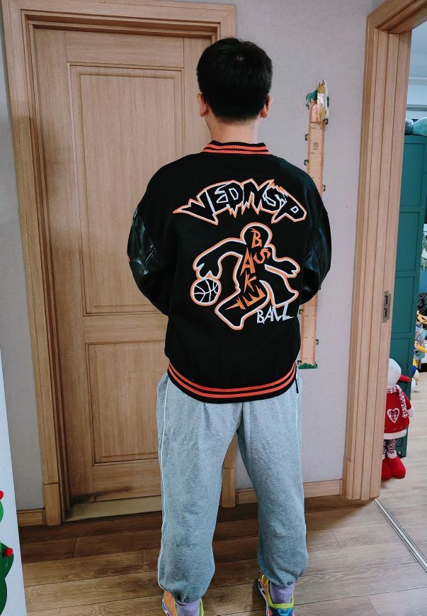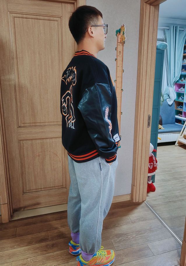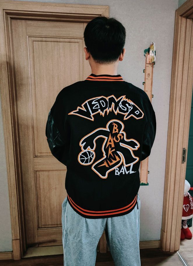 立体剪裁,拼接工艺,袖子 PU 皮革材质,前后毛尼大衣质感。纽扣代替拉链穿脱设计,更方便更耐造,袖口和下摆做的针织包边,毛绒亲肤,皮革材质手感顺滑厚重,衣服质量也是可圈可点。棒球服版型,春秋外套的薄厚体验,正适合这个入秋转凉的季节。 黑色主体加以橙色点缀,内敛中带着活泼。胸口加粗的品牌 logo 以及后背上运球的动漫小人,彰显着青春洋溢的个性。 日常穿着好搭配,连帽...