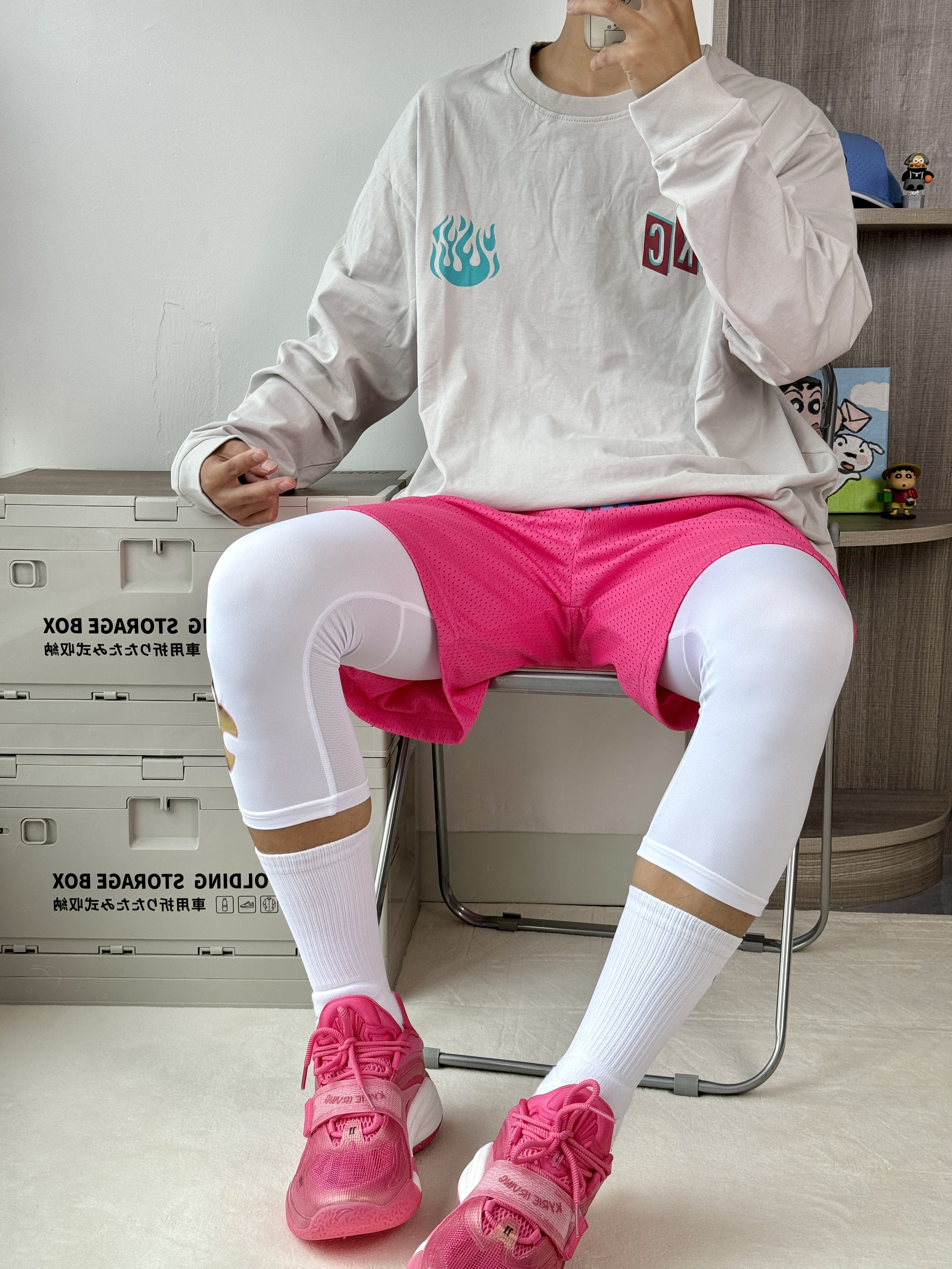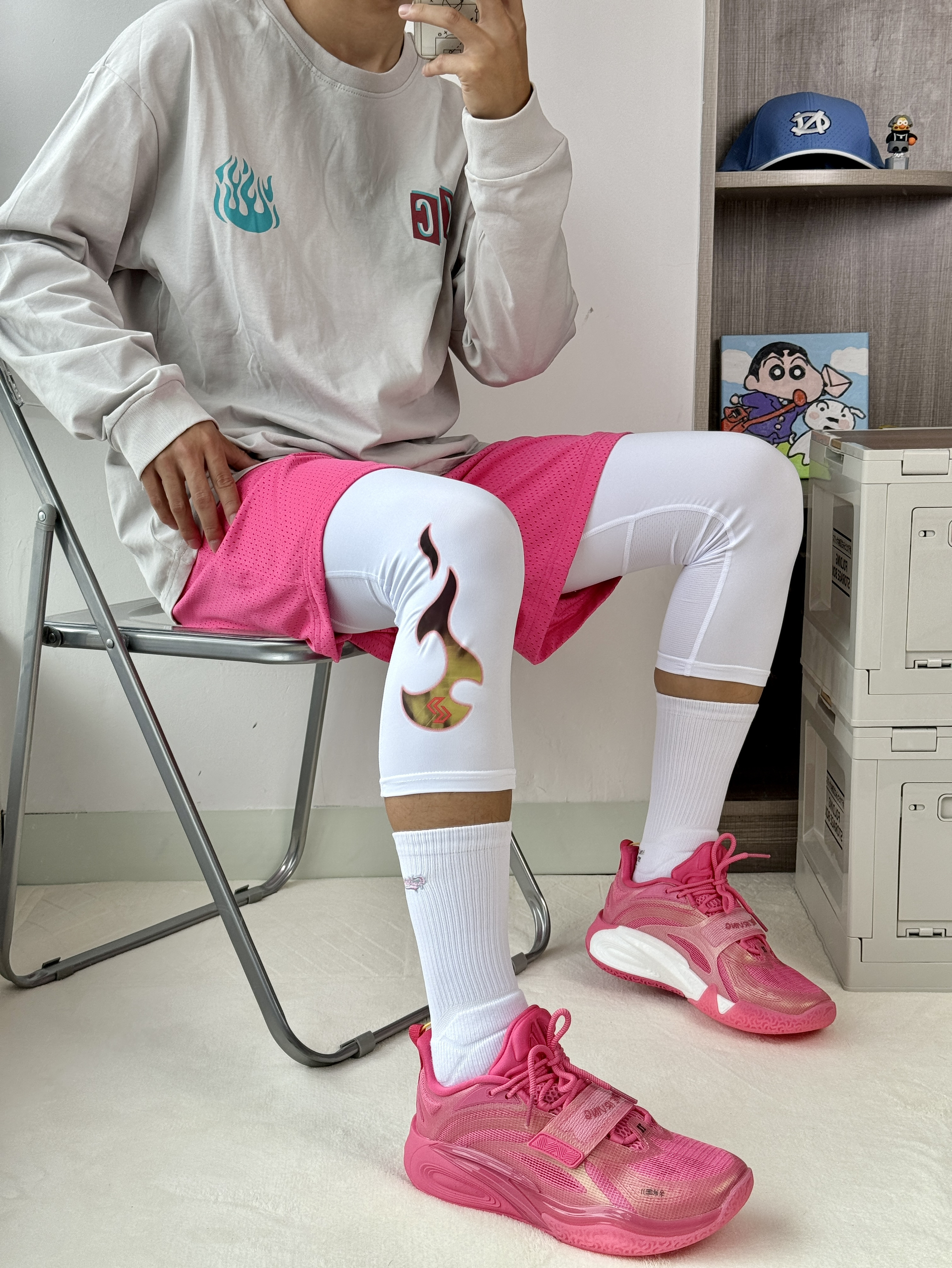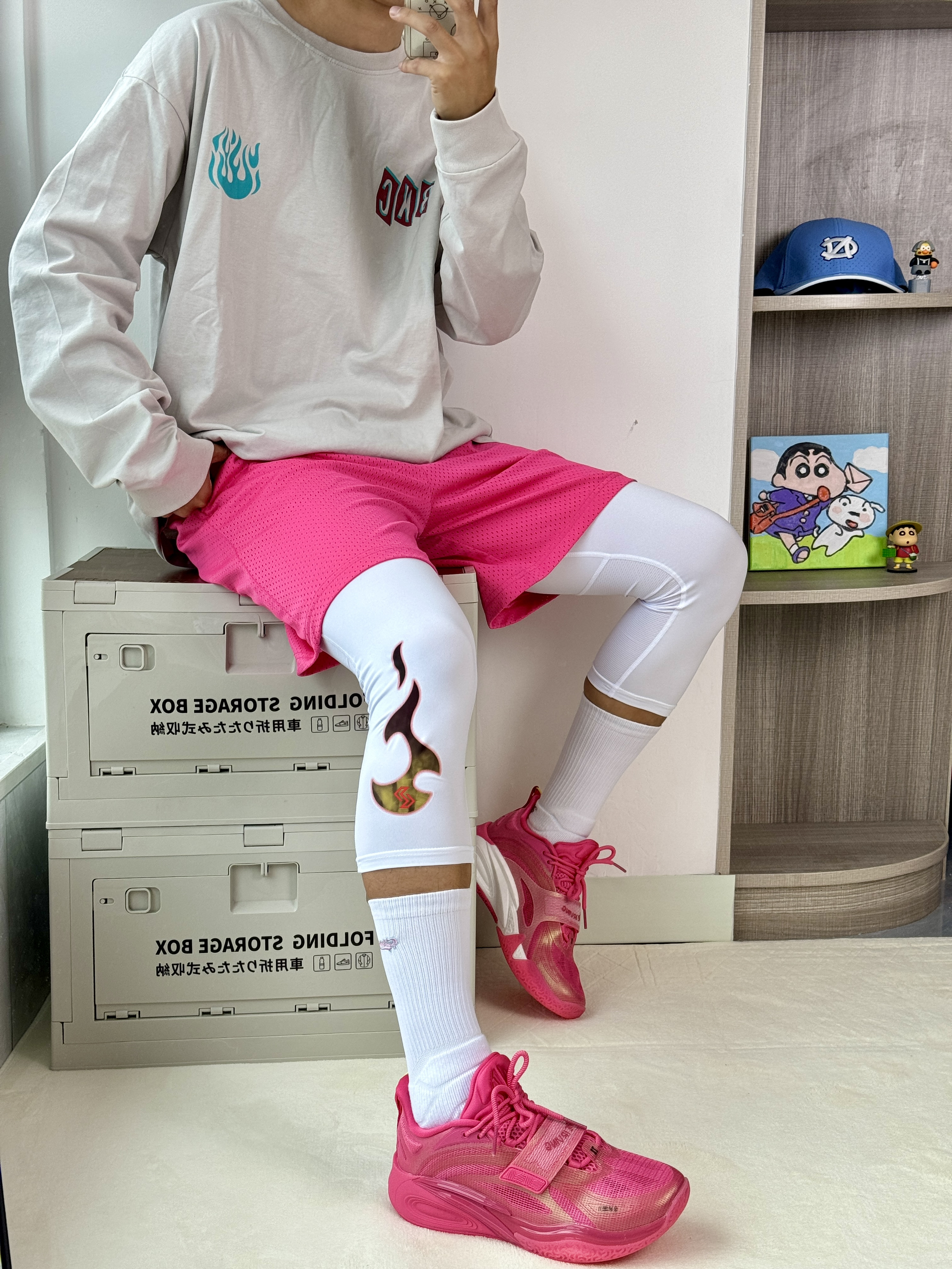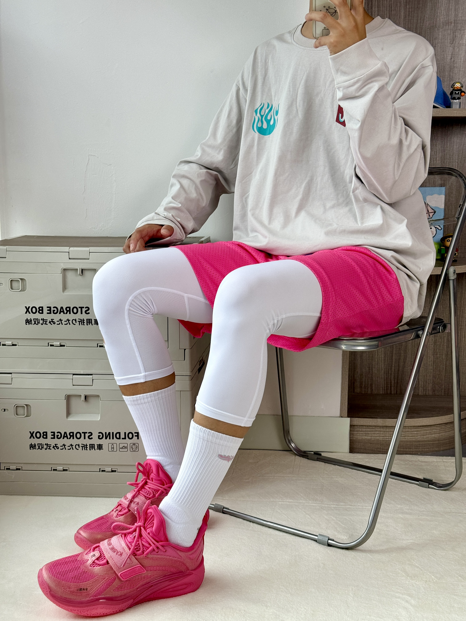 oi哈喽这里是爱球鞋穿搭的周鱼鲲入秋的第一 套粉色穿搭怎么样呢🤔 👔🩳一件米白色长袖胸口好看的火焰🔥印花 蛮酷休闲打球都可驾驭再搭配一条粉粉的短裤 和🔥紧身裤蛮搭的 👟欧文1深粉色这配色很有感觉的很匹配欧文 华丽的秋风上脚舒适又帅气!