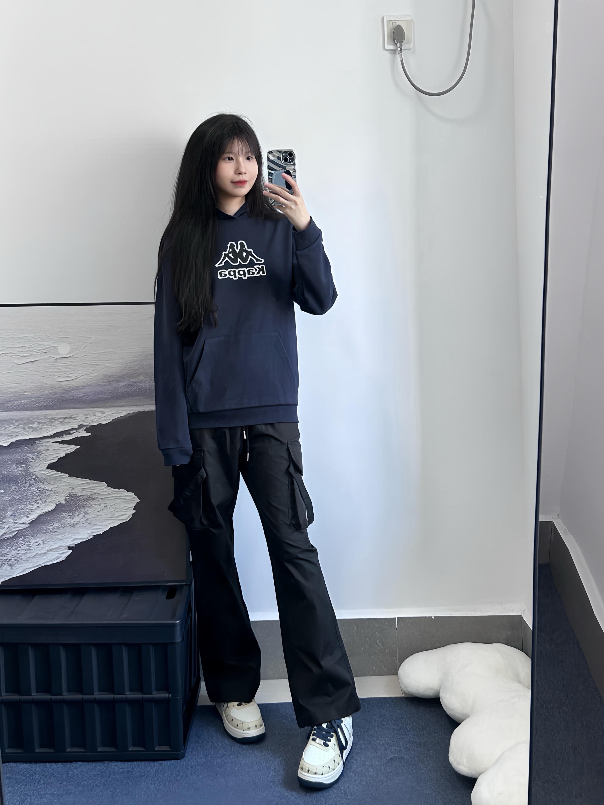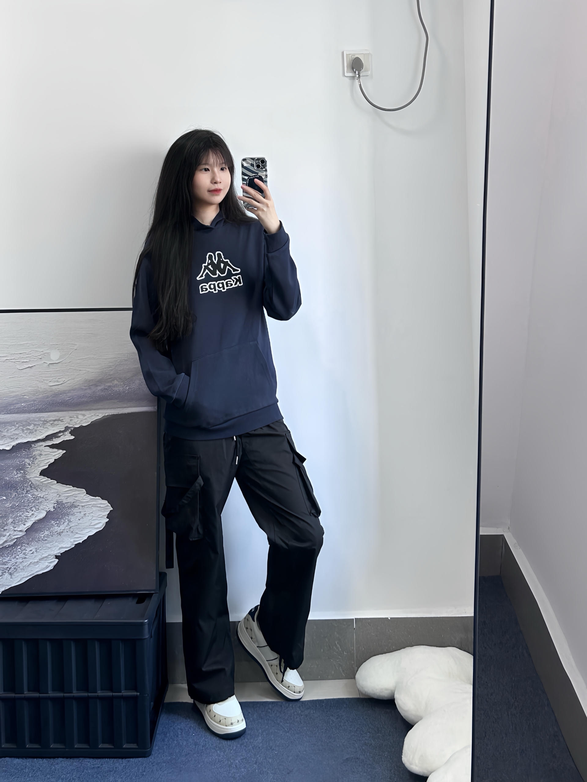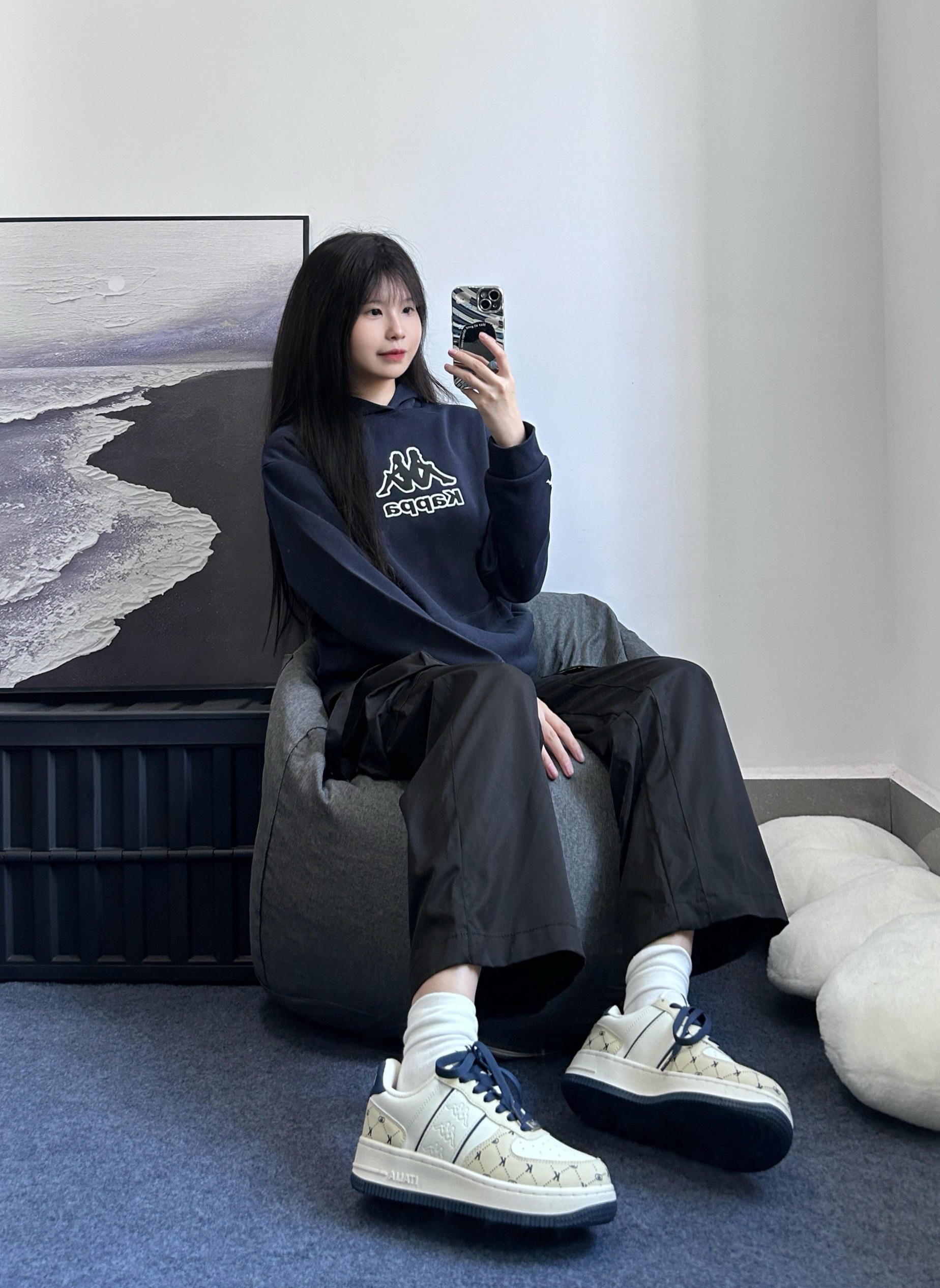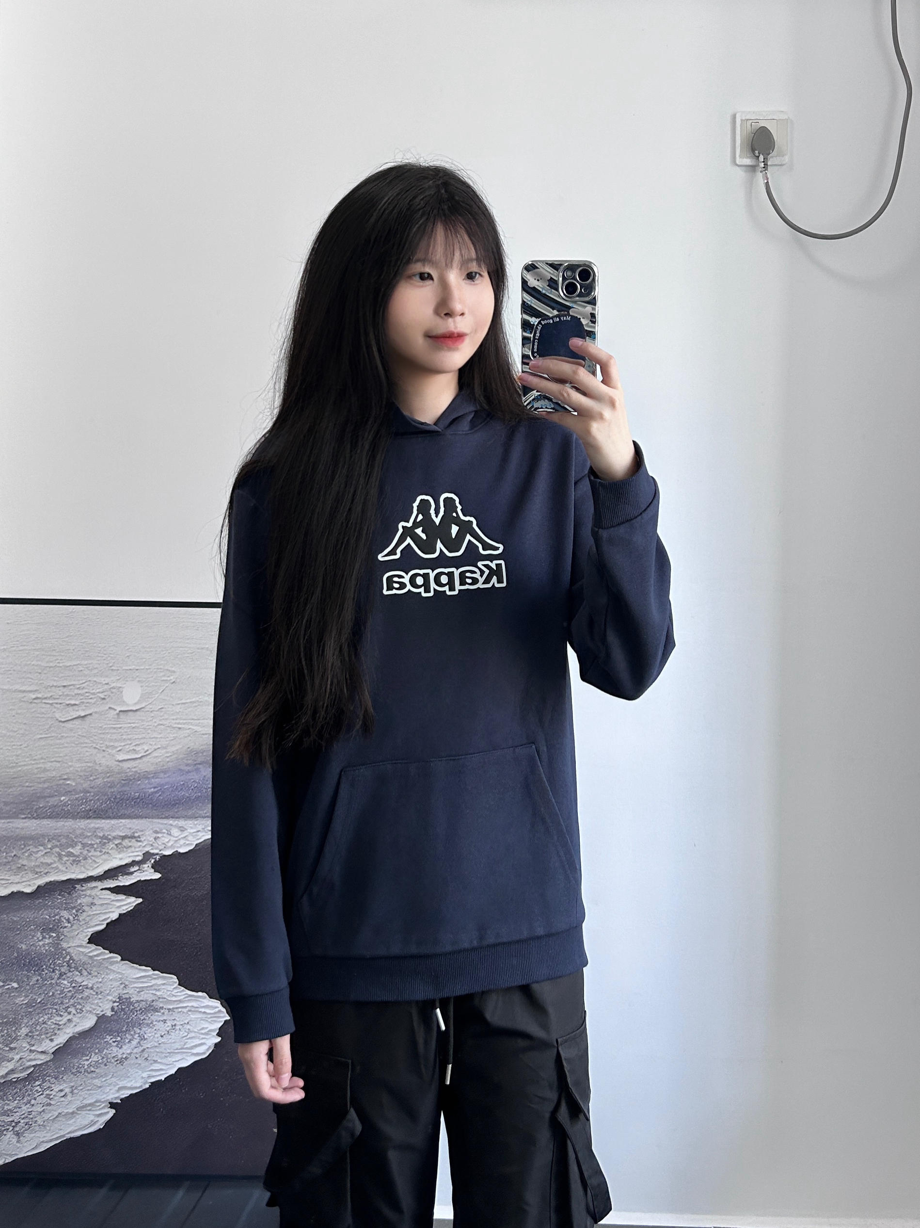 舒适自在又好看的藏蓝色卫衣 胸前经典的印花图案不会花里胡哨基础款式~ 冬天还可以作为内搭穿 下身可以搭配休闲裤牛仔裤