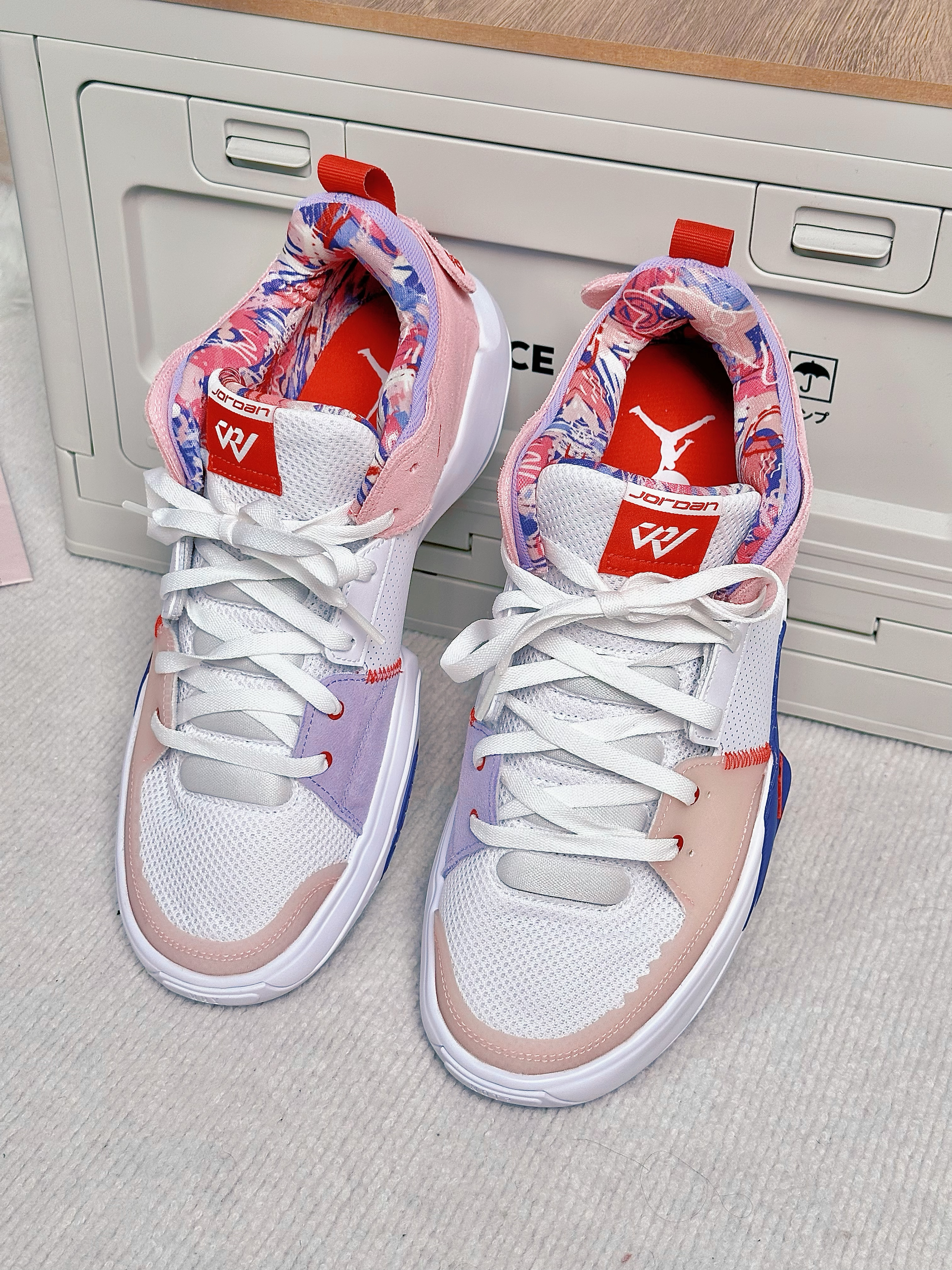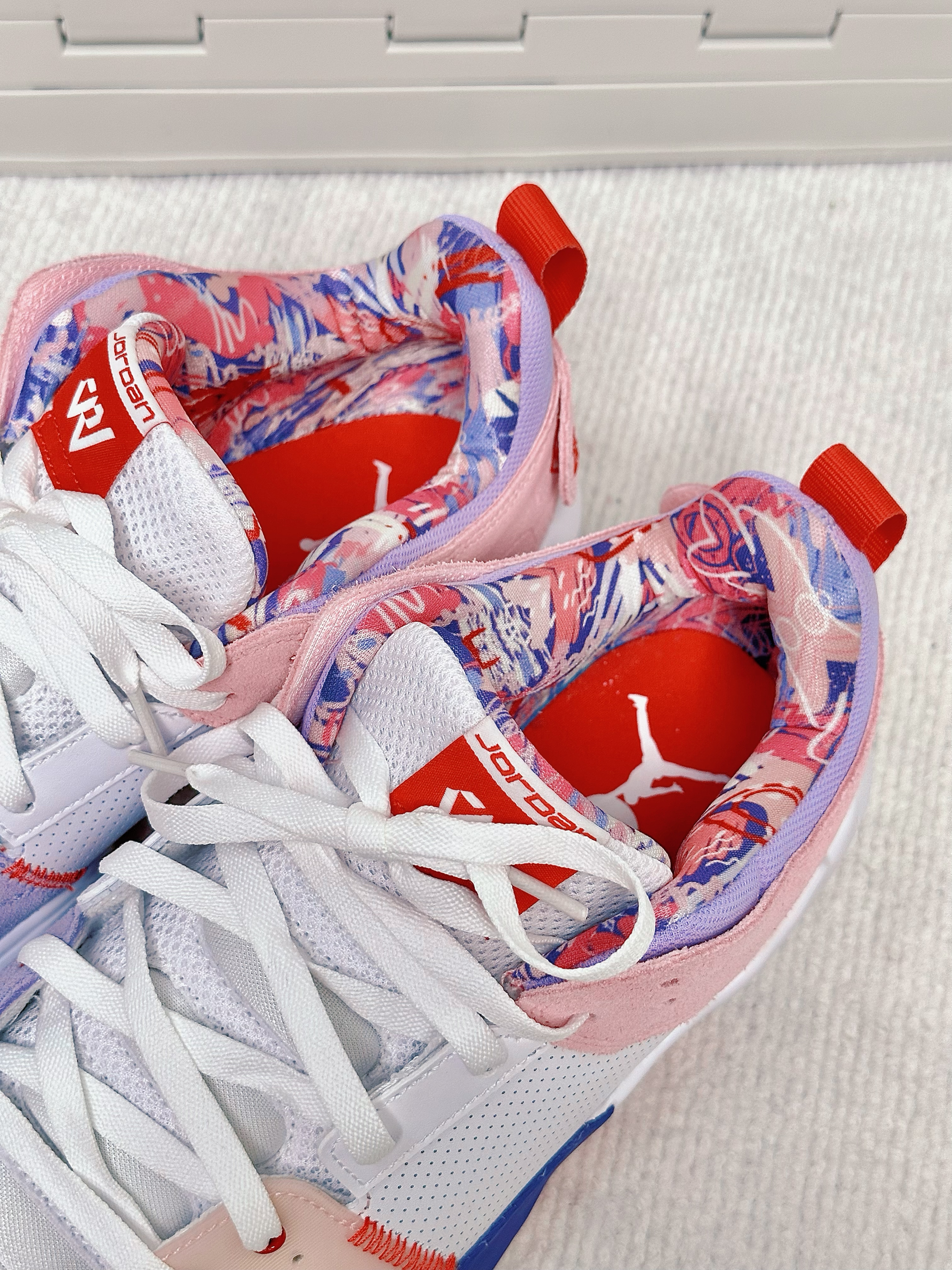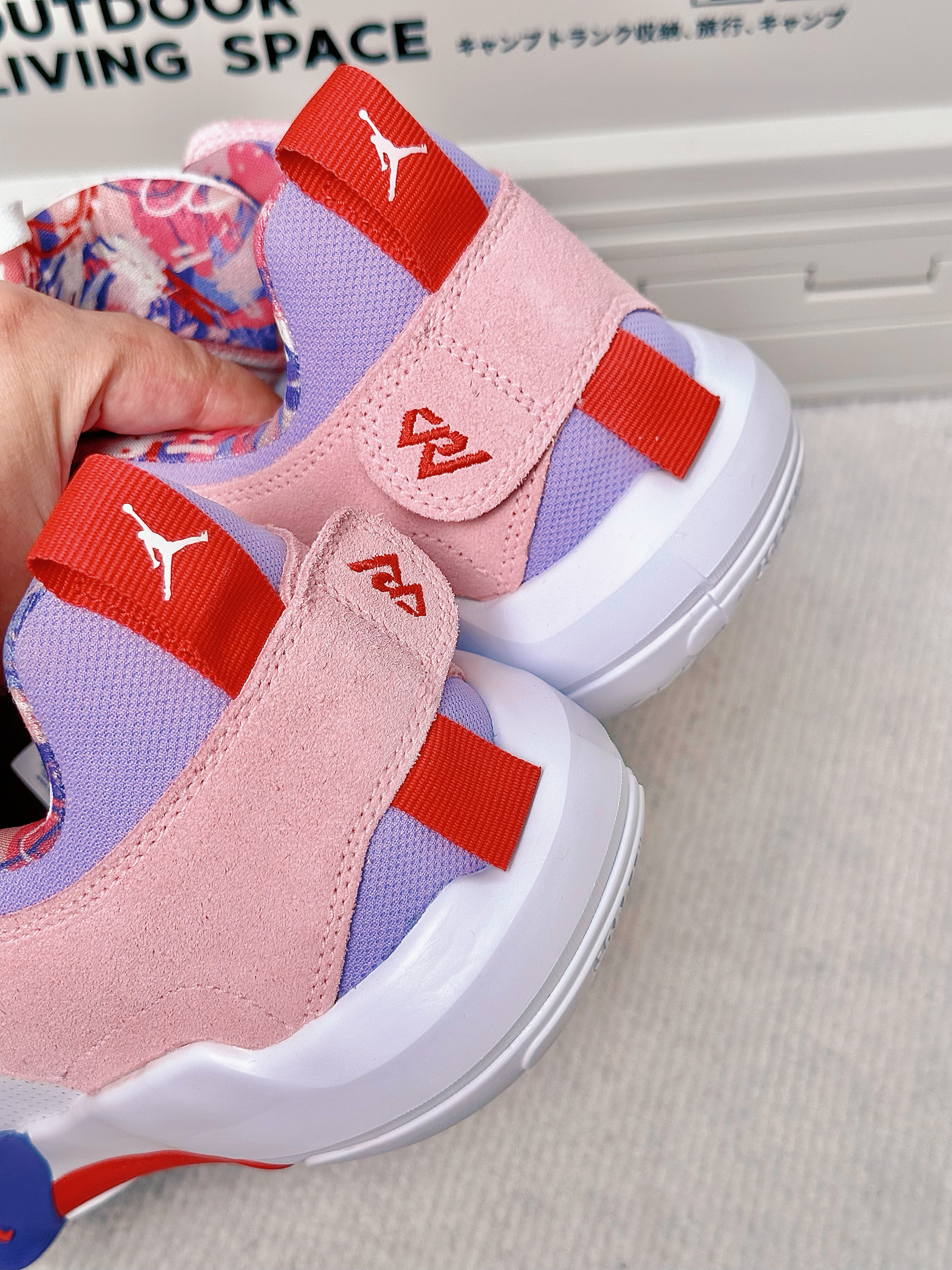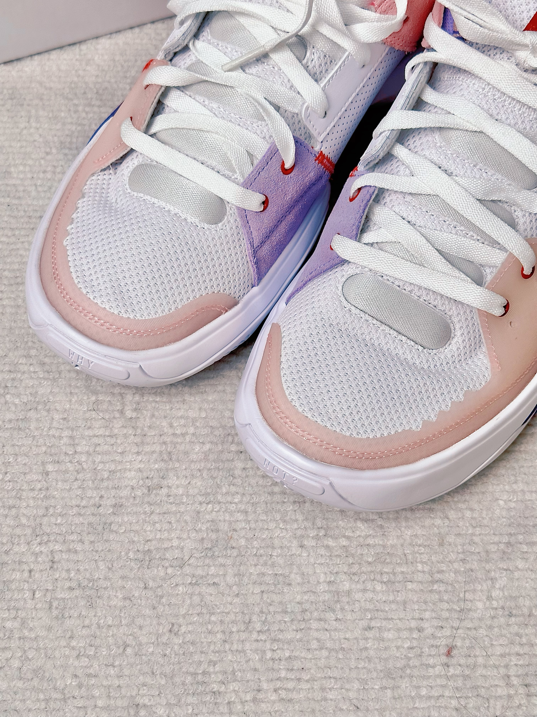 一眼看中的就是这双鞋的配色 鞋面粉白紫🍬鞋底也是很好看的红蓝 属于是穿搭属性拉满了的篮球鞋 👍亮眼的点是鞋侧有一块防侧翻支撑角 直接由鞋底上翻而来 感觉很巧思💯 这一款鞋实战和穿搭属性都比较强 2开的话学生党也无压力🎓