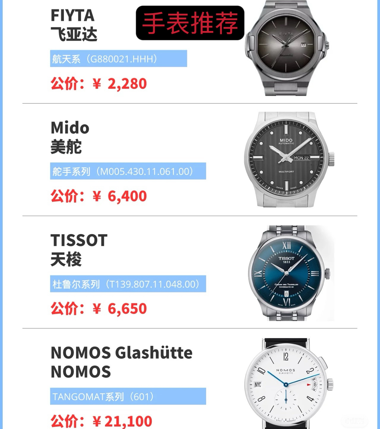 刚进入职场的男生,在选择手表时主要考虑简约、得体以及性价比。飞亚达(价格2280元)是一个选择,美度(价格6400元)适合追求精致的人,喜欢小众风格的可能会选择NOMOS(价格21100元),而对于体制内的人员来说,飞亚达可能是更常见的选择,天梭(价格6650元)也是这个阶段绕不开的品牌。