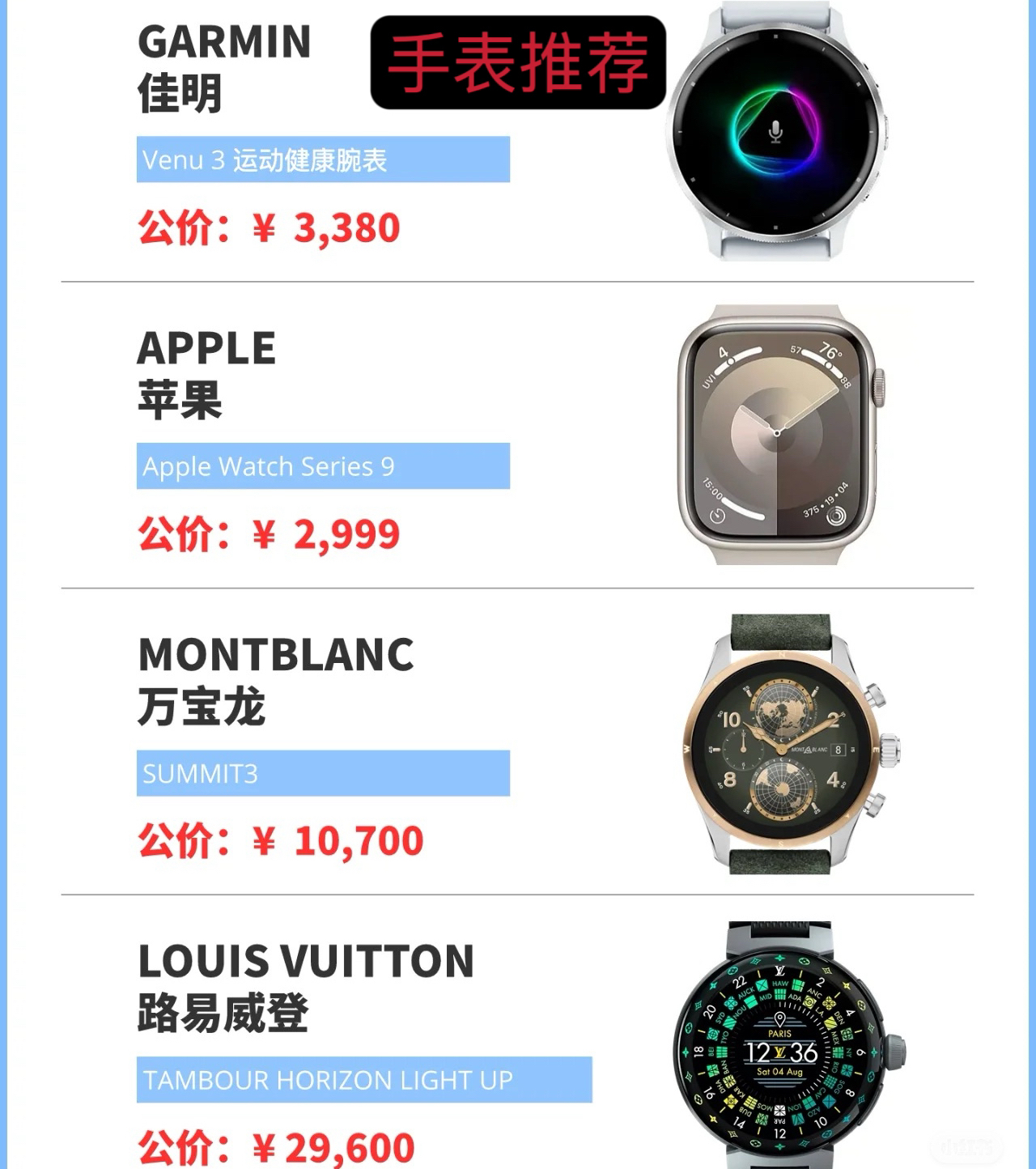 这类男生通常有健身锻炼的习惯或者户外爱好,所以智能手表是他们的首选。其中,佳明(价格3380元)和苹果(价格2999元)是常见的选择。而对于那些既想要智能手表的功能,又希望能展现自身独特品味的人来说,万宝龙(价格10700元)和LV(价格29600元)的智能手表值得考虑。