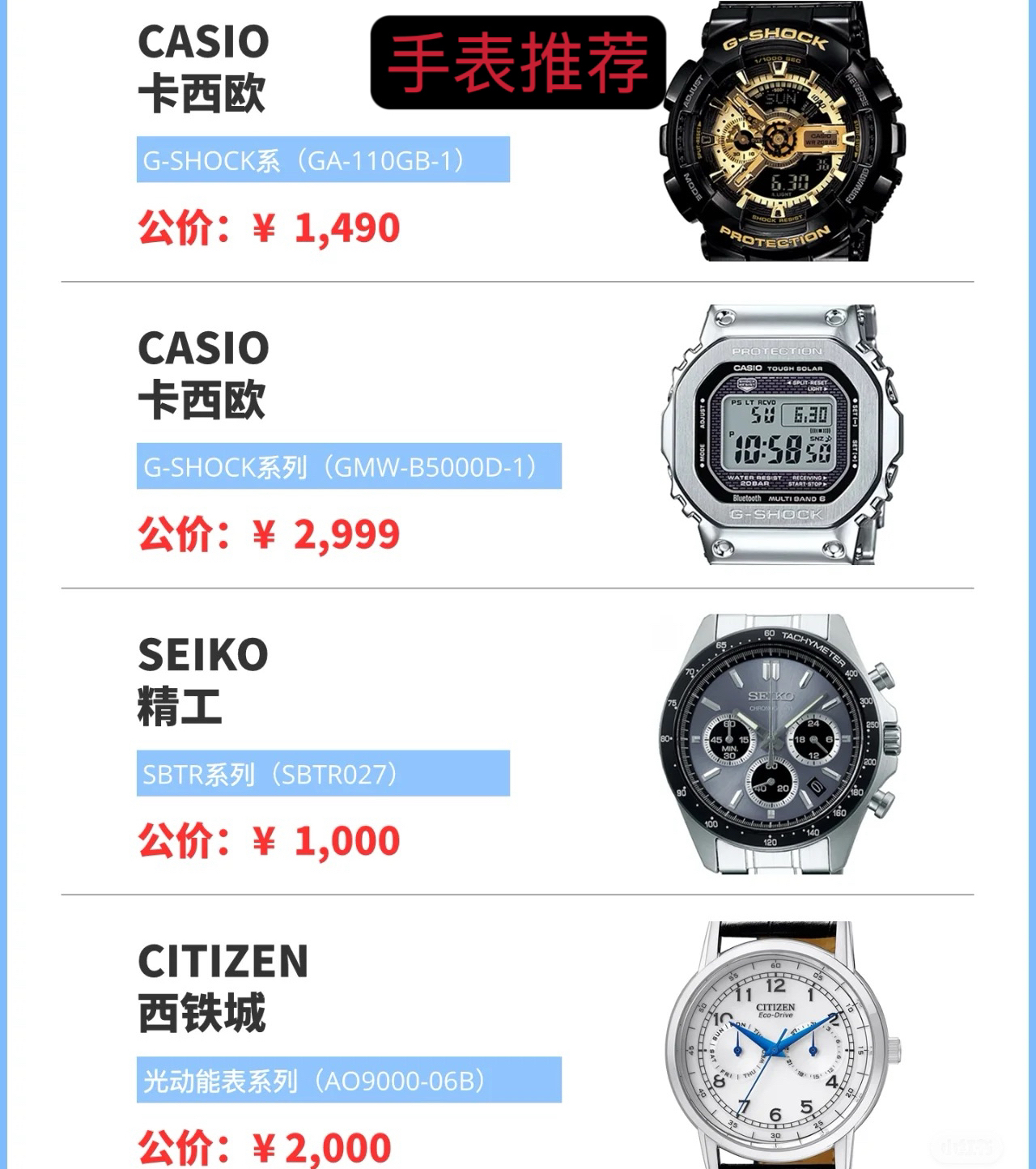 对于学生而言,卡西欧(特别是G - SHOCK系列,价格在1490元到2999元之间)是很不错的选择,其在市场上的价格往往低于公价,极具性价比。此外,精工(价格为1000元)以及西铁城(价格2000元)也深受广大男学生喜爱。