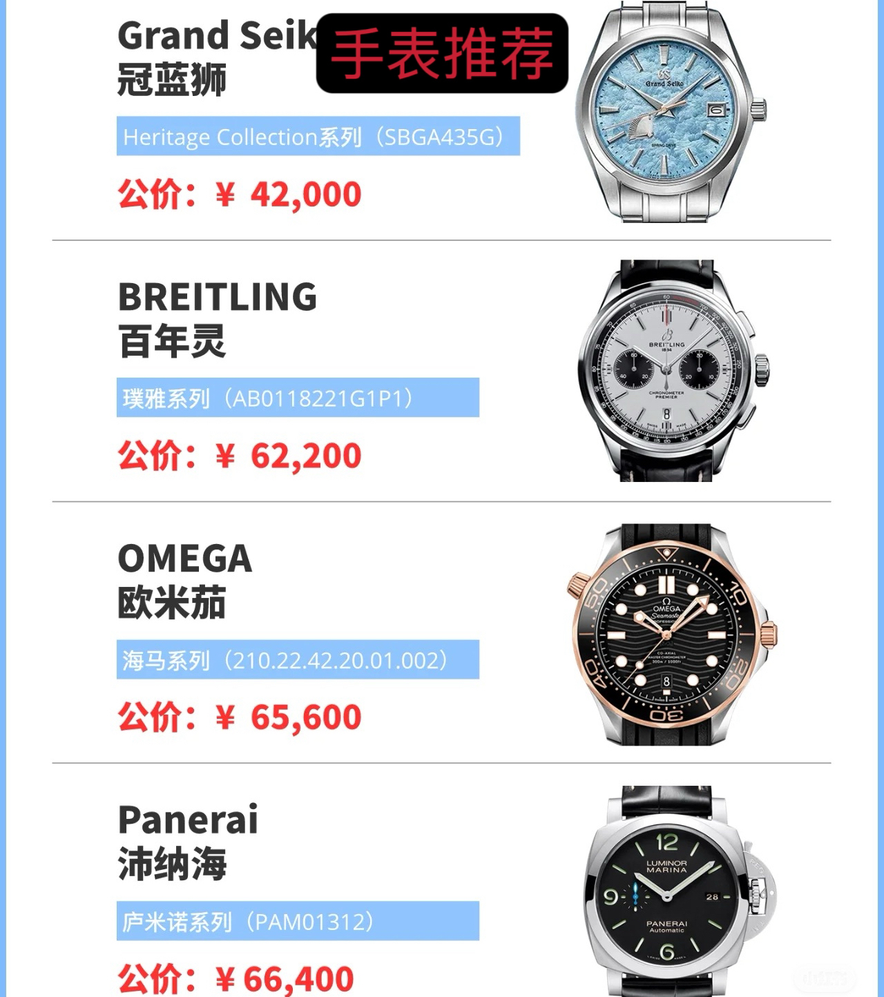 这个阶段的男性所佩戴的手表,随便一块都是大众熟知的品牌,无论是手表的质感还是品牌所蕴含的底蕴都非常出色。欧米茄(价格65600元)是较为常见的,此外,根据个人风格不同,百年灵(价格62200元)、沛纳海(66400元)以及冠蓝狮(价格42000元)等品牌也可供选择。