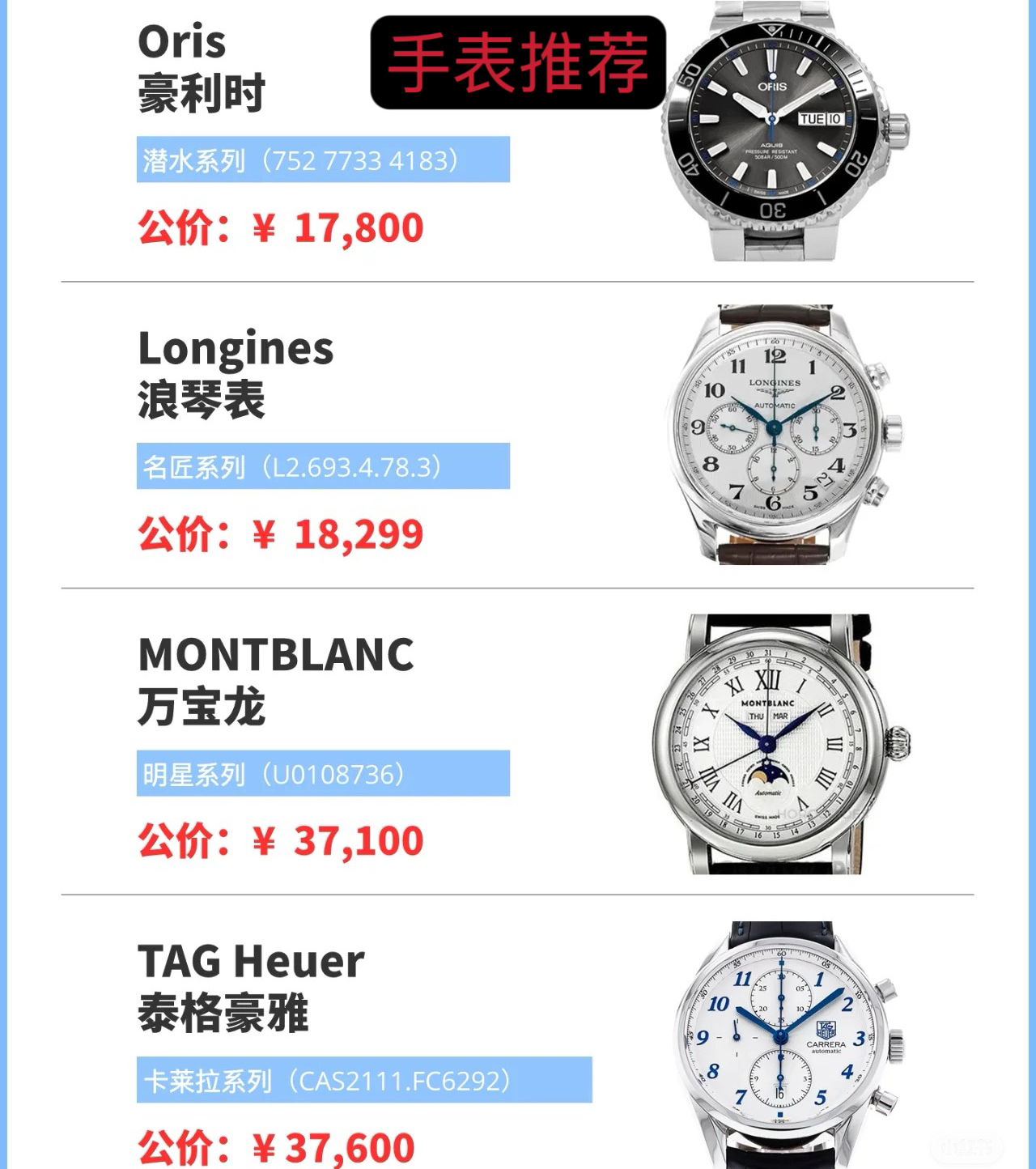 作为企业的中流砥柱,他们所佩戴的手表往往是上万元的“入门豪表”。浪琴是比较大众且常见的选择,价格在2999元到18299元之间。除此之外,泰格豪雅(价格37600元)、万宝龙(价格37100元)以及豪利时(价格17800元)等品牌也是他们会考虑的,不过要尽量避免和领导选择相同的款式。