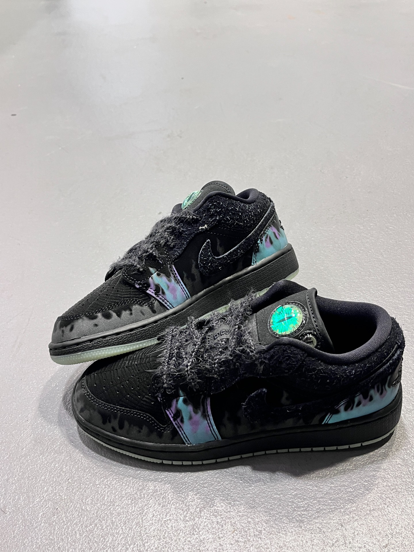 这双专门万圣节打造的AJ1 low,也是AJ这一季的重点”黑猫”系列,整体看起来非常炫酷,从外到内都呈现出万圣节的搞怪气息,从外观上来看,鞋面有一种蜊蛛网状设计感,鞋带的样子则是像极了蜊蛛的腿,鞋舌上的“眼睛”发光,很像晚上灯光照到猫的眼睛的视觉感受,并且可以手动发光,白天可以关上,晚上打开,贼酷炫.很很期待吧.