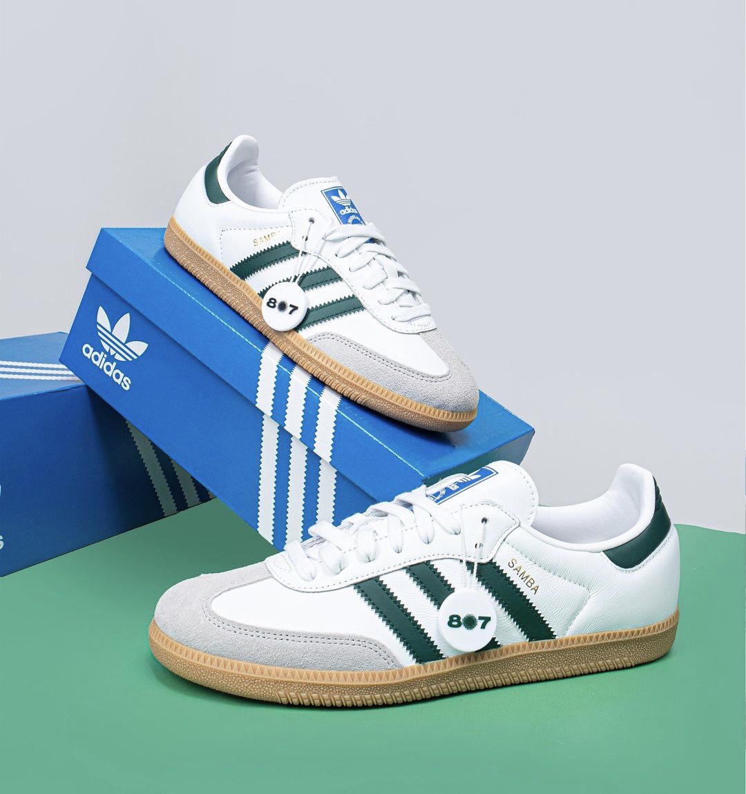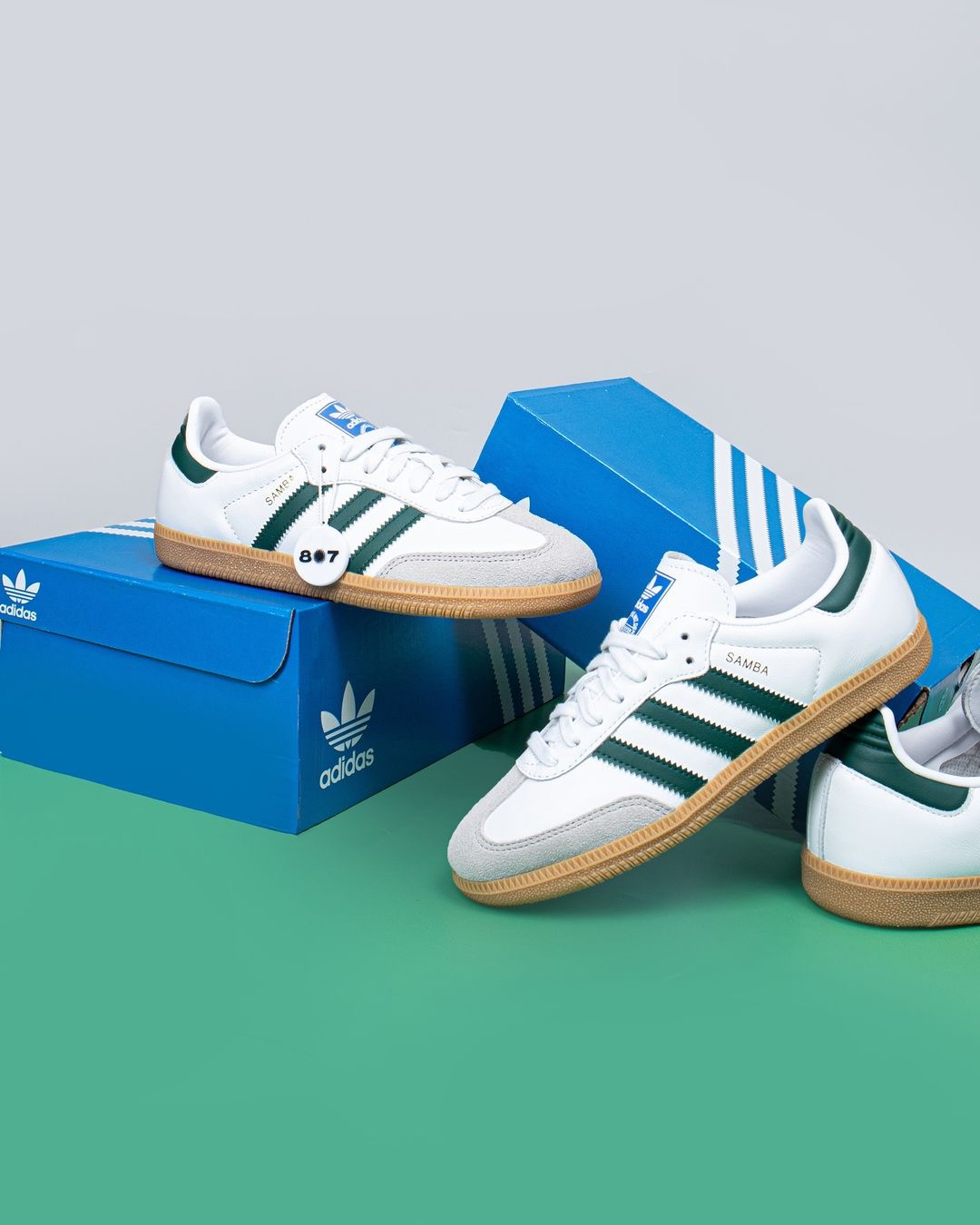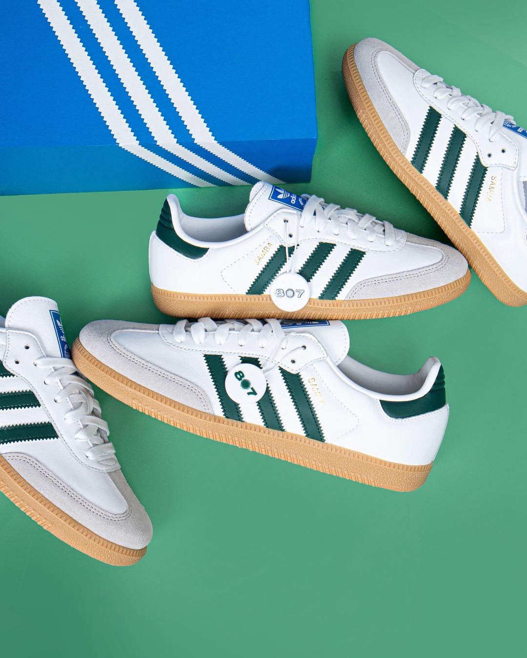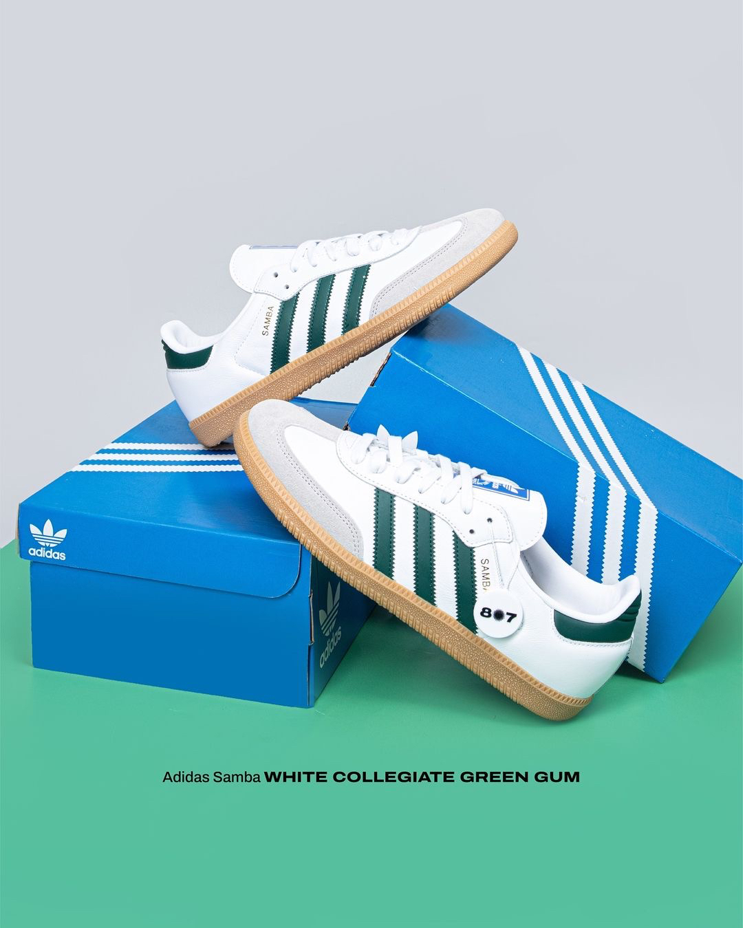 Adidas Samba白色学院绿胶滑动! 阿迪达斯发布了Collegiate Green。白色底座和迷人的绿色轮廓,每一步都呈现经典而大胆的外观。你现在必 须处理这个罕见的色彩设计