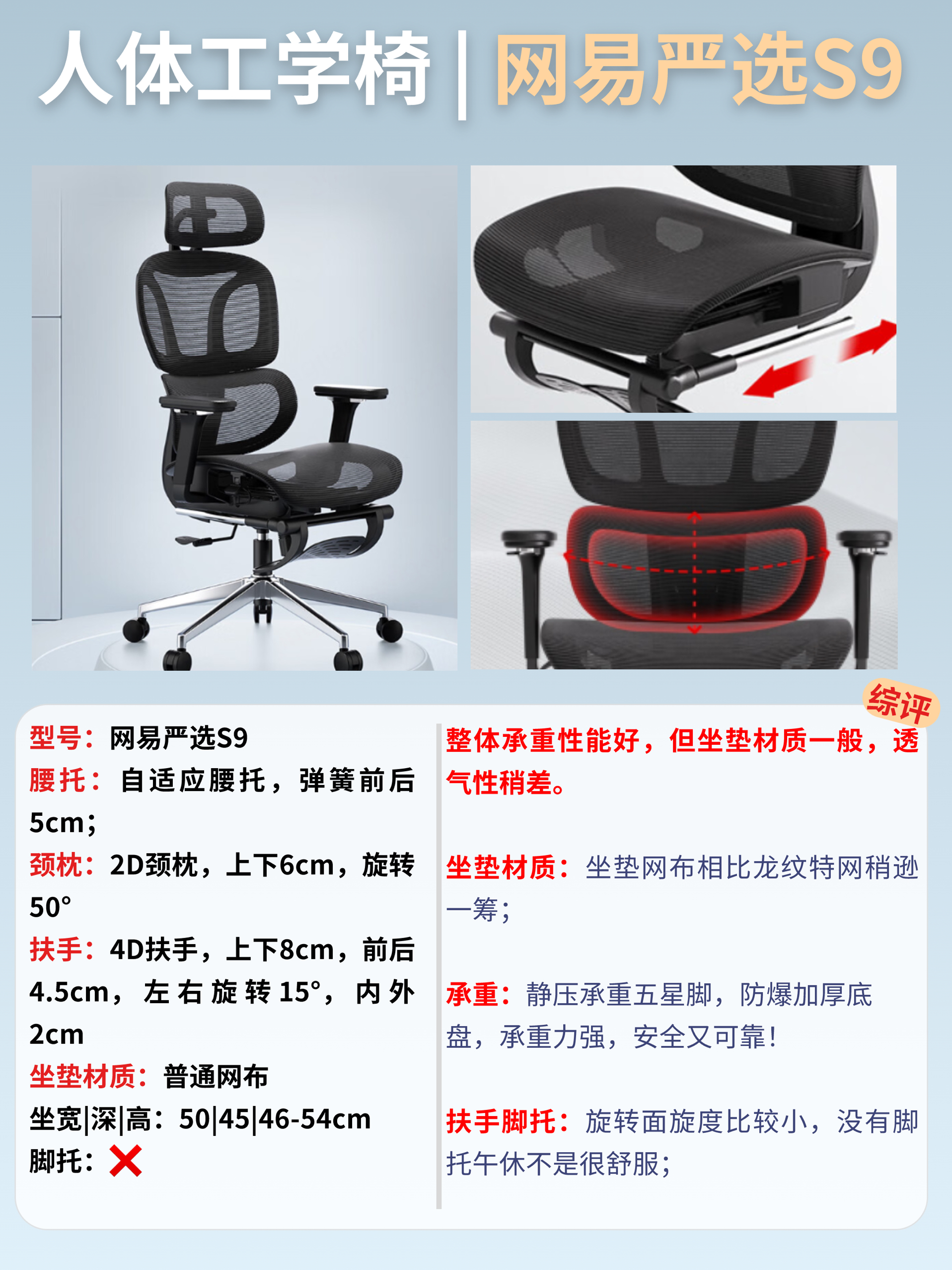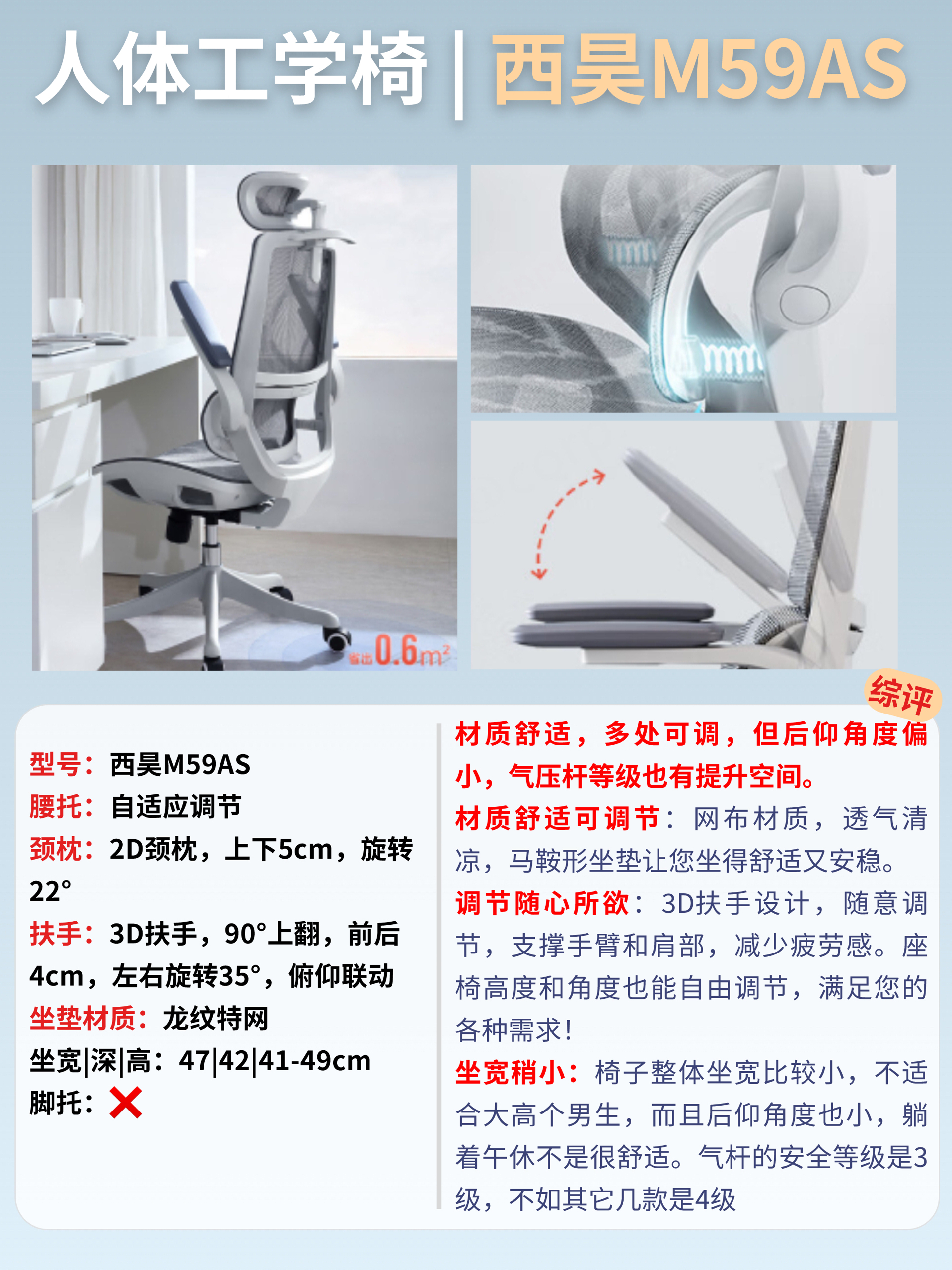 材质舒适,多处可调,但后仰角度偏小,气压杆等级也有提升空间。
