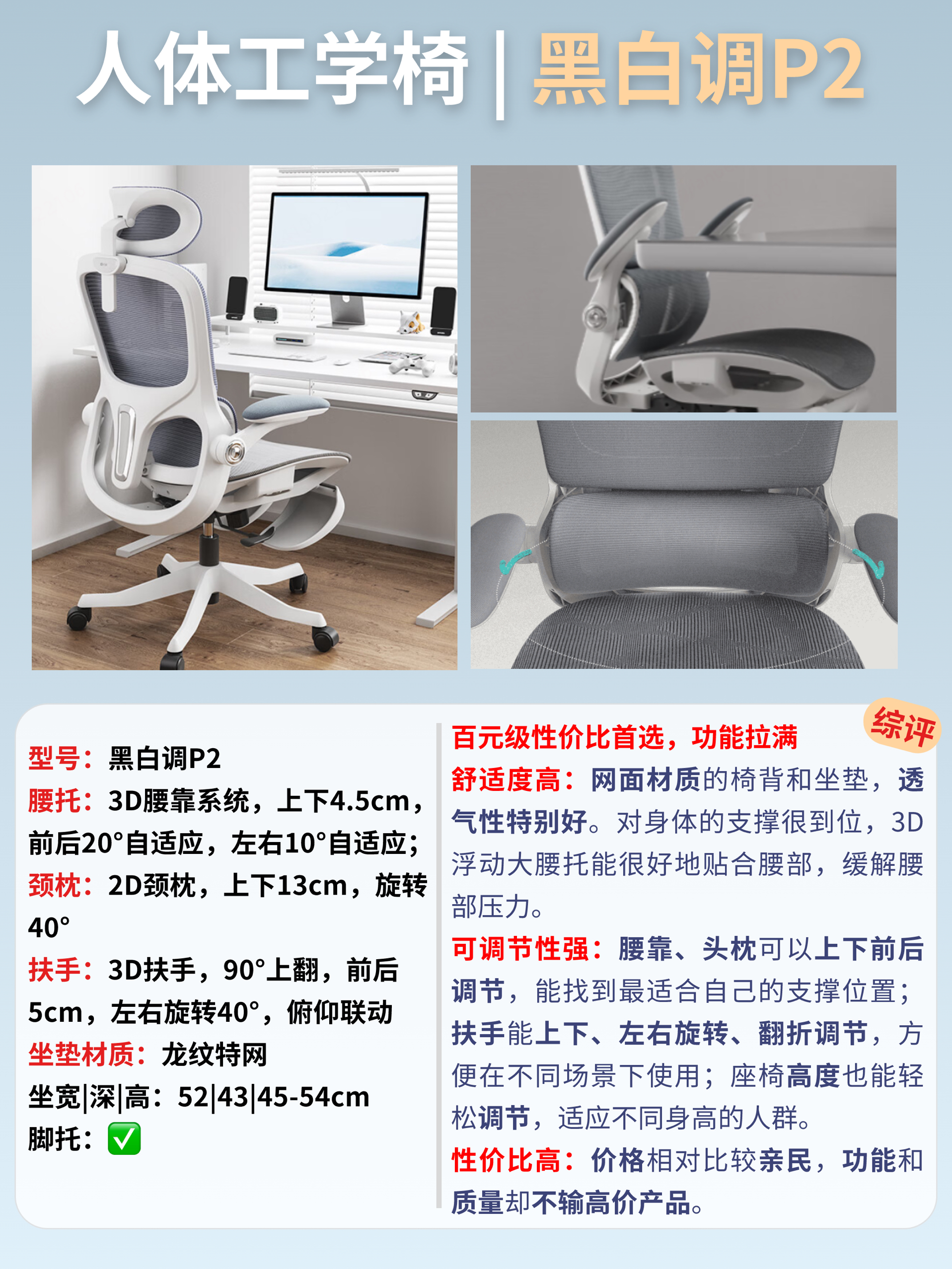 舒适度高:网面材质的椅背和坐垫,透气性特别好。对身体的支撑很到位,3D浮动大腰托能自适应贴合腰部,缓解腰部压力。