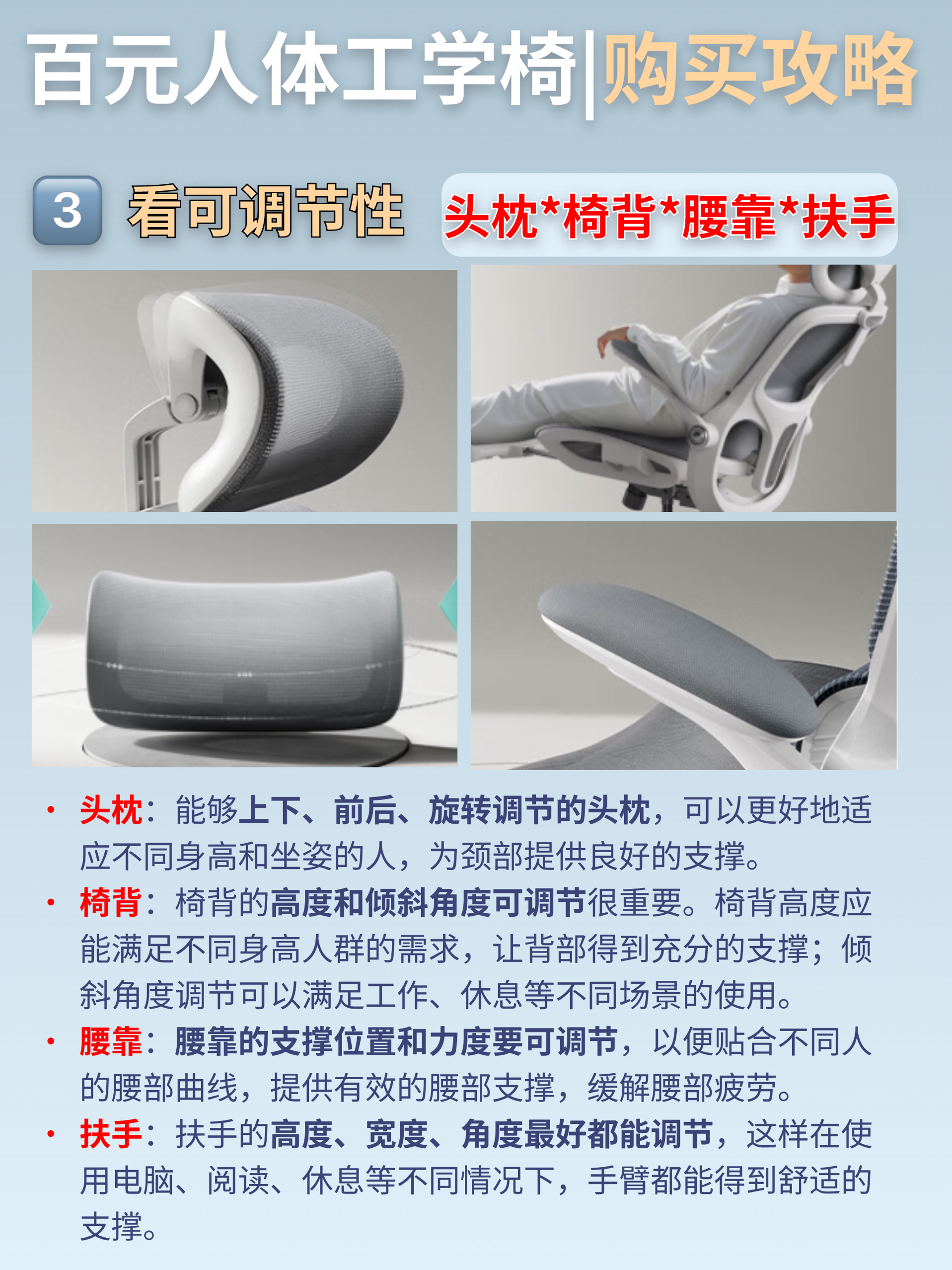 头枕、腰背靠:腰背分离设计,贴合人体曲线,给腰部恰到好处的支撑。头枕还能上下、旋转调节,后仰休息时也能享受舒适!