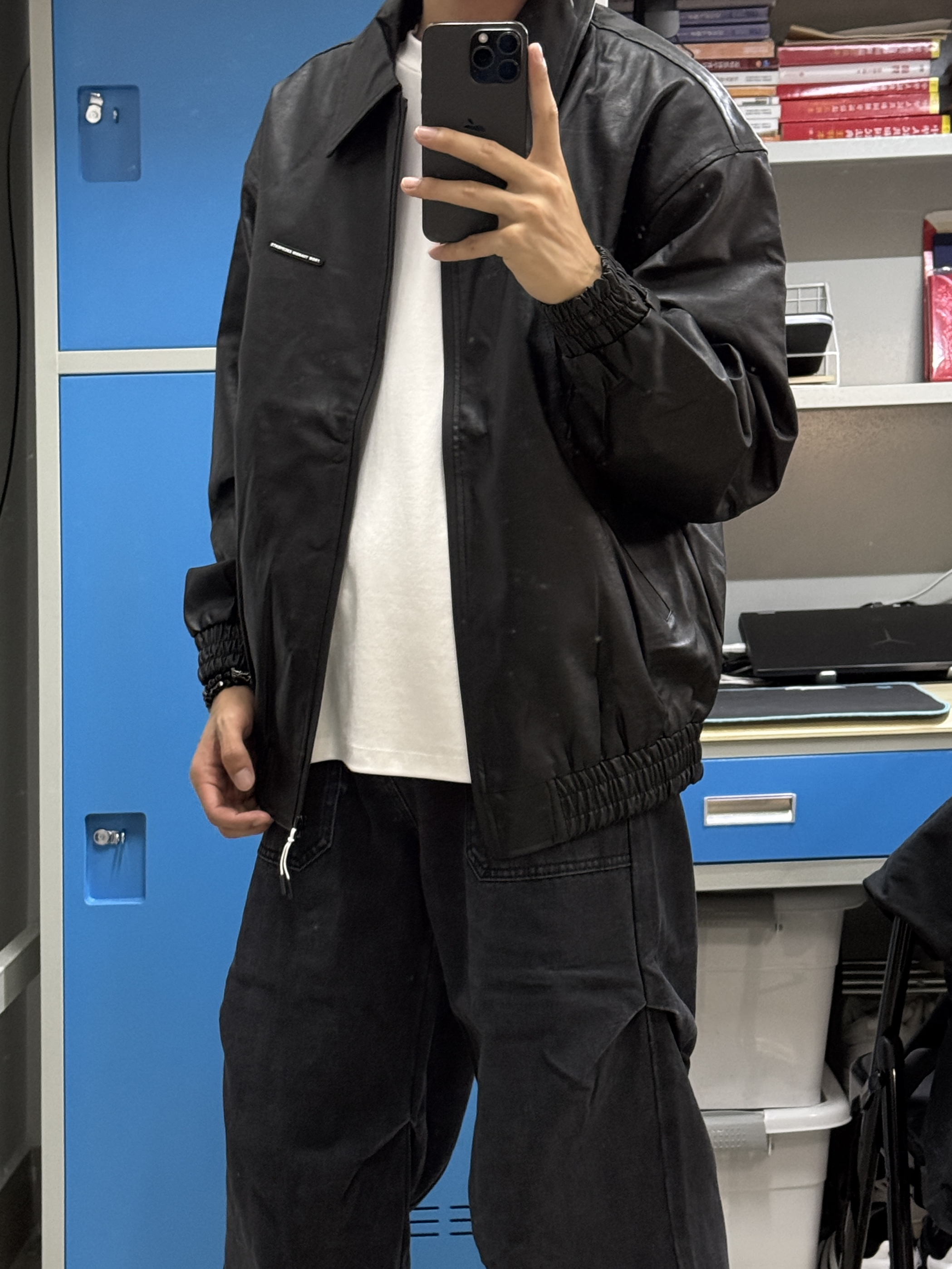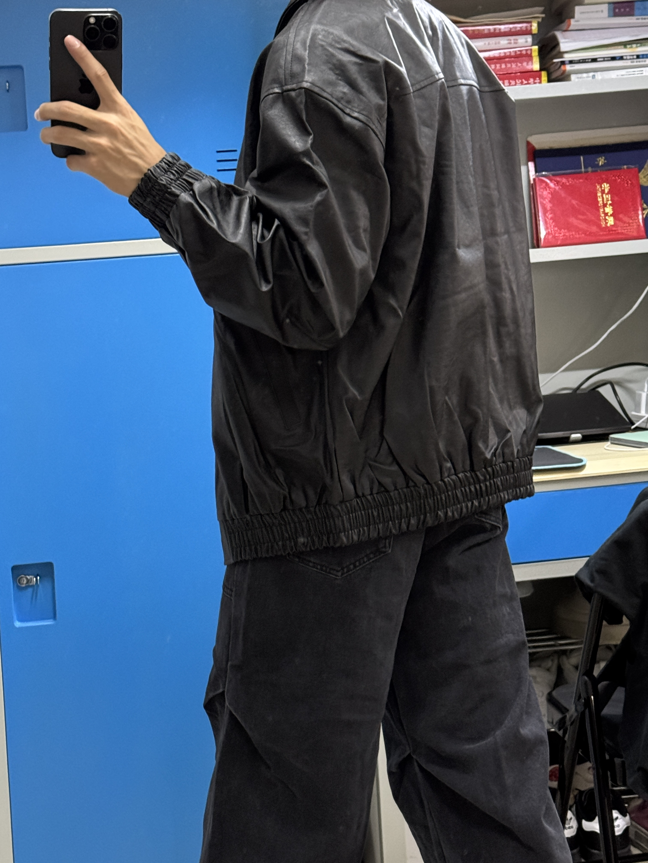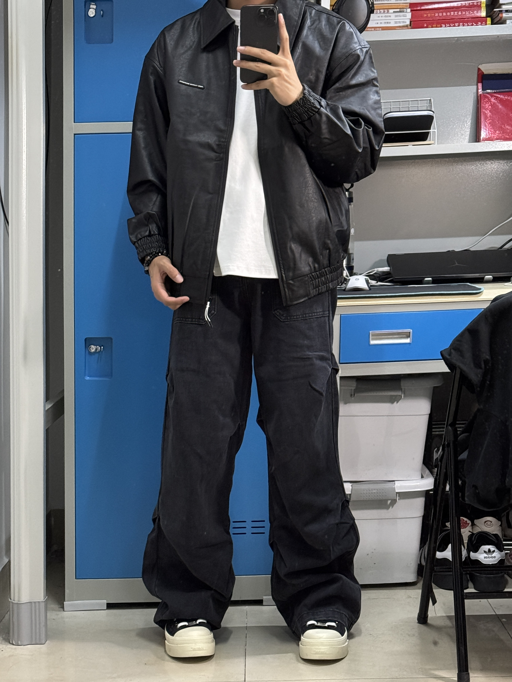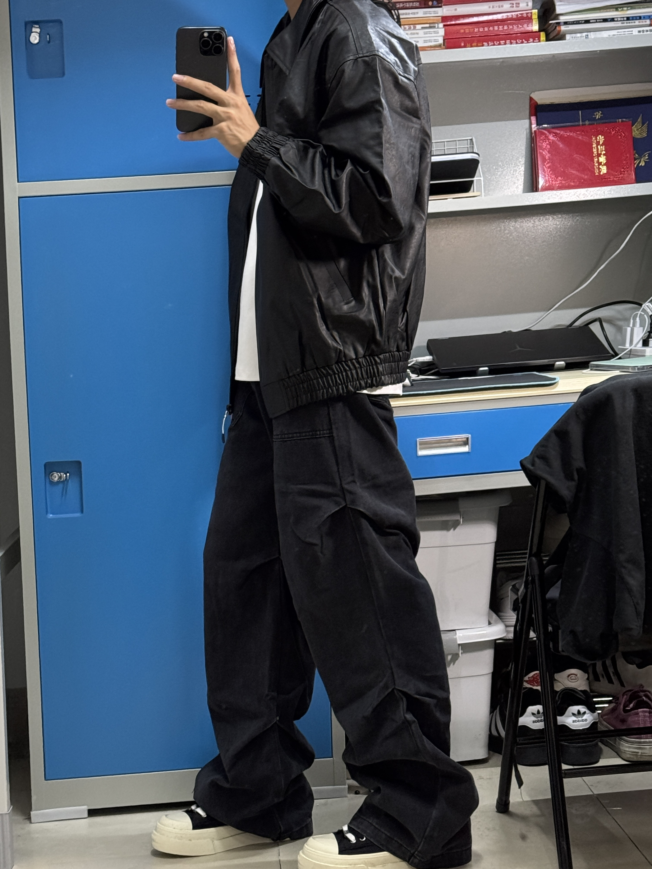 衣服 皮衣夹克 最近迷上了皮衣外套,皮衣外套对于我这种黑黄皮肤的男孩子来说很友好,上身百搭有型,这款皮衣风格偏宽松休闲,很适合早秋穿搭。 裤子 做旧工装牛仔裤 宽松褶皱的版型设计每个人都能轻松驾驭好吧,慵懒休闲风,有层次感。