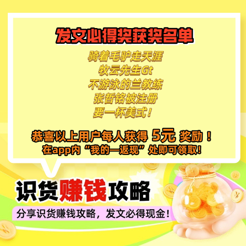 🎉截至目前识货赚钱攻略第三阶段已圆满结束,感谢大家的热情参与! 👏恭喜以上5名创作者获得活动发文必得奖5元! 💰【领取方式】在app内"我的—返现“处领取奖励即可!奖金会在3个工作日内到账~ 注:发文必得奖每人可获得一次,本期没有最佳分享奖产生。存在非原创、抄袭、不贴合主题等现象的帖子以及有违规行为的用户不计入获奖结果。 🔥识货赚钱攻略活动仍在火热进行中! 快来分享你的识货赚钱攻略吧!