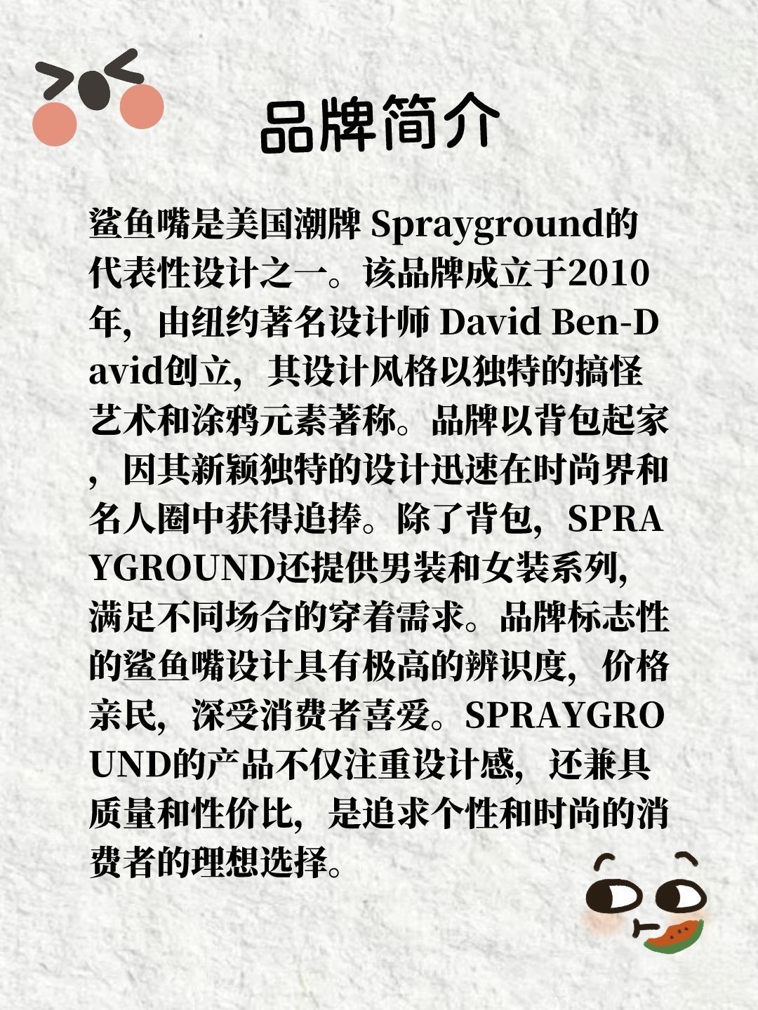 鲨鱼嘴是一个美国纽约的潮流品牌,由设计师David Ben David创立。品牌以其标志性的鲨鱼嘴涂鸦背包而闻名,具有很高的辨识度。Sprayground的产品设计充满新奇元素,如翅膀和星空图案,非常受潮流人士的喜爱。该品牌于2019年进入中国市场,产品均在意大利制造,并且公司直接控制产品制造的每个环节。
