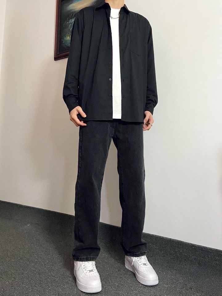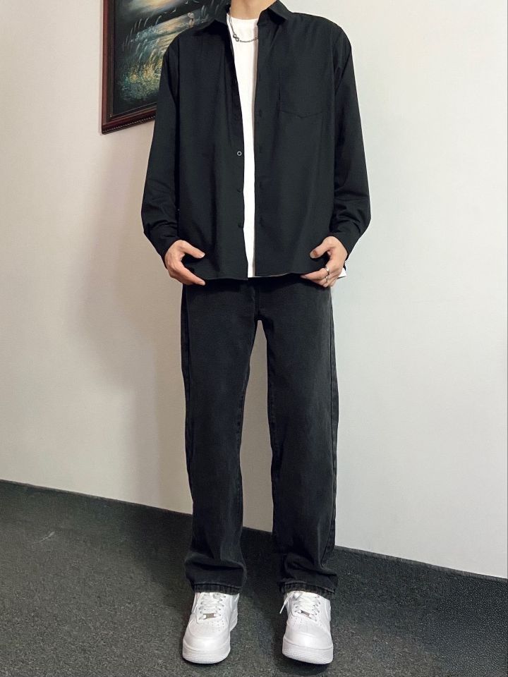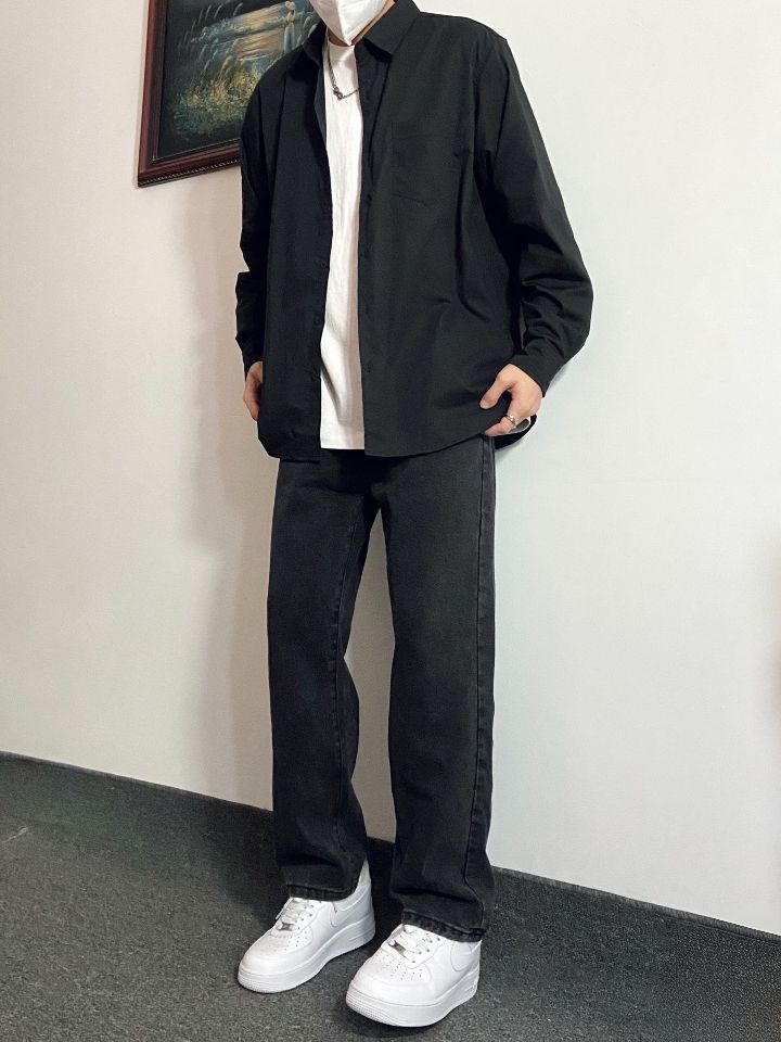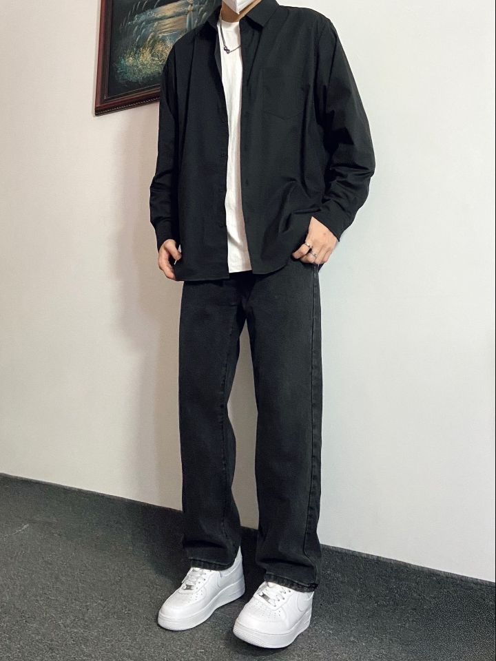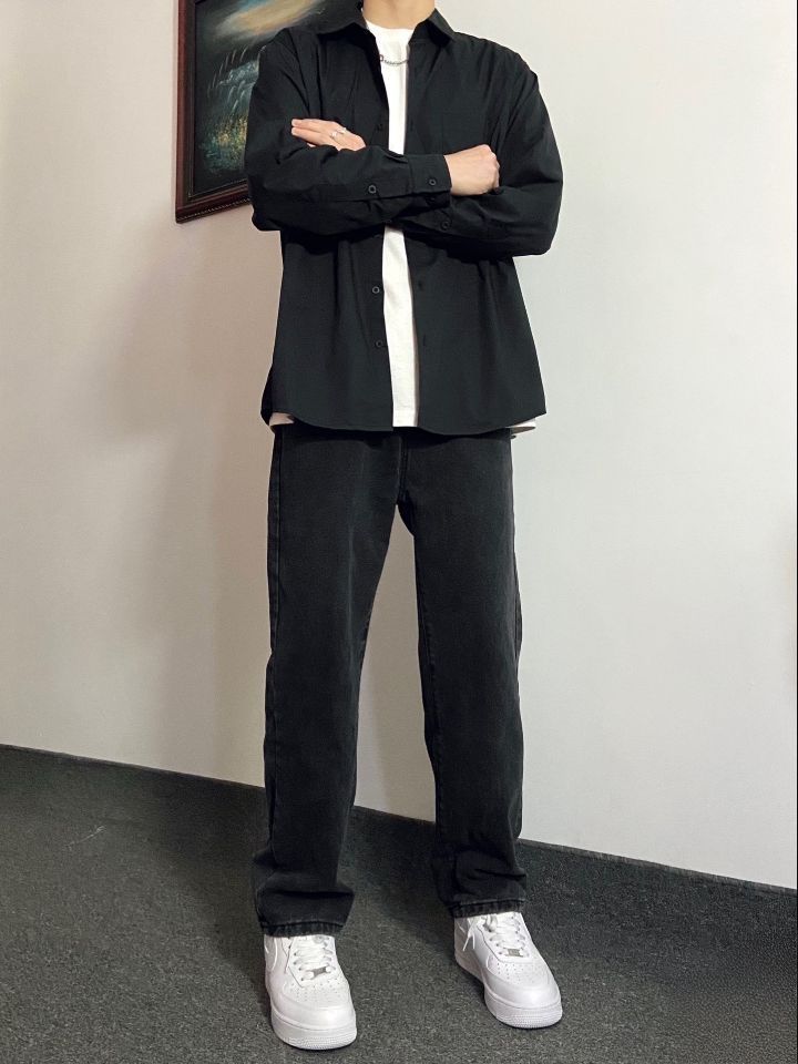 裤子选择了宽松直筒版型的黑色水洗牛仔裤 转季节气候多变,一件薄款黑色衬衫就能很 好适应抖 薄款面料上身透气清凉,修身版型上身显 穿起来简约大方,氛围感十足# 搭配上这件水洗做旧牛仔裤,直筒版型上身 不会臃肿 一整套下来再搭配上一双干净百搭的空军