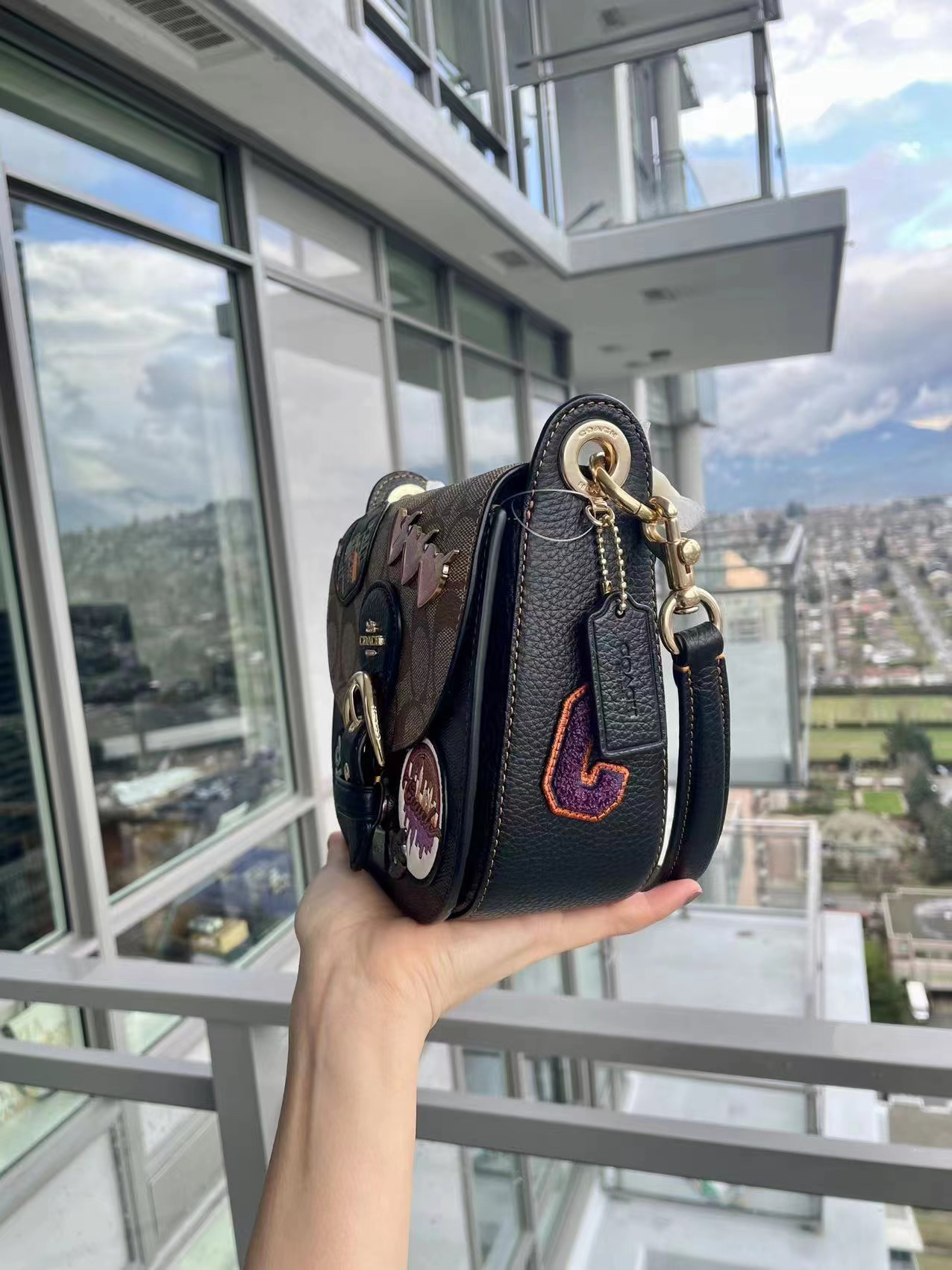 Coach蔻驰 情人节限量款徽章马鞍包 有两根肩带 可以腋下也可以斜挎单肩 特别实用😘 黑色老花搭配卡其色老花 特别好看经典 永远不过时的配色特别耐磨耐用🥰 经典老花搭配徽章 真的好好看哦三个小爱心和猫咪标志都是金属的特别有质感侧面还有个C字标志细节设计真的太绝绝子了😍 肩带有两根 一根短肩带 荔枝纹牛皮材质 可以手提单肩腋下背 还有一根彩虹肩带 可以单肩斜挎 一包多用😙 内部空间特别大可以装下任...