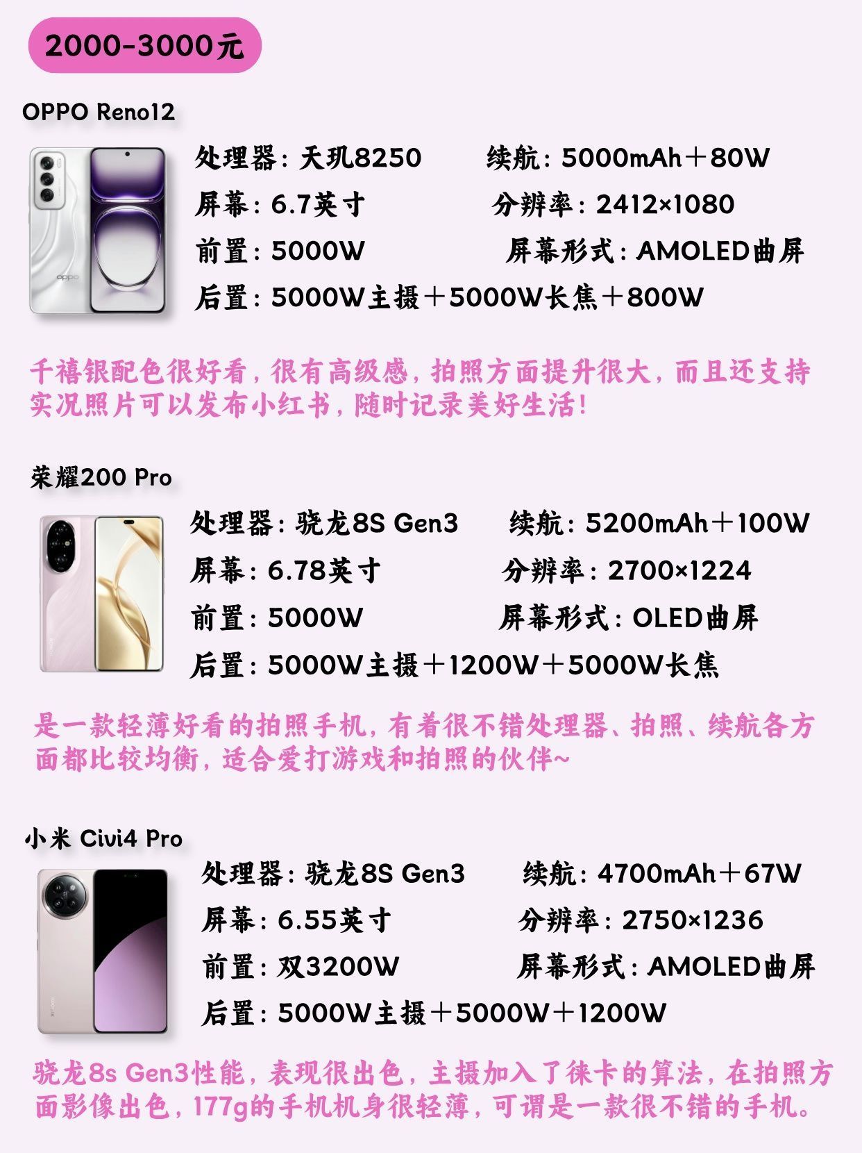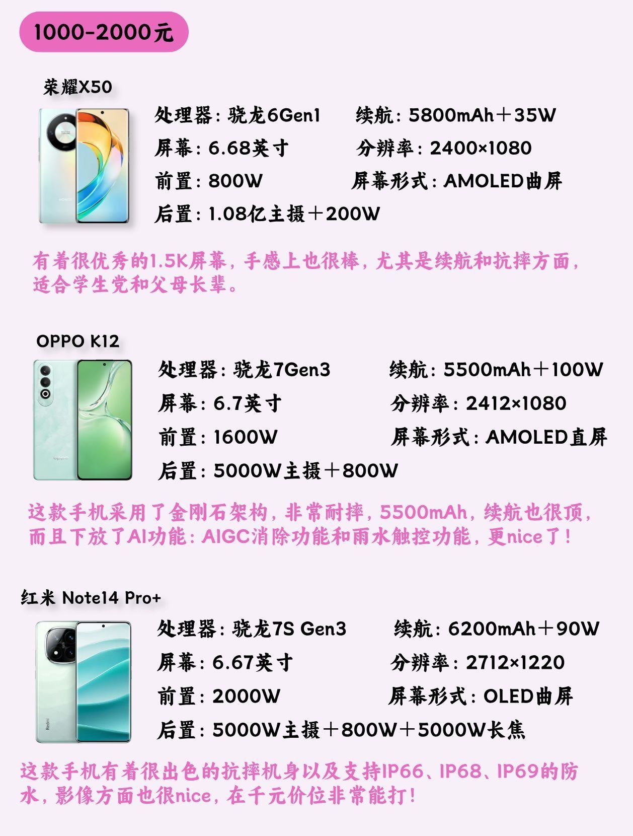 本篇笔记关联了HONOR/荣耀 X50 5G 手机 全网通 抗跌 曲屏 大电池 超耐久 护眼 长续航 主摄 超清 拍照 耐摔 典雅黑、MI/小米 14 5G 手机 徕卡镜头 长焦 直屏 全网通 护眼 汽车互联 白色、OPPO Reno12 Pro 5G 手机 旗舰芯片 星速版 超美小直屏 实况照片 拍照 大电池 防水 全网通 天玑旗舰芯 闪充 双模 银幻紫等商品,为用户提供真实的使用体验和购买参考。