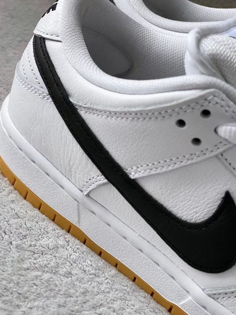 越简单,越高级。 dunk SB白生胶,这款鞋子简直就是穿搭神鞋 啊!全鞋身采用头层牛皮,并且皮子的纹路比 较清晰,让整体质感提升了不少,同时皮子柔 软细腻。 两侧黑色钩子十白色中底十黄色生胶大底, 让整双鞋显的简约但又不简单,给人一种非常 干净清爽的感觉。 两侧黑色牛皮革的钩子,同时鞋舌以及后跟同样用黑色刺绣logo点缀,让鞋子整体配色不会那么单调。 因为厚鞋舌,尺码建议大半码购买,上脚更舒 服...