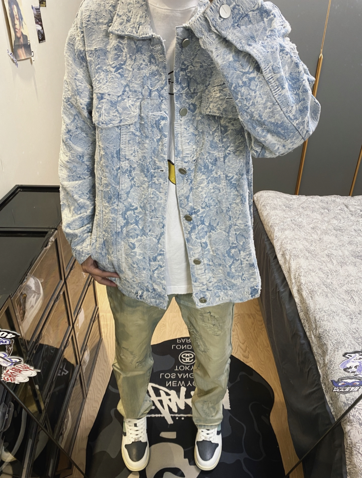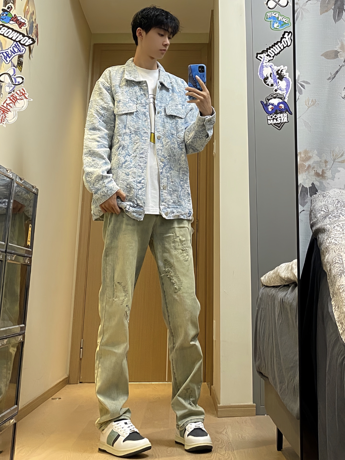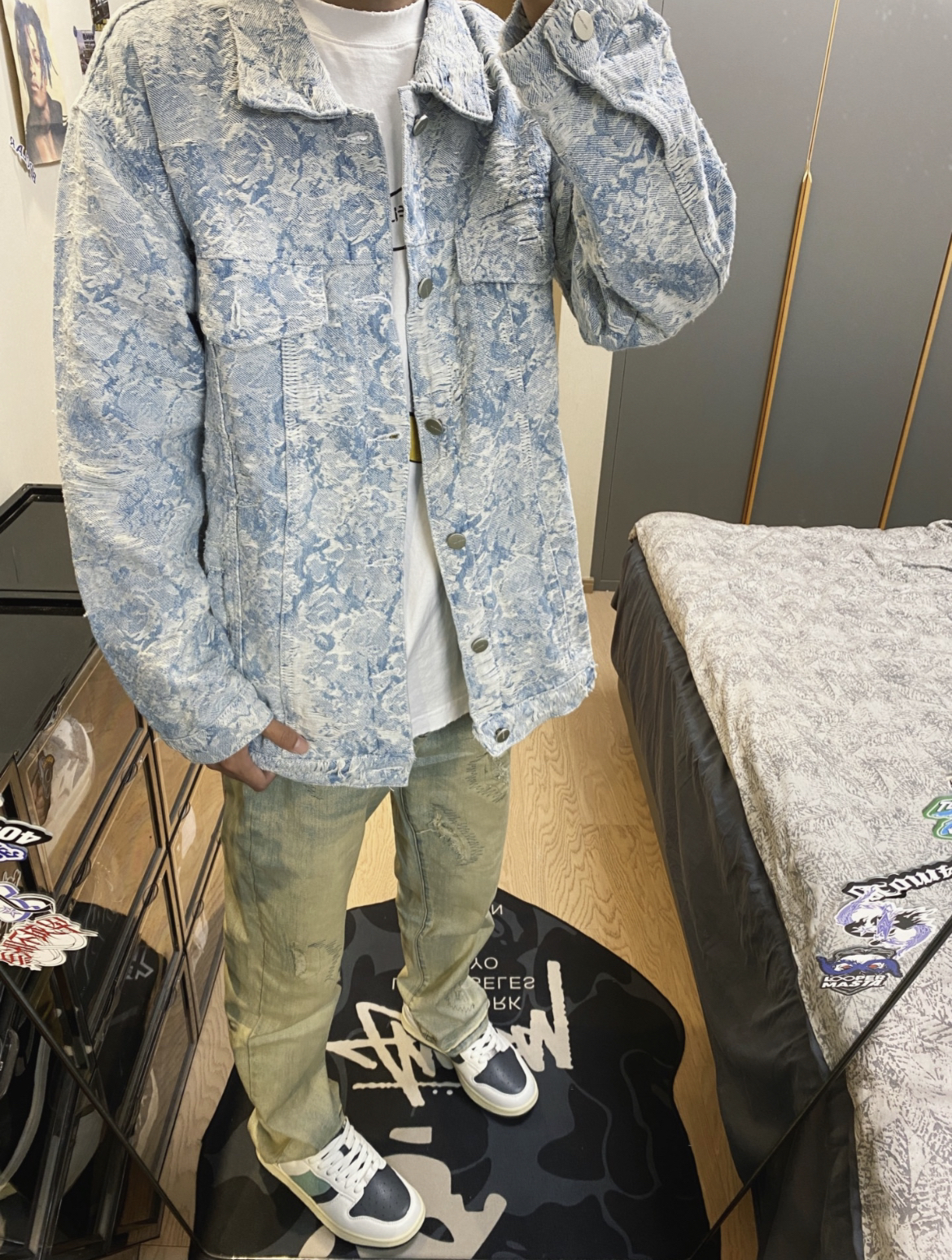 穿搭分享👋🏻 这款雪花飘零满印刺绣夹克真的太帅了~ 搭配一件做旧水洗的牛仔裤,这一身日常通勤简约百搭的一身就很帅气!