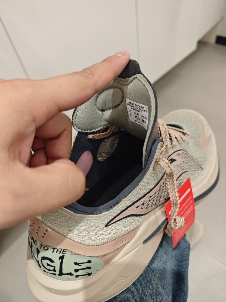 👆🏻这个配色还算是挺好看的,颜色纯度低,线条流畅,比踏子那些童鞋配色强多了 👇🏻But!不合脚~还是退了,卡小脚趾走路都不舒服 ✘鞋型偏瘦长,我平常Nike42,这个长了1个码,宽度有点儿卡小脚趾 ✘鞋舌跟猪耳朵一样~脚穿进去~在脚背外面耷拉着 ✔鞋底纹路很深,硬度适中,耐磨防滑应该是可以的 ✔没有内扣,之前买过一双全城11v2,左脚很合脚,右脚内扣!天王老子来了它也内扣!我说的!这双左右脚都没有...