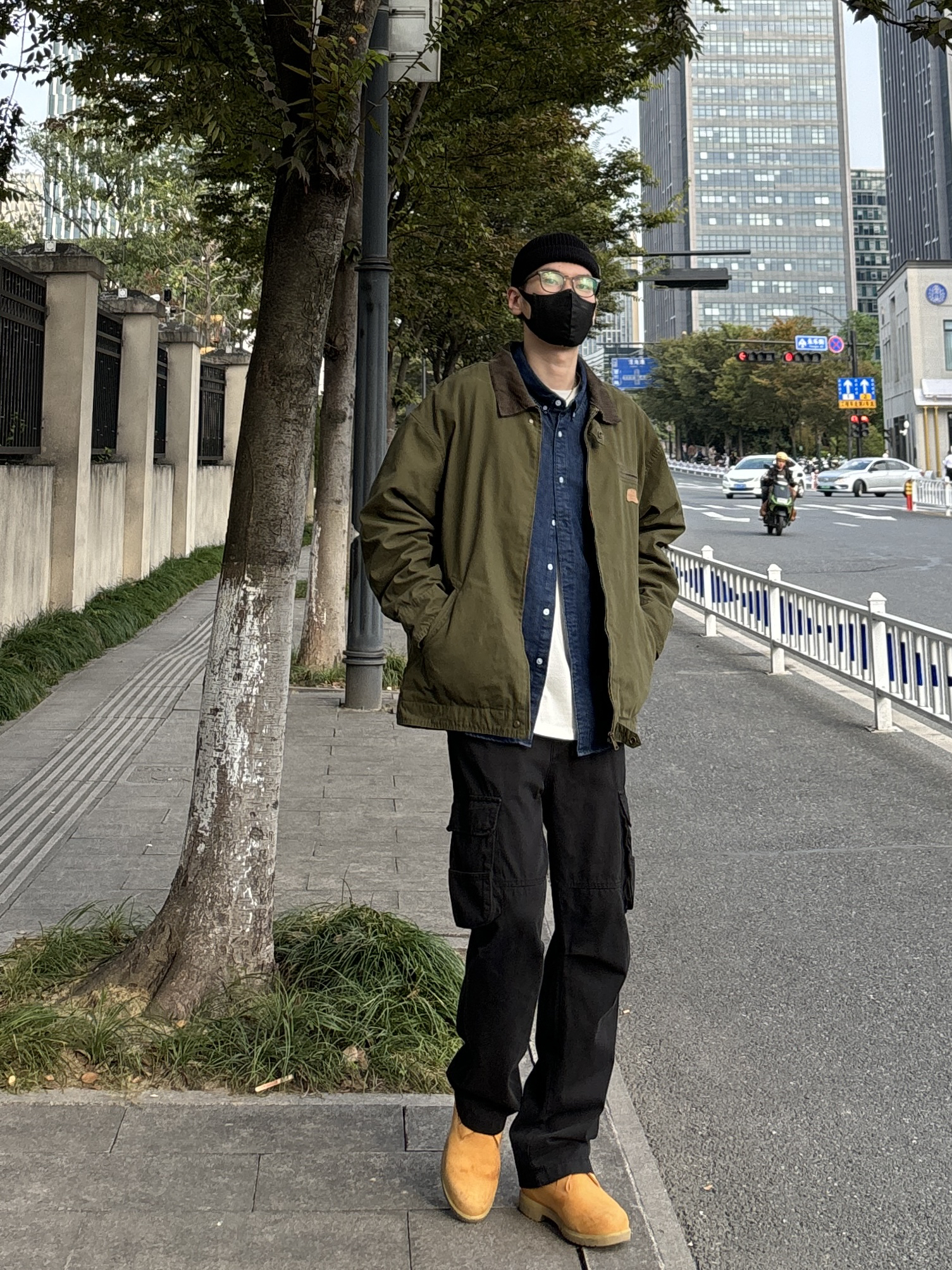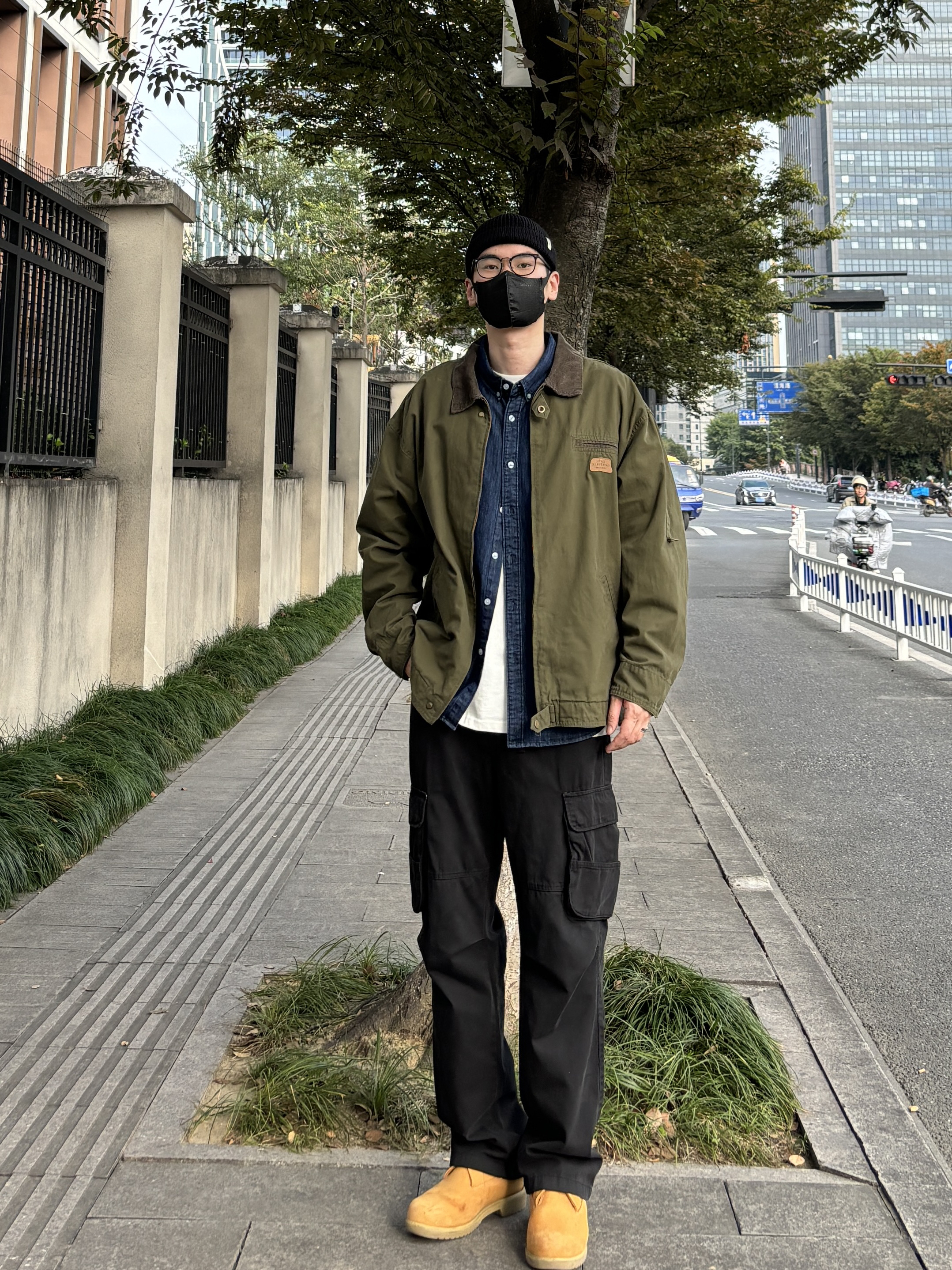 今天这套先用深蓝色重磅牛仔衬衫做内搭 ⬇️ 裤子选择简约百搭的黑色直筒水洗做旧多口袋工装裤 ⬇️ 鞋子上脚硬汉必备的timberland工装靴 ⬇️ 接着套上军绿色宽松阔版复古翻领工装夹克 ⬇️ 最后戴一顶线帽呼应下裤子的颜色 - 今日搭配 衣服裤子:NICE LILI 鞋子:timberland