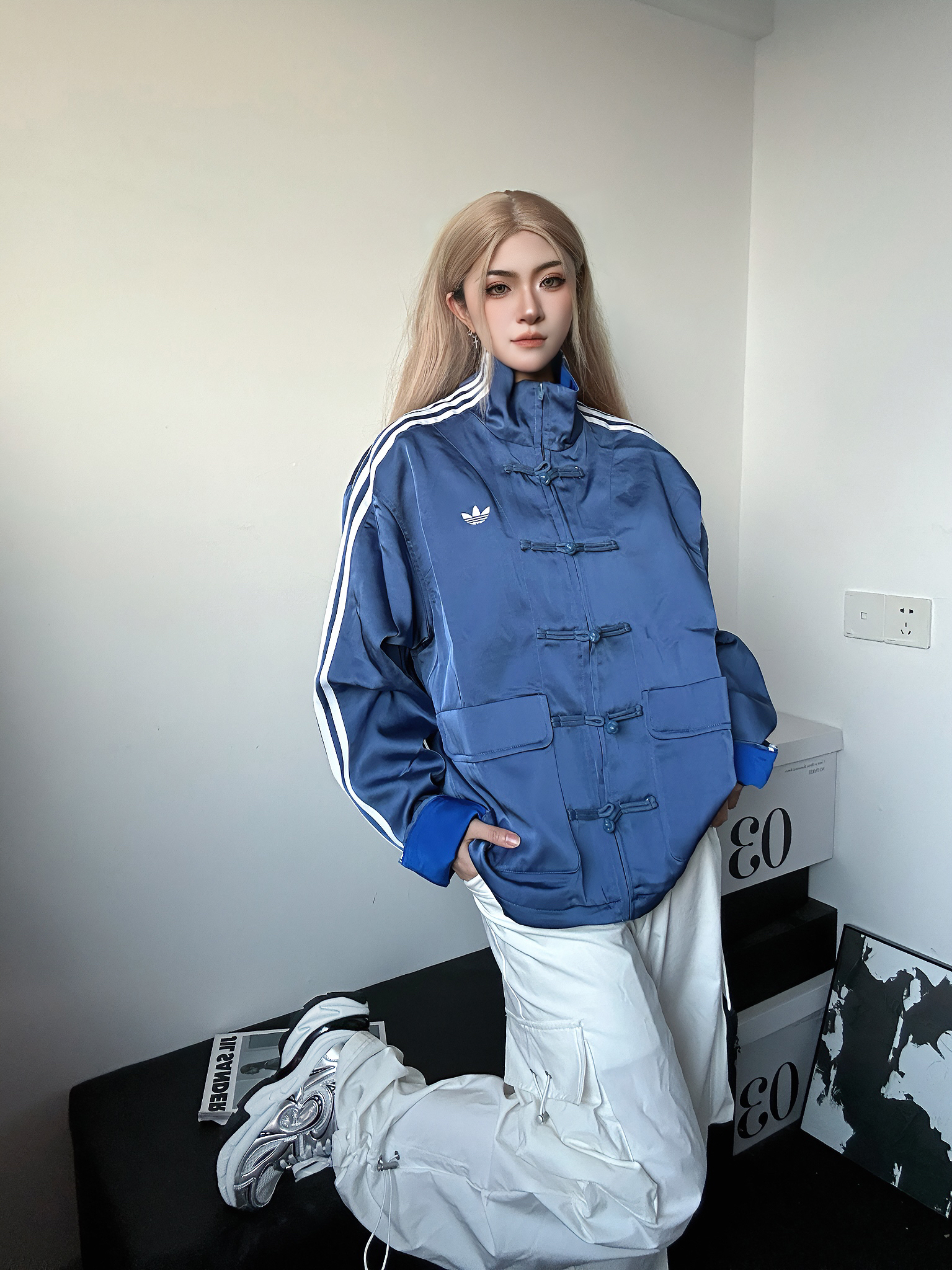 今日穿搭分享 上身蓝色盘扣外套来自阿迪 很火的新中式设计 运动风和新中式的结合竟然也不违和 别有一番风味 这个雾霾蓝的配色也是很高级 搭配白色束脚工装裤 增加一丝休闲风 鞋子是来自贝莲雅的老爹鞋 厚底增高 银灰配色 百搭不挑人哦