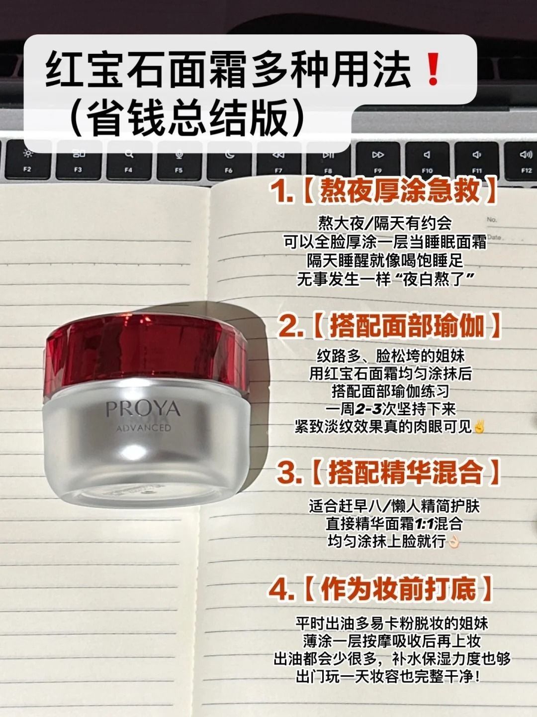 分享几个超好用的面霜用法 姐妹们快去试试吧!!! 1️⃣熬夜厚涂急救 厚厚涂一层当睡眠面霜用, 隔天睡醒皮肤像瞒着我偷偷补觉了一样, 摸起来软软弹弹的很有光泽, 有种“夜白熬了”的精神感! 2️⃣搭配面部瑜伽 用红宝石面霜均匀涂抹后(记得带到脖子!) 搭配面部瑜伽练习,一周做个2-3次 只要配合着简单的提拉按摩手法 紧致淡纹效果真的肉眼可见 3️⃣搭配精华使用 直接精华面霜1:1混合 均匀涂抹上脸...