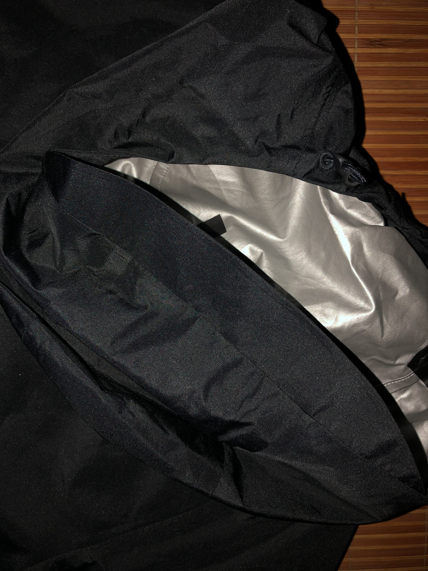 配色以黑色为主,灰色点缀,细节很多,右手臂,衣服背后右下角,以及胸口的标都有3m反光。在帽子后有便于通风透气的孔,在背后腋下后也有。帽子处帽檐特意加了硬度略大于衣服材质的面料,保证帽子形状,同时帽子也有松紧带调节。在衣服下方内侧也有松紧带。胸口有个扣子,保证不拉拉链时的稳定。 但要注意的是整个衣服只有胸口有包,两侧没有包,胸口那个包可以折叠衣服收纳