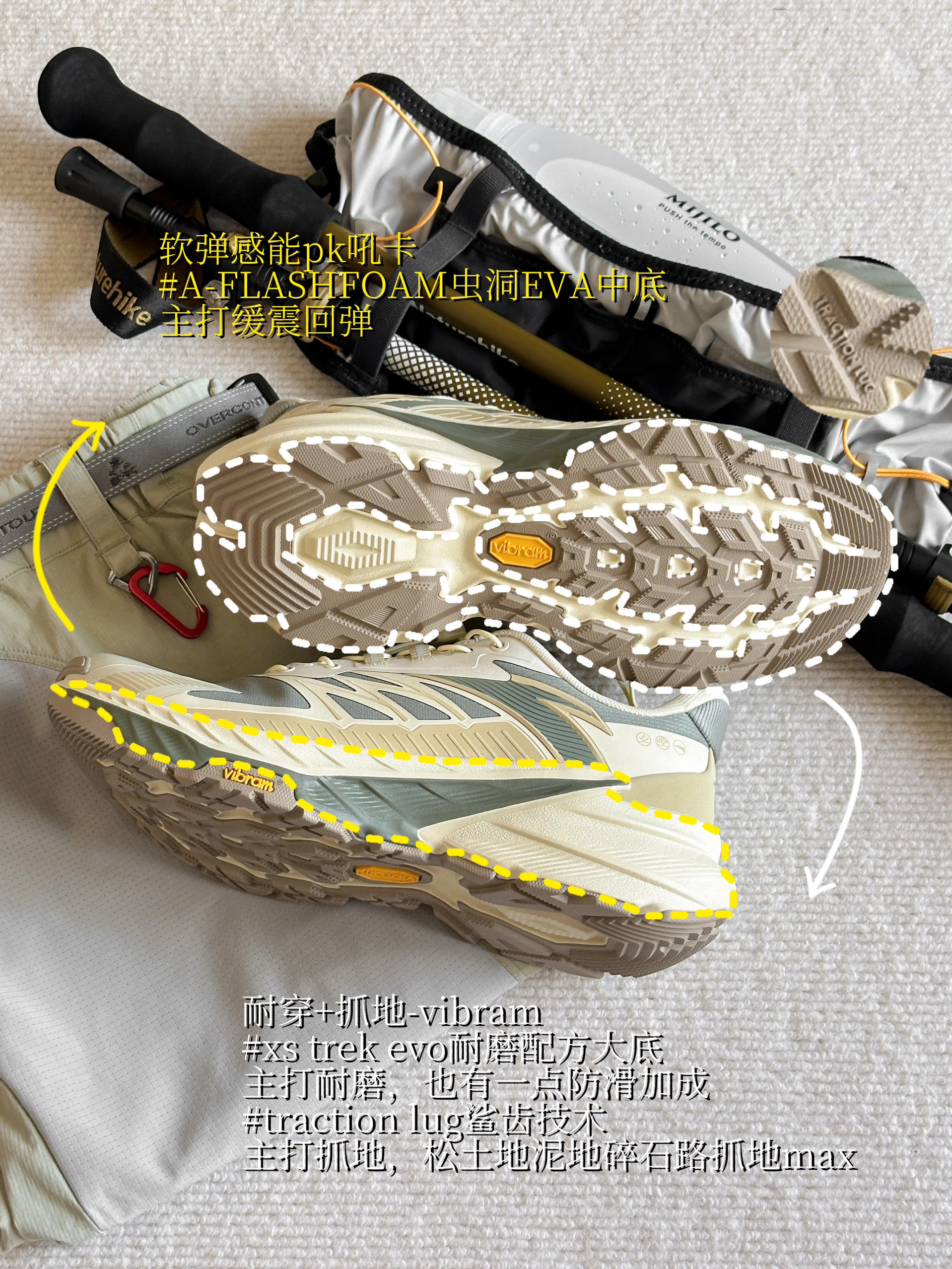 上次分享过这款4个配色 素锦绿真的绝好看! 但颜值点到为止 我讲过探系列脚感能pk吼卡 今天详细讲讲探野2代到底怎么样 - 还是缓震型的踏子自研虫洞中底 软弹感没的说就是能打吼卡 不信可以试试 从防风加密网布升级到pro的防水鞋面 重点重点! 鞋底升级成vibram的xs trek evo耐磨大底 这个型号大底主打耐磨 同时有止滑性能 叠加的traction lug鲨齿主打抓地 在松软土地、泥地、...