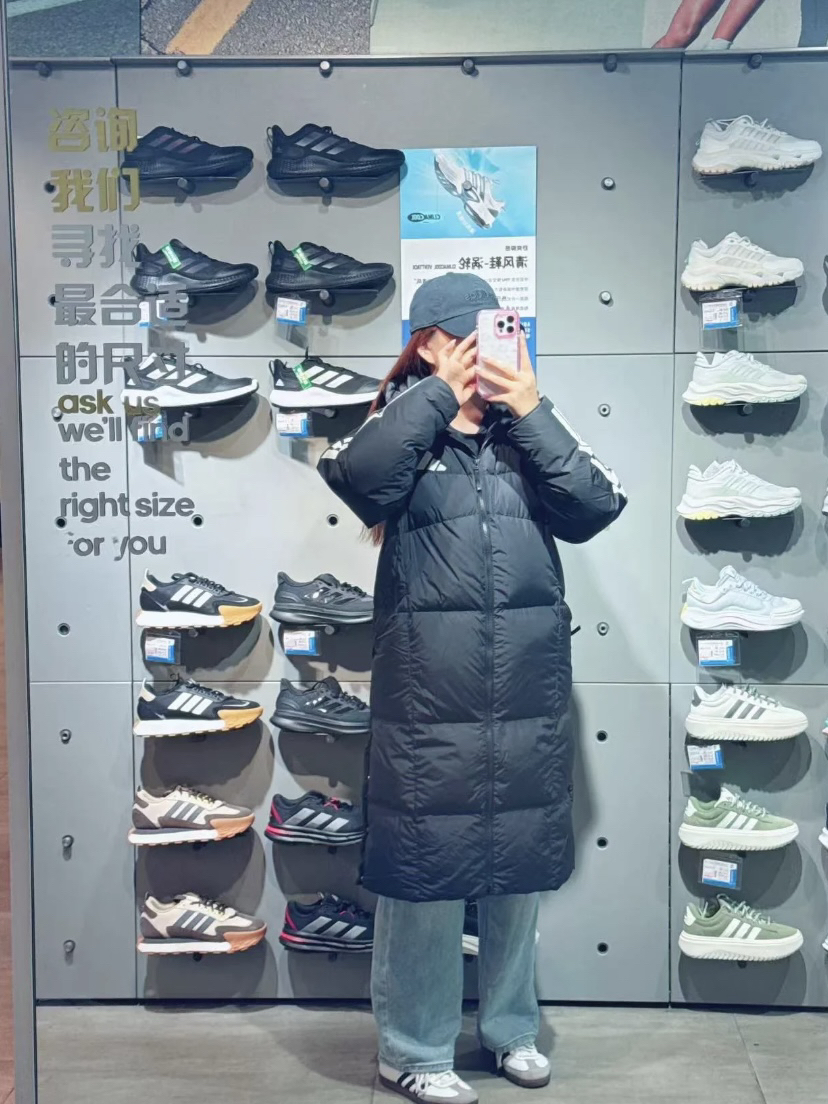 ⭐️长款羽绒服真的好像裹了个大被子出门! 斜门襟的长袍版型很有日系复古感 适合搭配一些基础款单品🔥 里面穿了宽松白t和灰色阔腿西裤 这一套就很随性@21世纪阿迪达斯