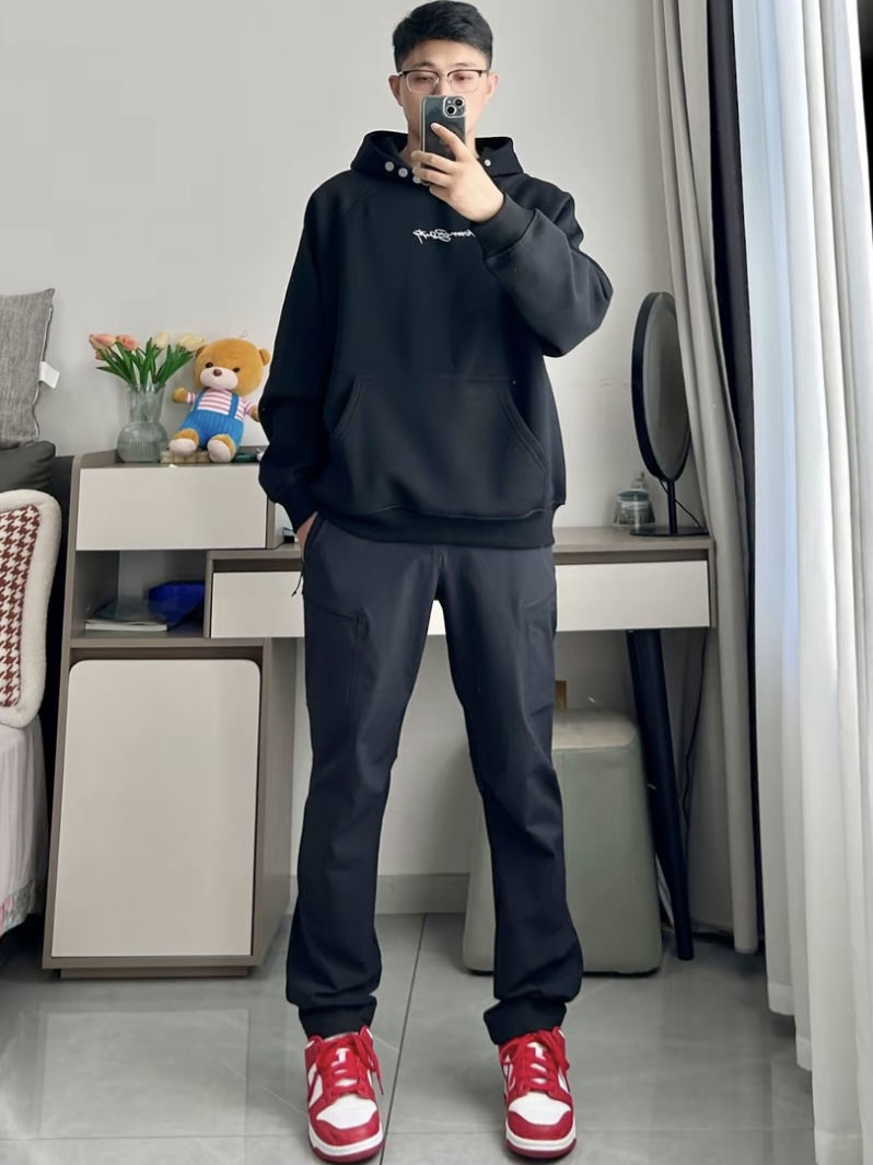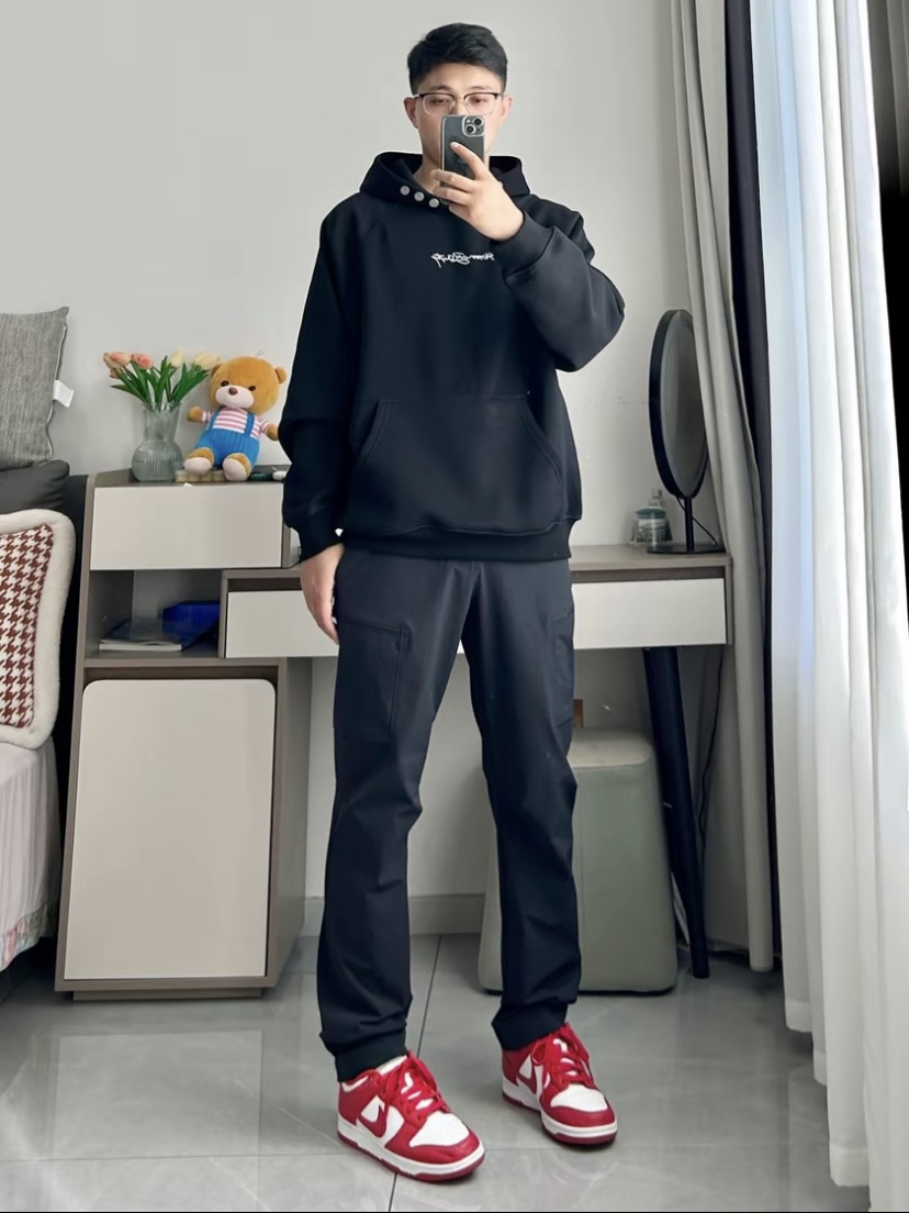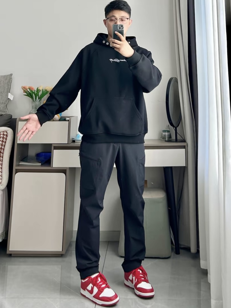 黑色卫衣十Nike大学红你可以相信的穿搭 简约黑色 0404MOB GANG 连帽卫衣🌨️ 重磅加绒厚实面料,上身柔软舒适宽松版上身无束缚 搭一条凯乐石黑色户外运动裤 鞋子选择的是Nike大学红Dunk @乘风破浪来了🌊