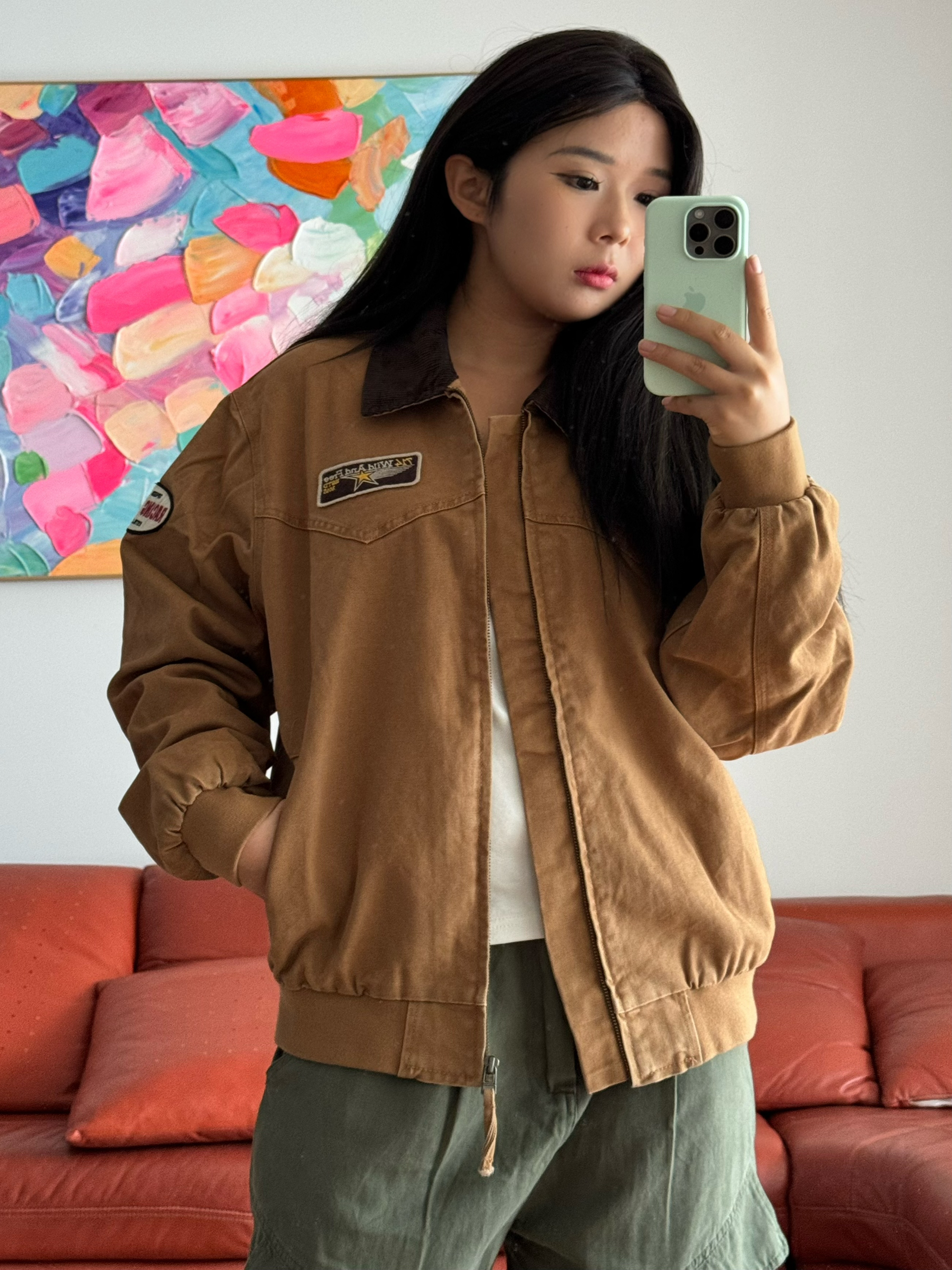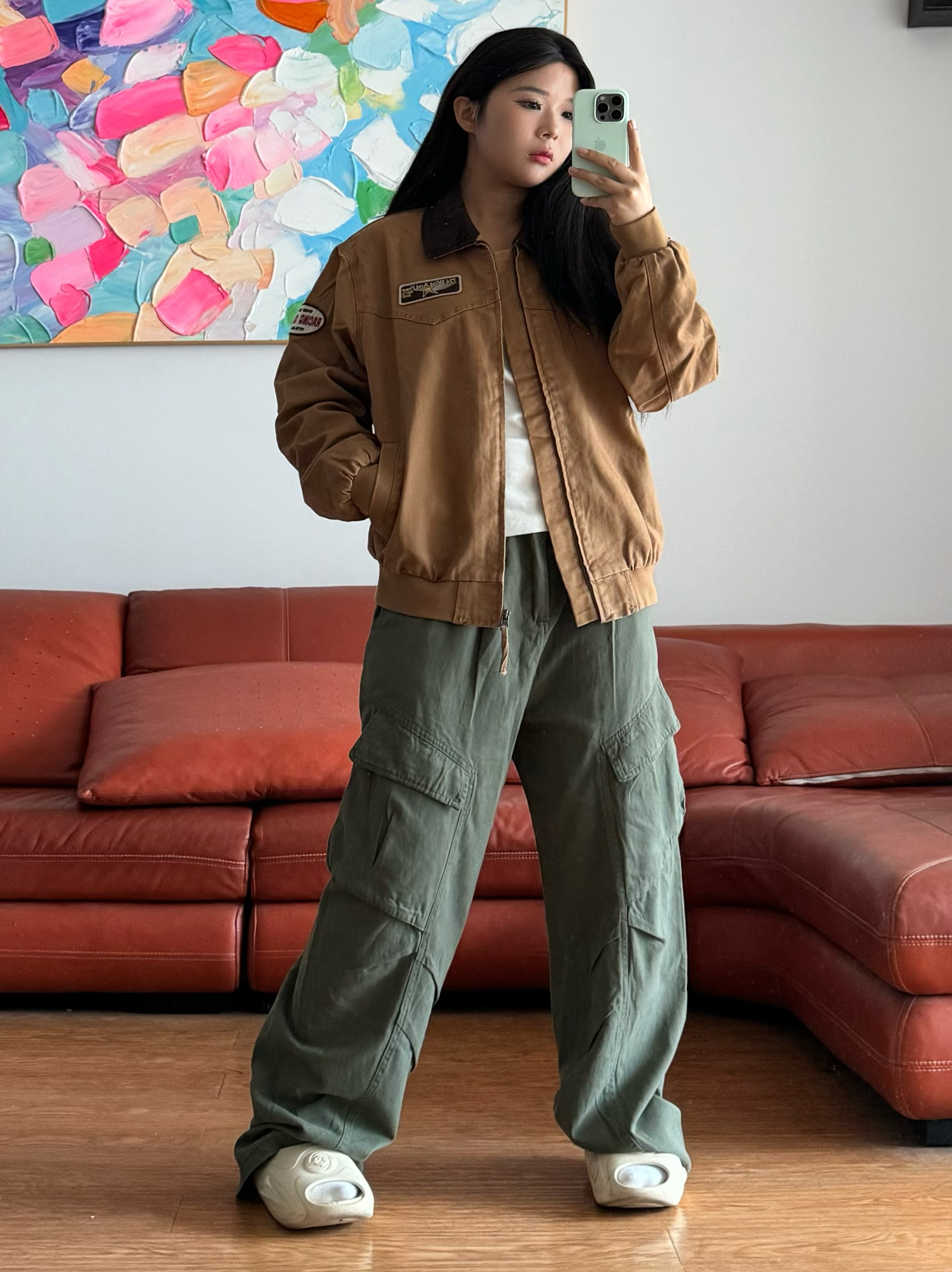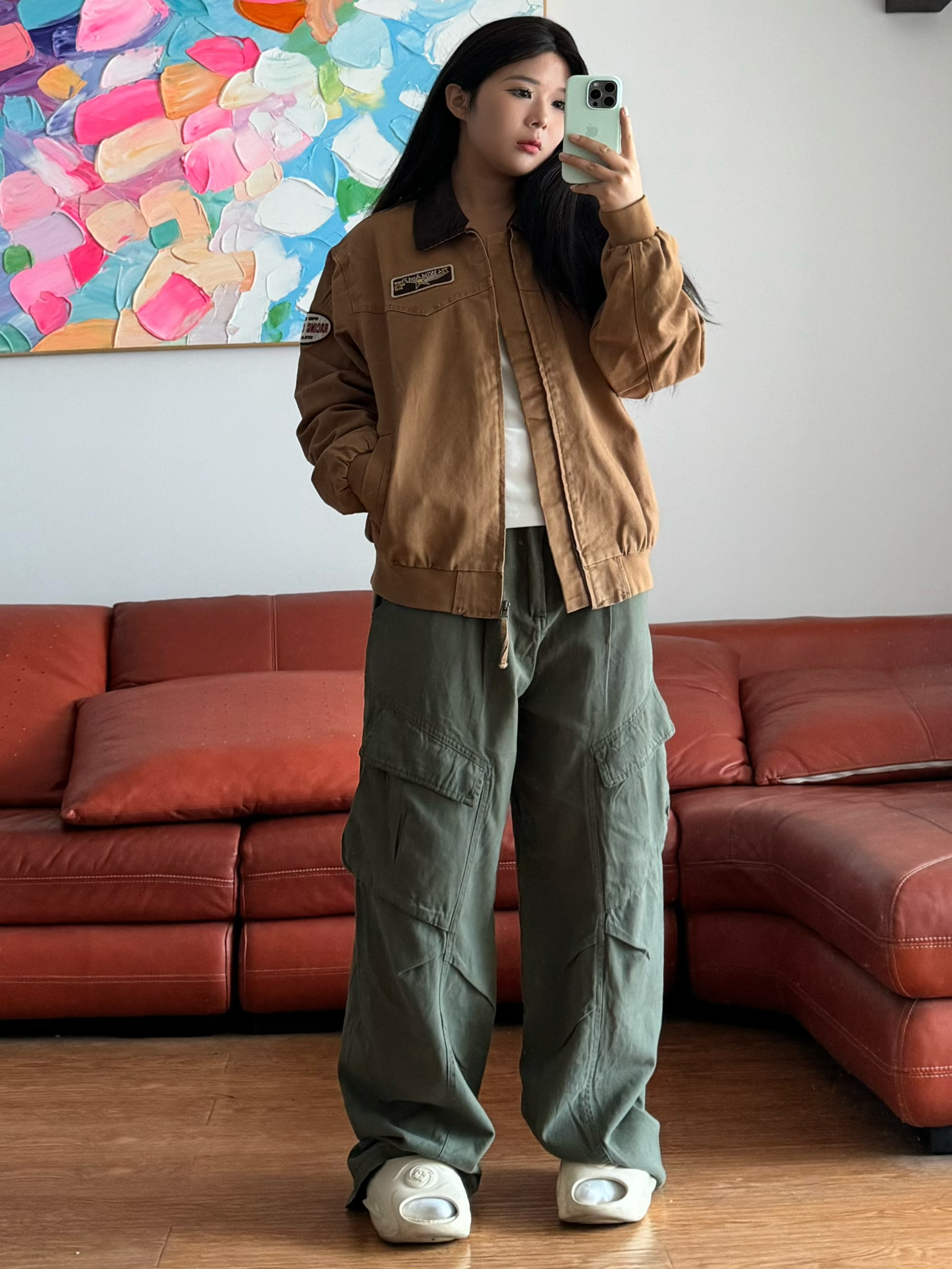 喜欢复古夹克 那你可以试试 714STREET 衣服整体版型很好 上身好看 刺绣印花做工也很好 泥黄色搭配墨绿色阔腿裤 复古感满满 身高162,体重120,衣服上身M码