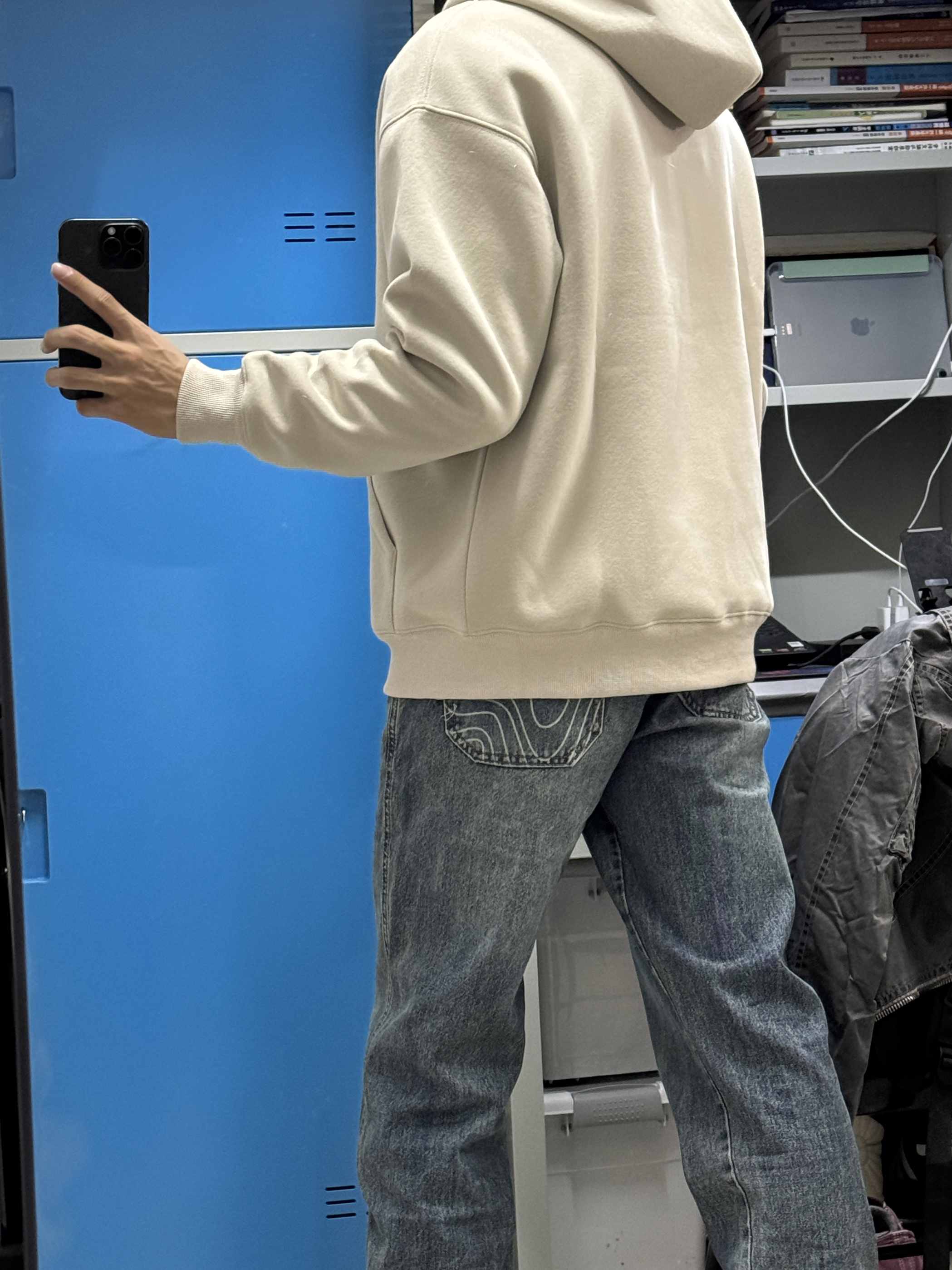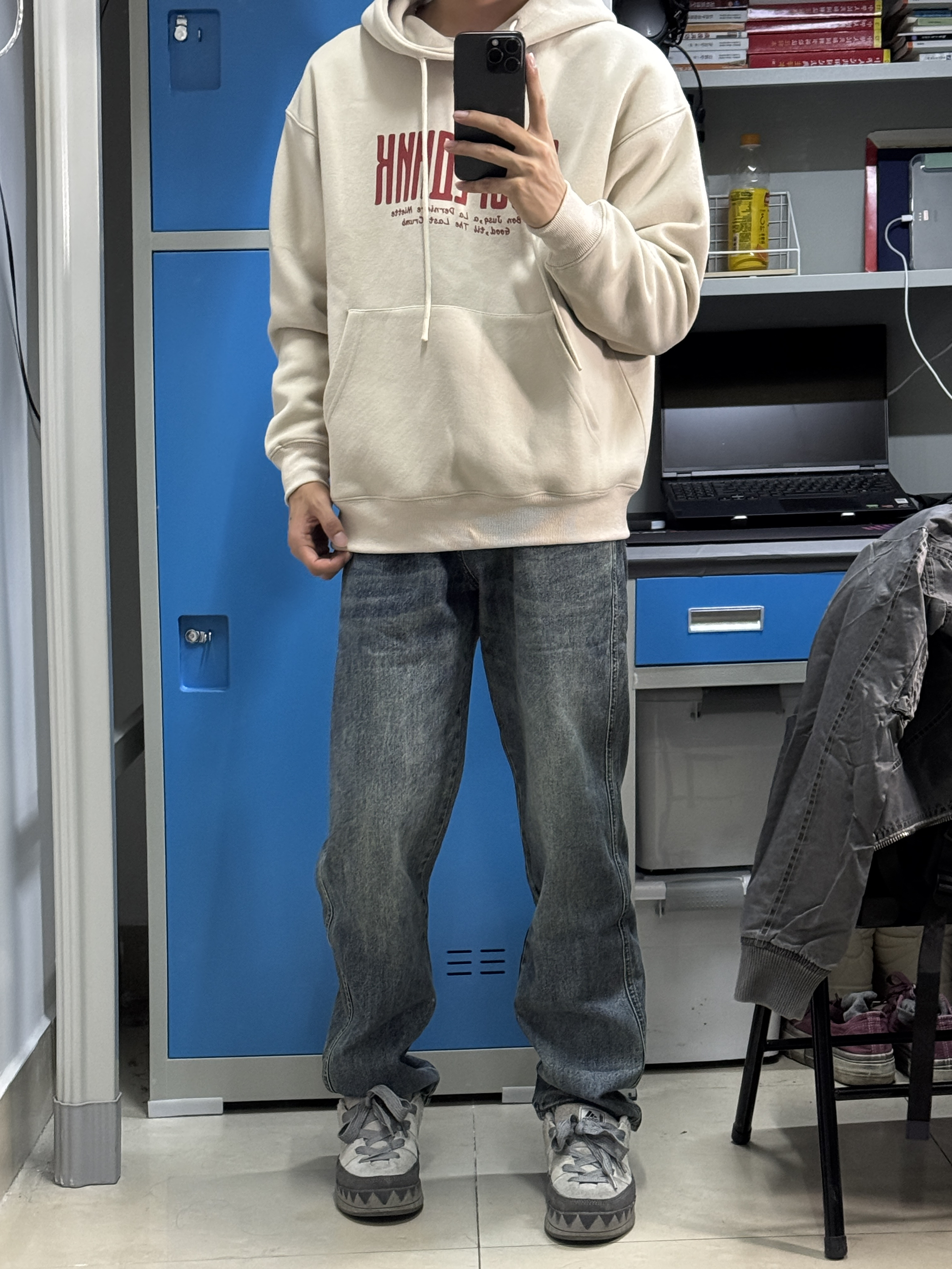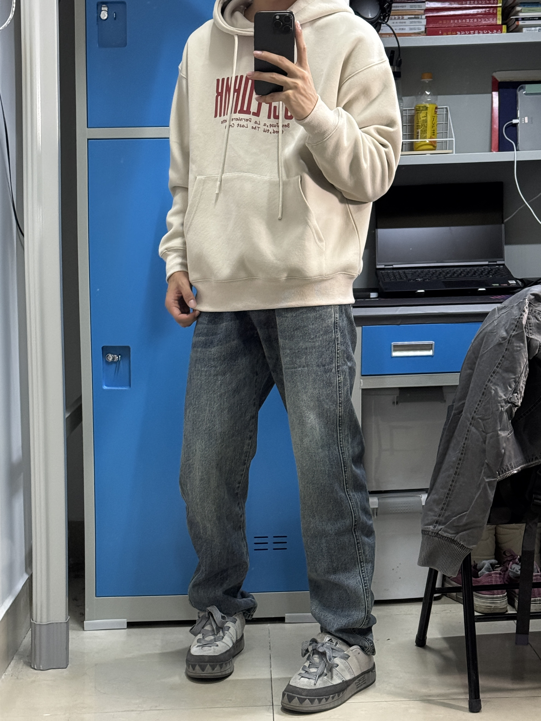 👔上身的是一件灰杏色的连帽卫衣,衣服面料质感很好,宽松的版型上身效果休闲百搭,满足日常的学习逛街出游穿搭 👖裤子搭配的是一件直筒牛仔裤,裤子做了一个上宽下窄的版型设计,上身显高显瘦。