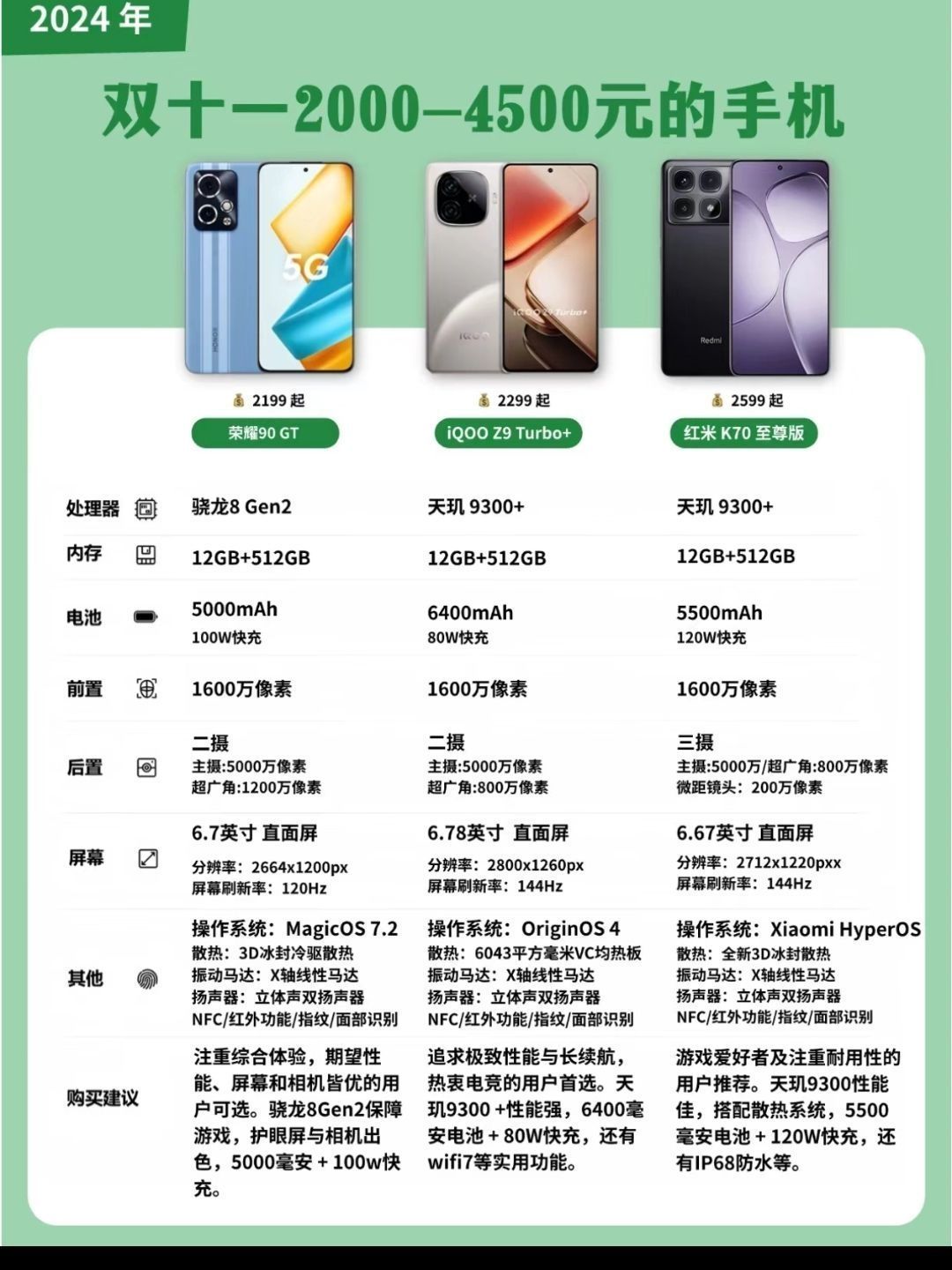 双十一有哪些手机值得入的?预算普遍在2000-4500元,那么就出一篇此价位 12G+256GB,值得入手的手机给大家参考。荣耀90GT -注重综合体验,期望性能、屏幕和相机皆优的用户可选。骁龙8Gen2保障游戏,护眼屏与相机出色,5000毫安+100w快充。 iQO0 Z9Turbo+ -追求极致性能与长续航,热衷电竞的用户首选。天玑9300+性能强,6400毫安电池+80W快充,还有 wifi...