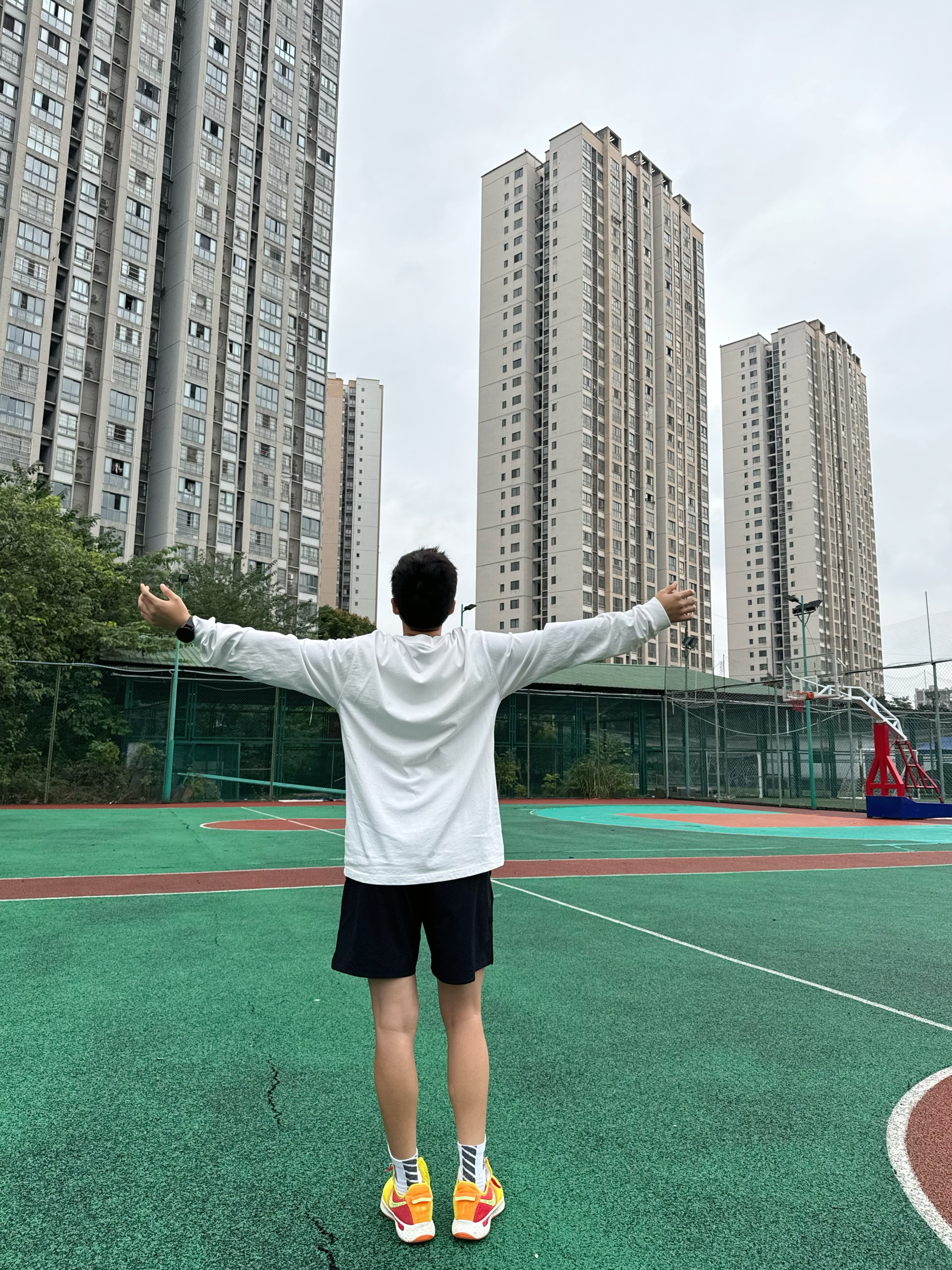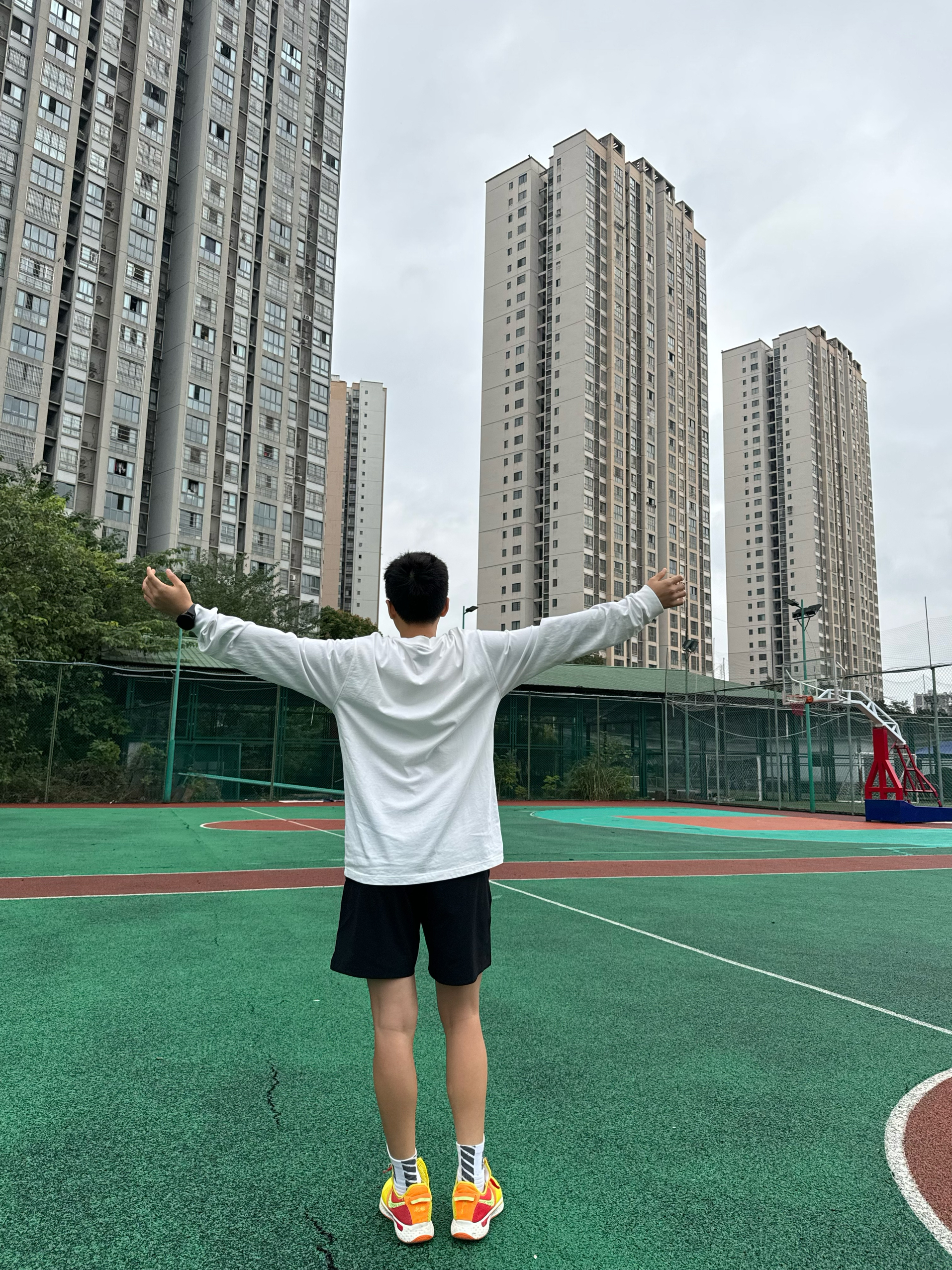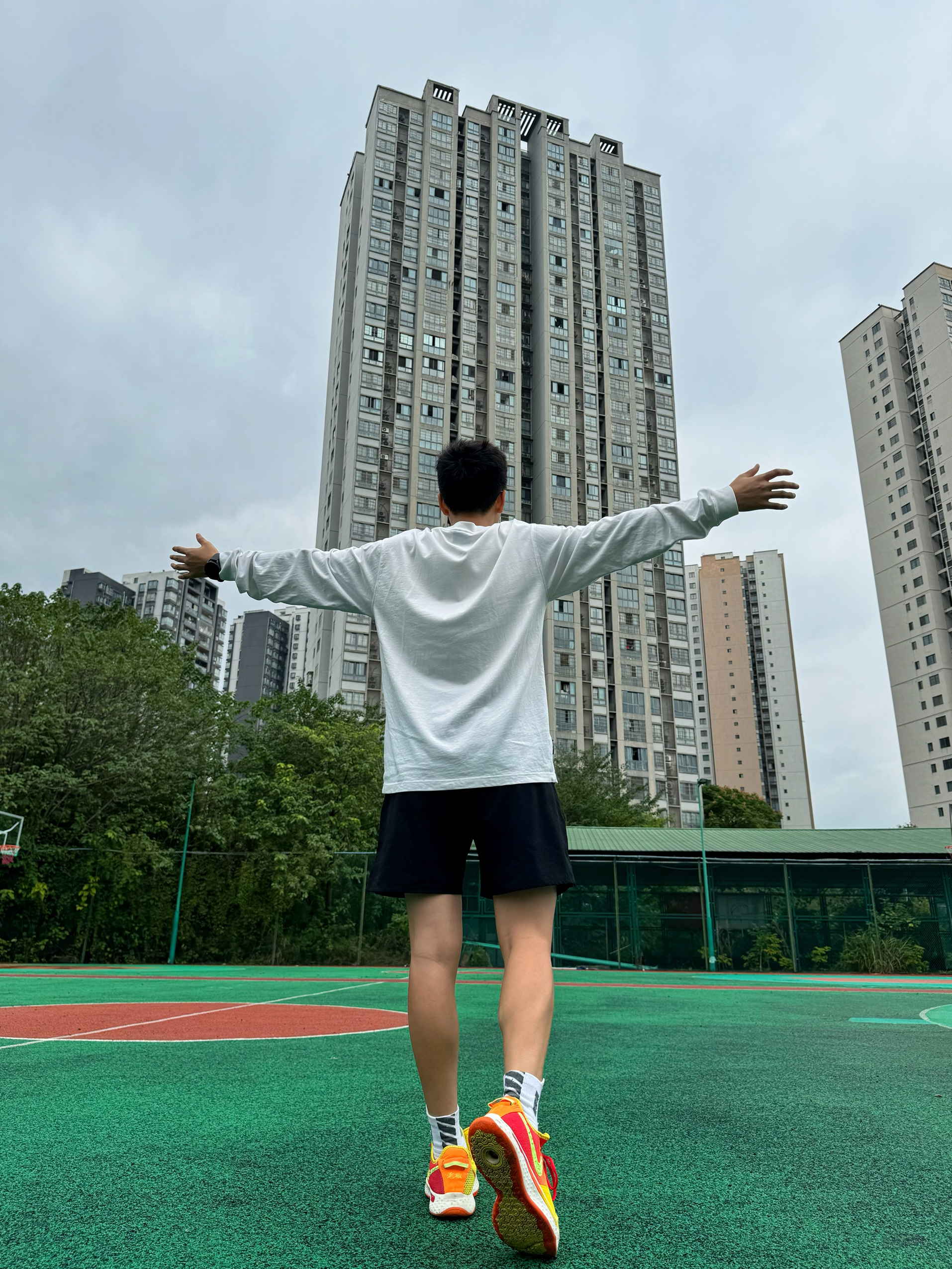 身高|体重:174 67kg(女) 🧍♂️ 穿搭风格:运动休闲 👔 上衣:上身的是wassup的基础款长袖T恤,纯棉材质,亲肤,柔软。有点偏大,能遮住臀部,显瘦。衣服重量适中,出去投篮穿它,然后穿个外套就差不多了。适合这个季节穿。白色真的很显年轻,永远的少年感满溢! 👖 下装:tipoff短裤 👟 鞋子:pg4 🎒配饰: