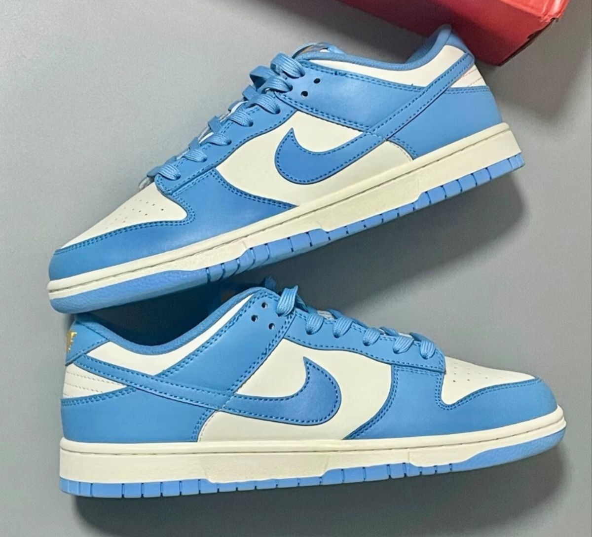 👟球鞋名称:aj北卡蓝dunk 📌是否偏码【偏大/不偏码/偏小】:正常 📖总结评价:aj北卡蓝dunk真挺好的,白蓝配色显腿白,牛皮皮革材质,想要清冷感的穿搭完全没毛病,新手可以试试。正常码就行,感觉板脚可以买个软软的鞋垫。