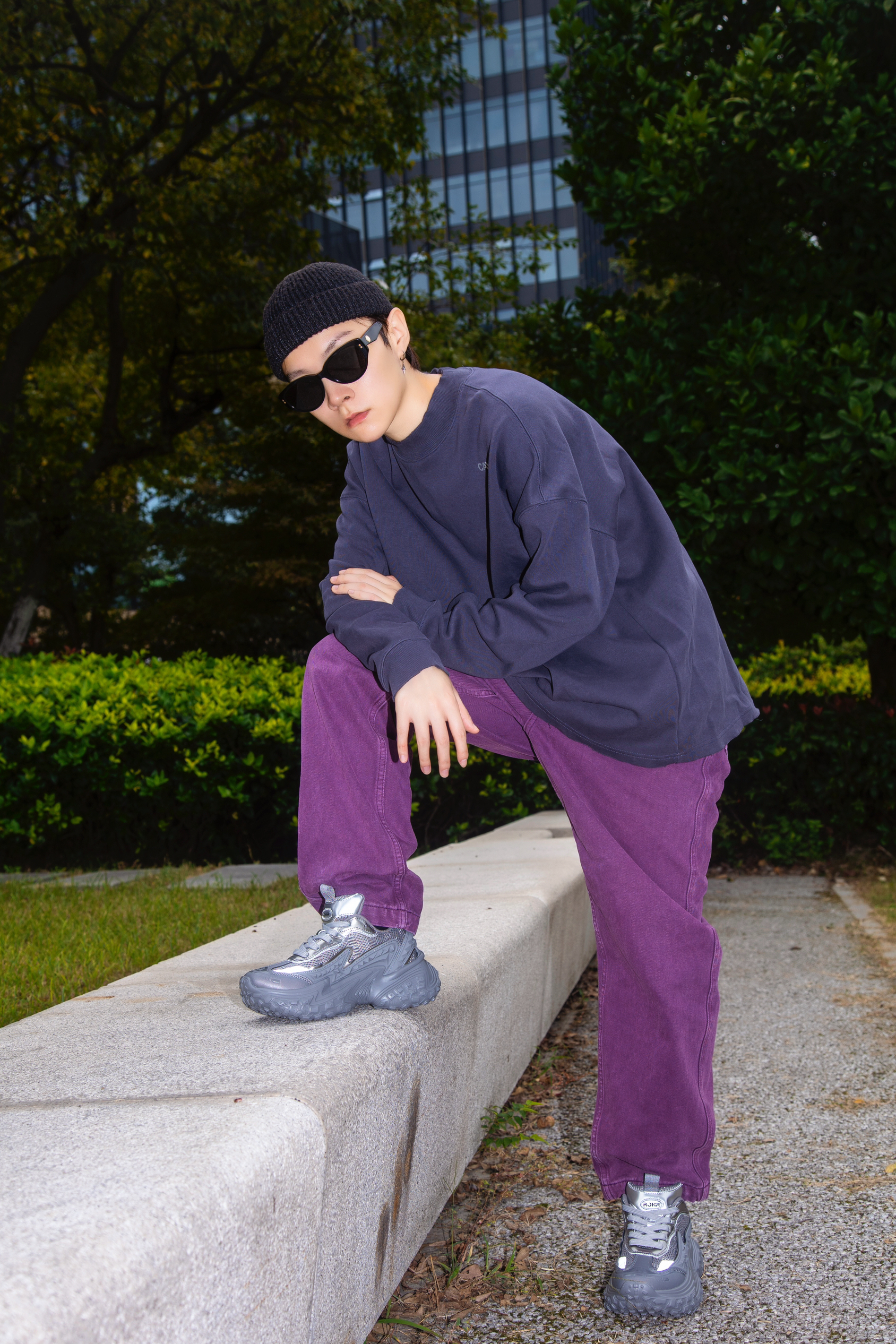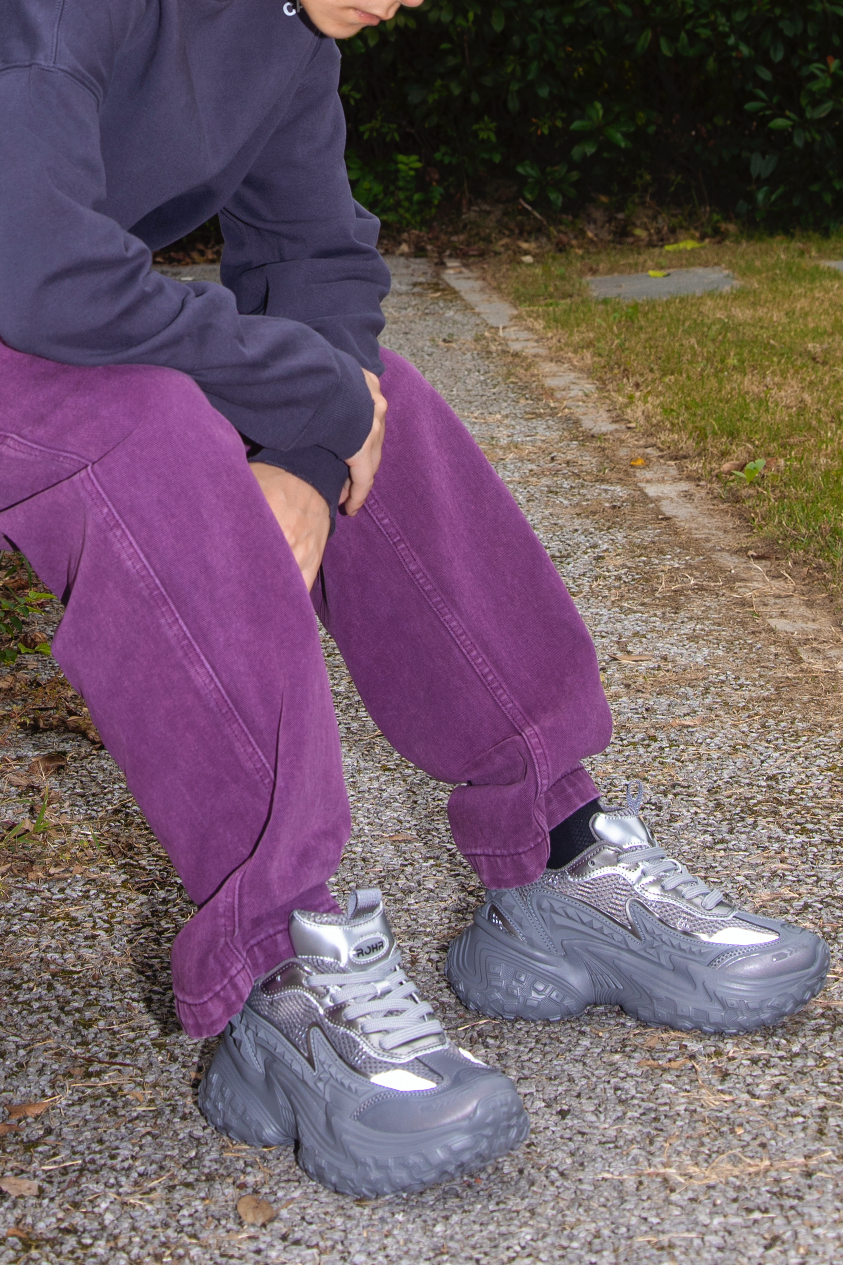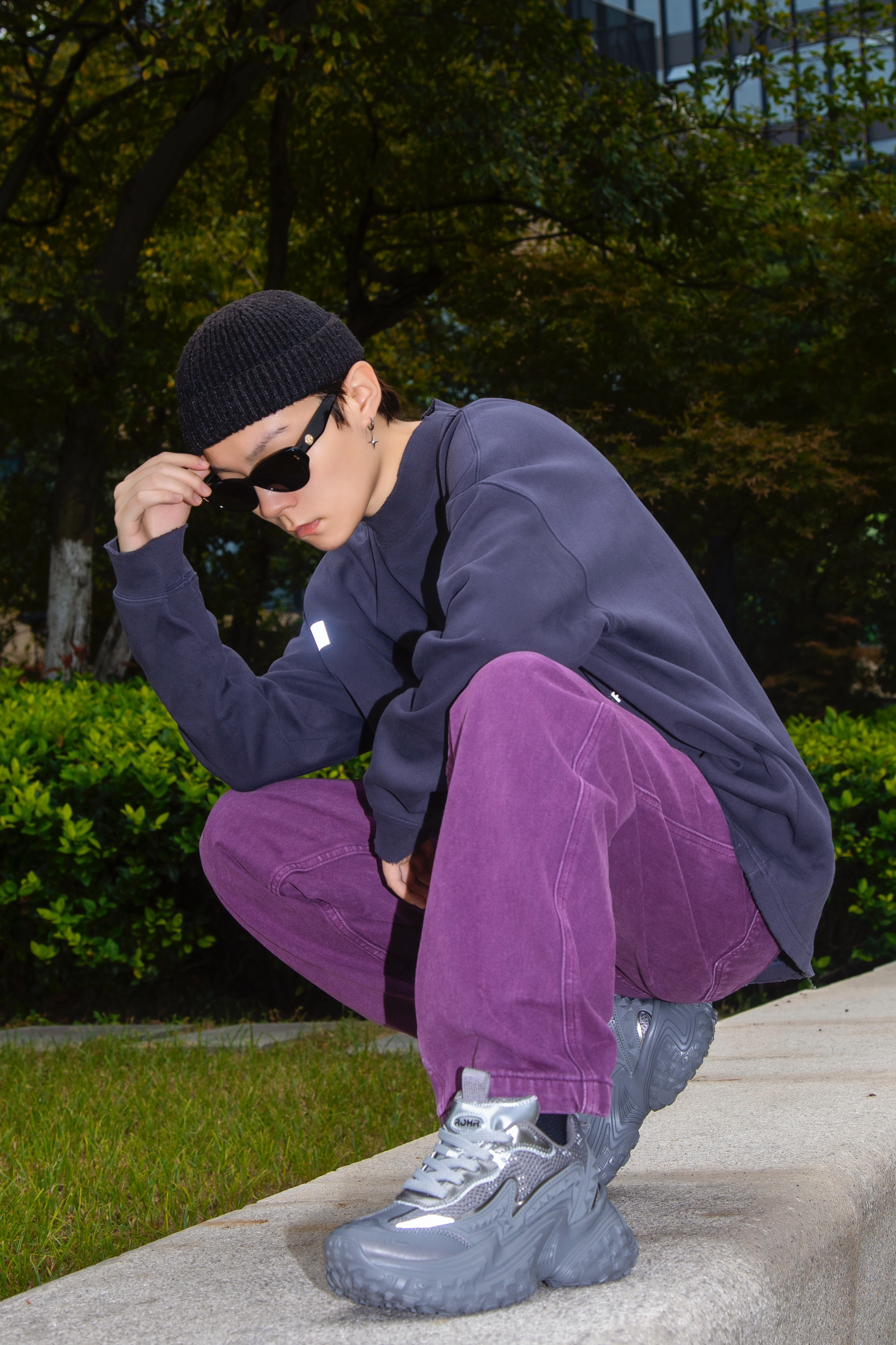 灰色和紫色搭配真的很可以 分享一套绝绝紫的格雷系穿搭 穿搭指南: 上身一件灰黑色长袖T恤 小高领配字母印花 简单随性 配一条紫色牛仔裤眼前一亮 选一双rohr老爹鞋 烟灰色和上衣刚好呼应 鞋底轮胎鞋的即视感 很时髦 厚鞋底穿起来贼舒服 灰和紫两个高级配色搭在一起 就问能行不能行