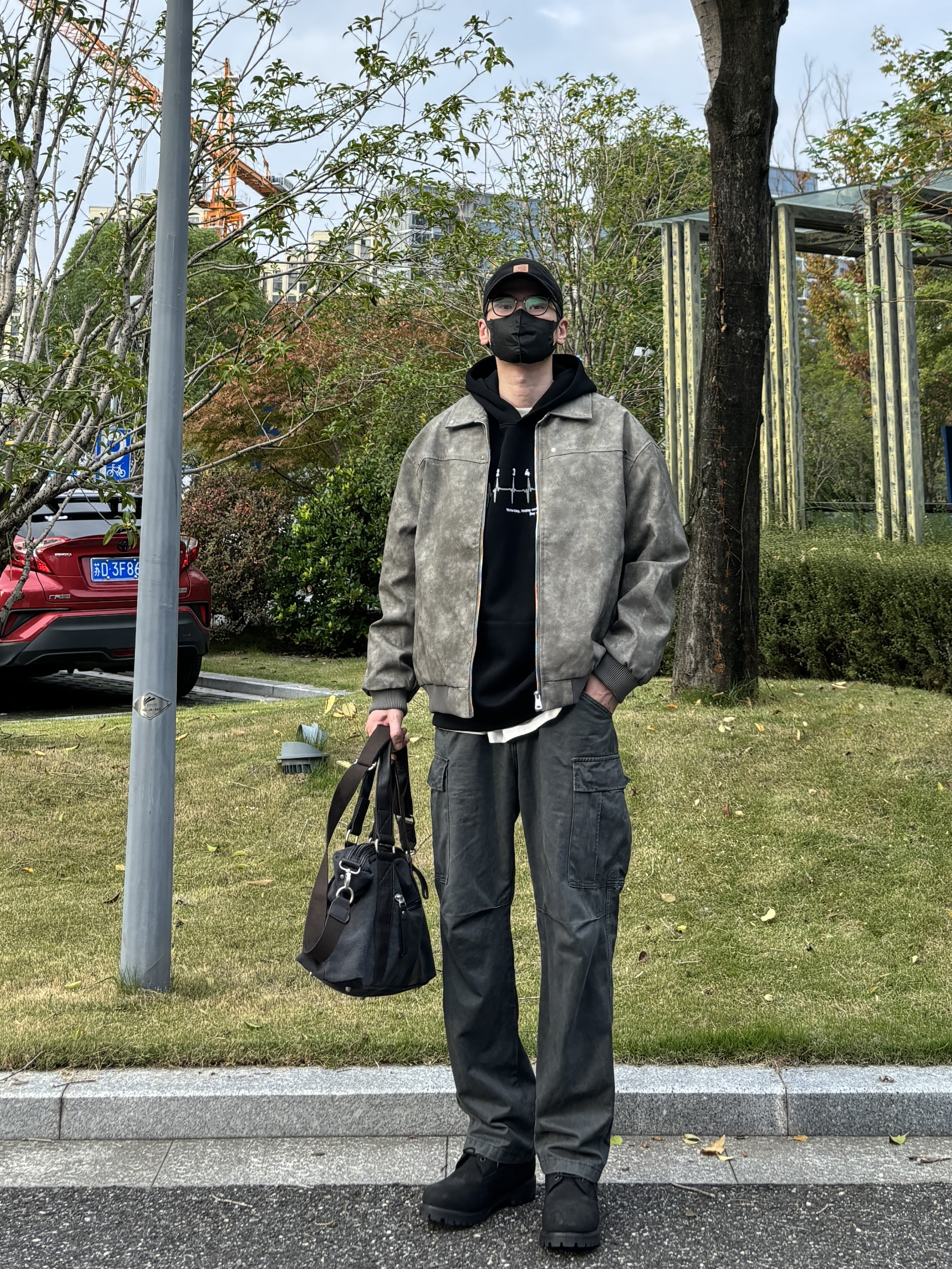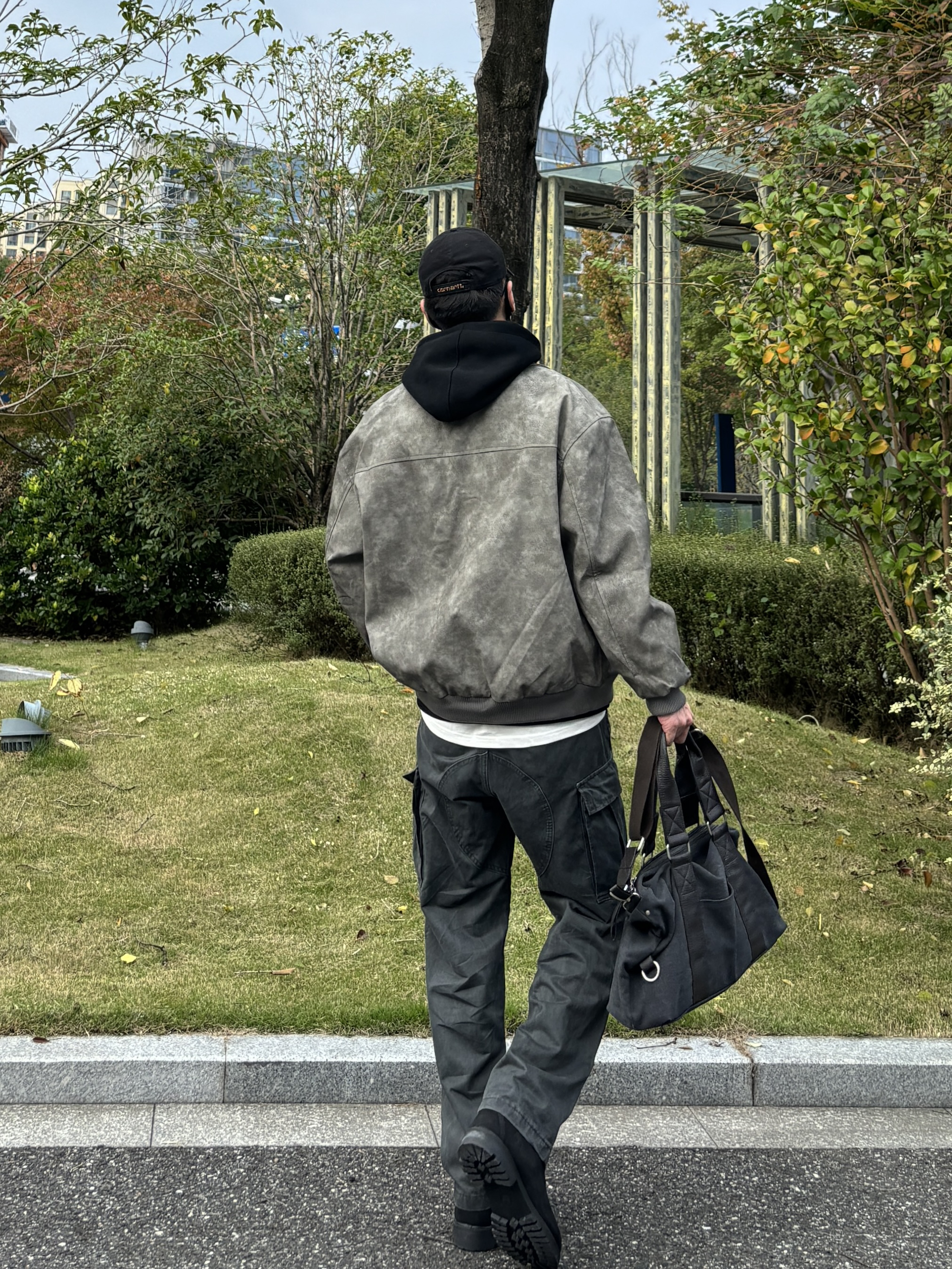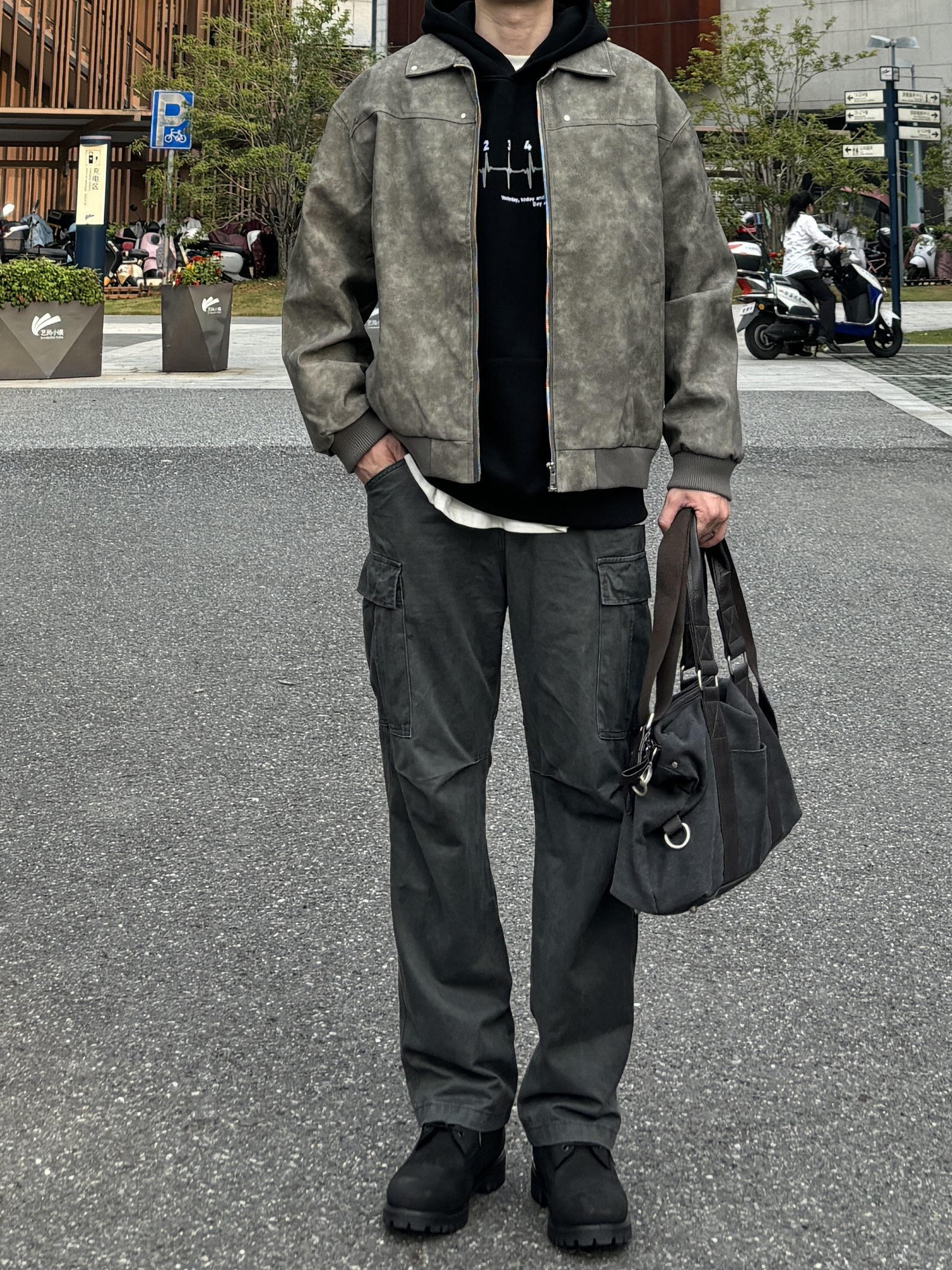 今天这套先用黑色重磅印花连帽卫衣做内搭 ⬇️ 裤子选择深灰色直筒水洗做旧多口袋工装裤 ⬇️ 鞋子上脚经典百搭的timberland大黑靴 ⬇️ 接着套上灰绿色宽松阔版复古翻领皮衣夹克 ⬇️ 最后拿一个黑灰帆布拼接手提包 - 今日搭配 衣服裤子:NICE LILI 鞋子:timberland