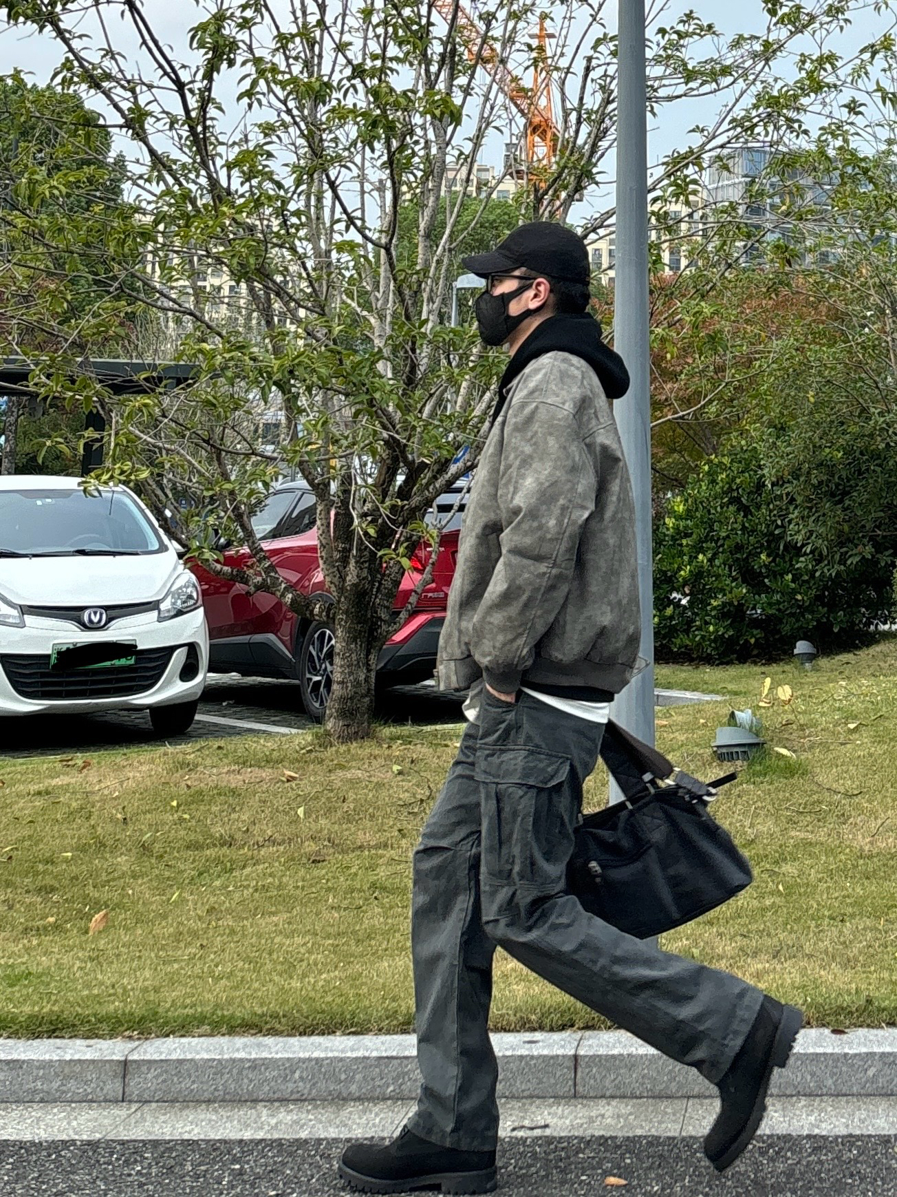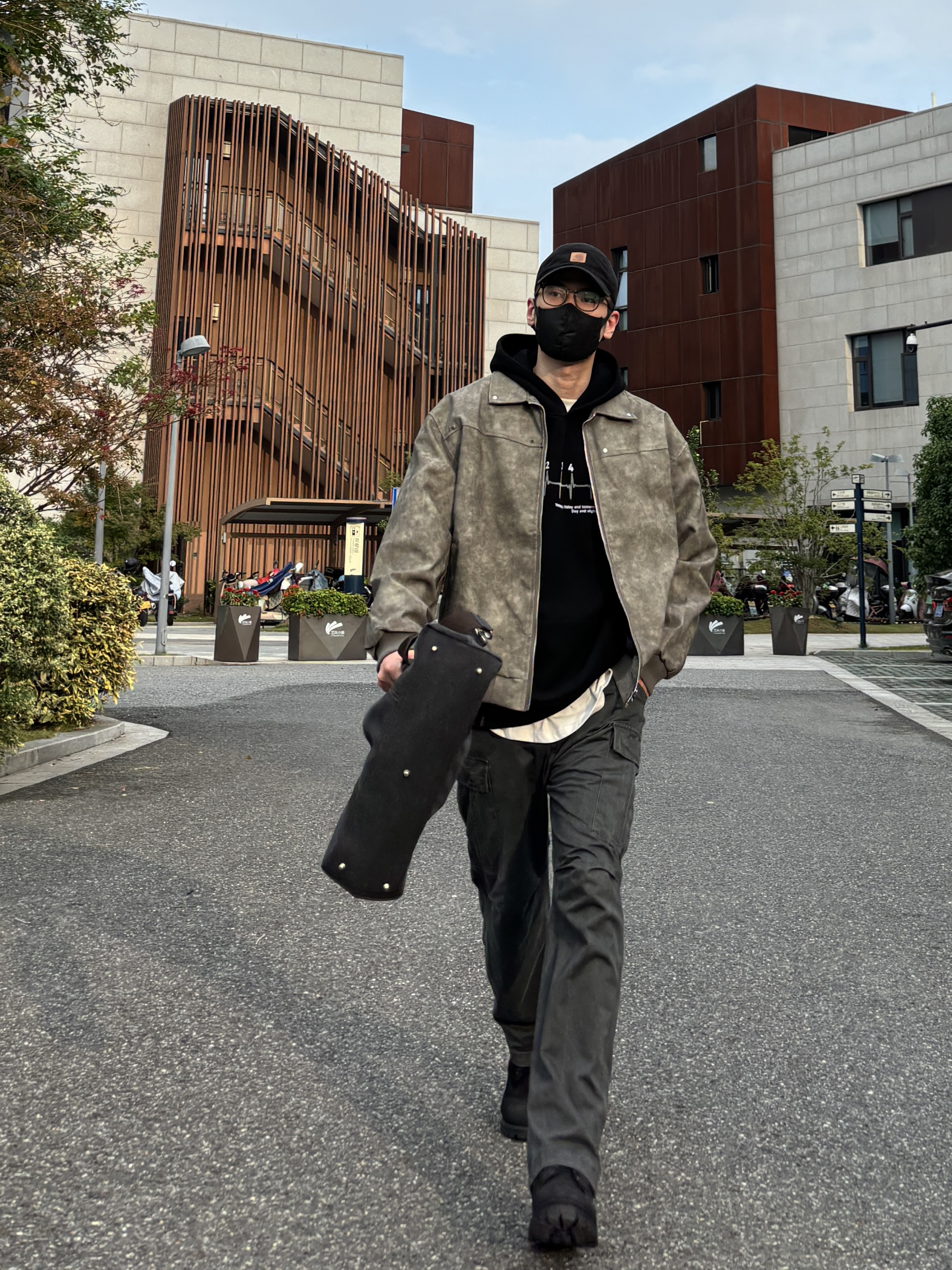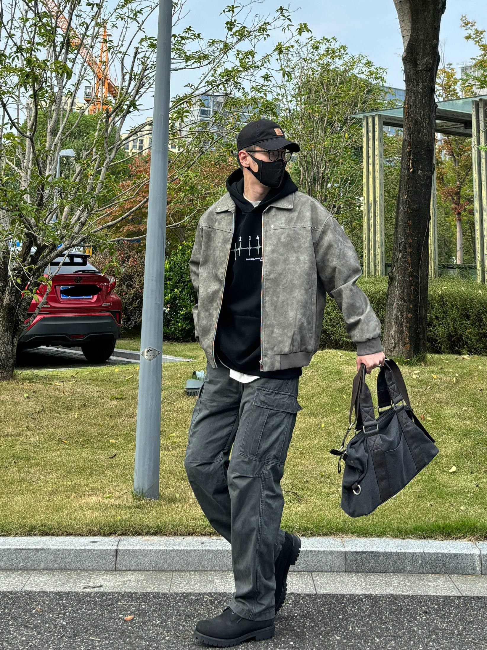 今天这套先用黑色重磅印花连帽卫衣做内搭 ⬇️ 裤子选择深灰色直筒水洗做旧多口袋工装裤 ⬇️ 鞋子上脚经典百搭的timberland大黑靴 ⬇️ 接着套上灰绿色宽松阔版复古翻领皮衣夹克 ⬇️ 最后拿一个黑灰帆布拼接手提包 - 今日搭配 衣服裤子:NICE LILI 鞋子:timberland