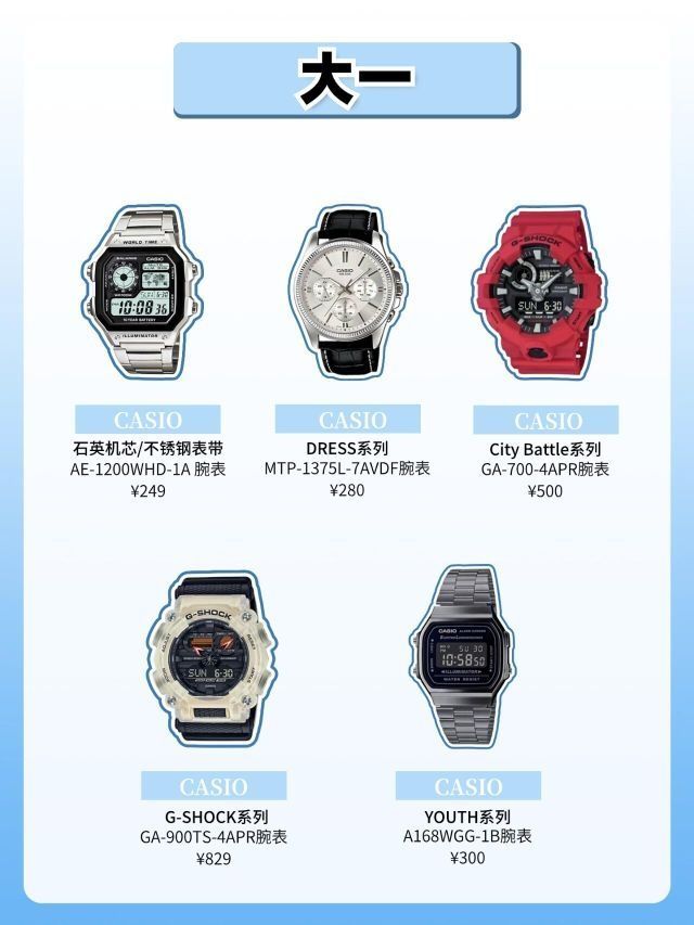 作为男士为数不多的穿搭单品 一块有品位的手表真的很加分 不仅可以起到点缀的作用,还能彰显个人的品味 今天就来看看不同年级的男大学生适合戴什么表 大一新生: CASIO 石英机芯/不锈钢表带 CASIO DRESS系列 CASIO City Battle系列 CASIO G-SHOCK系列 CASIO YOUTH系列 大二学长: CASIO G-SHOCK系列 CASIO YOUTH系列 CASIO...