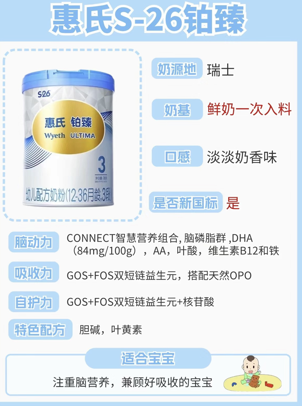 本篇笔记关联了惠氏/Wyeth S-26铂臻3段幼儿配方奶粉 瑞士进口新国标大脑发育 780g等商品,为用户提供真实的使用体验和购买参考。