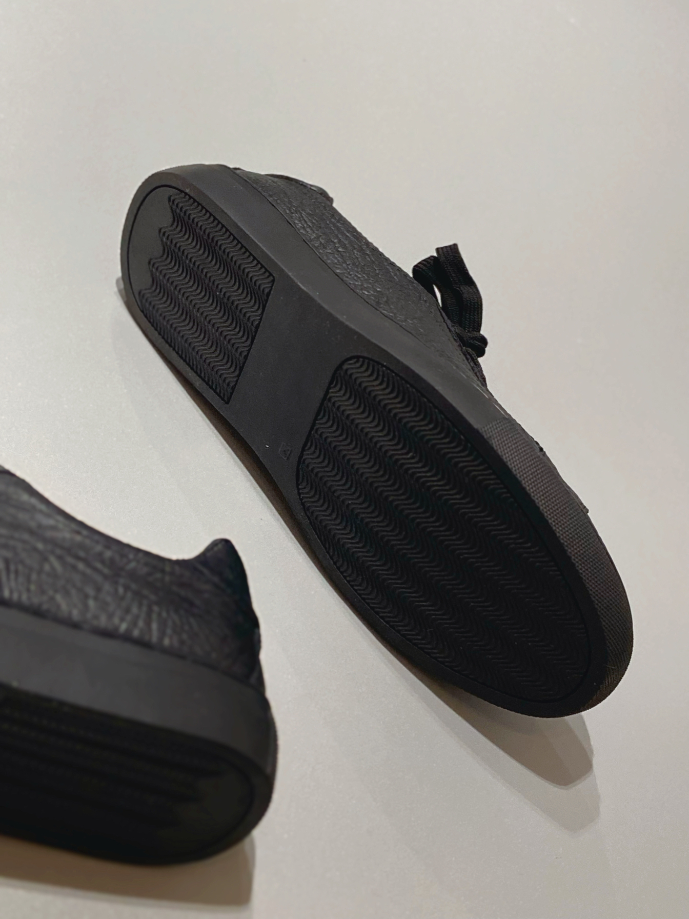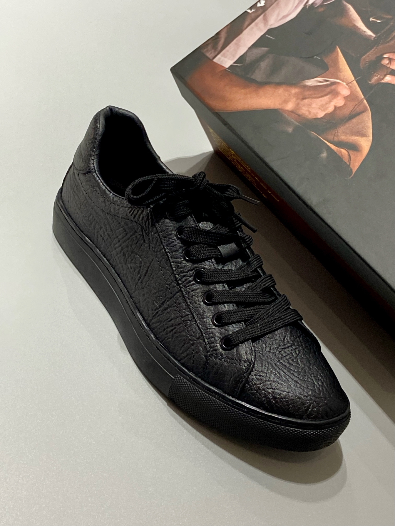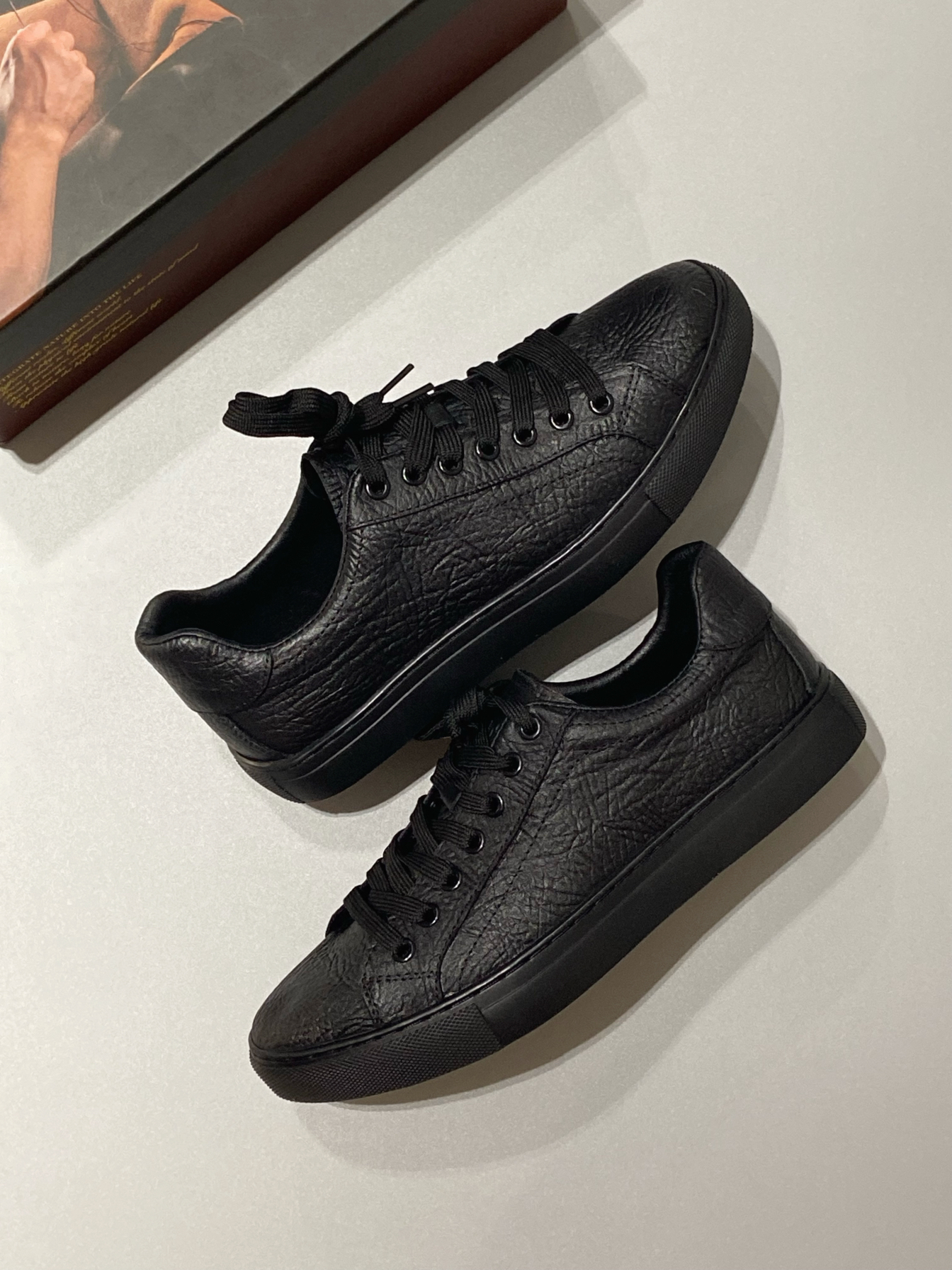 最近种草的这款黑武士板鞋 整个鞋子都是黑色 质感满满 穿着脚感蛮舒服的 软硬适中 日常休闲、商务通勤都可搭配 鞋面和内衬都是皮的 舒适透气 鞋型偏瘦,我穿尺码正常 脚背高的建议拿大一码 !