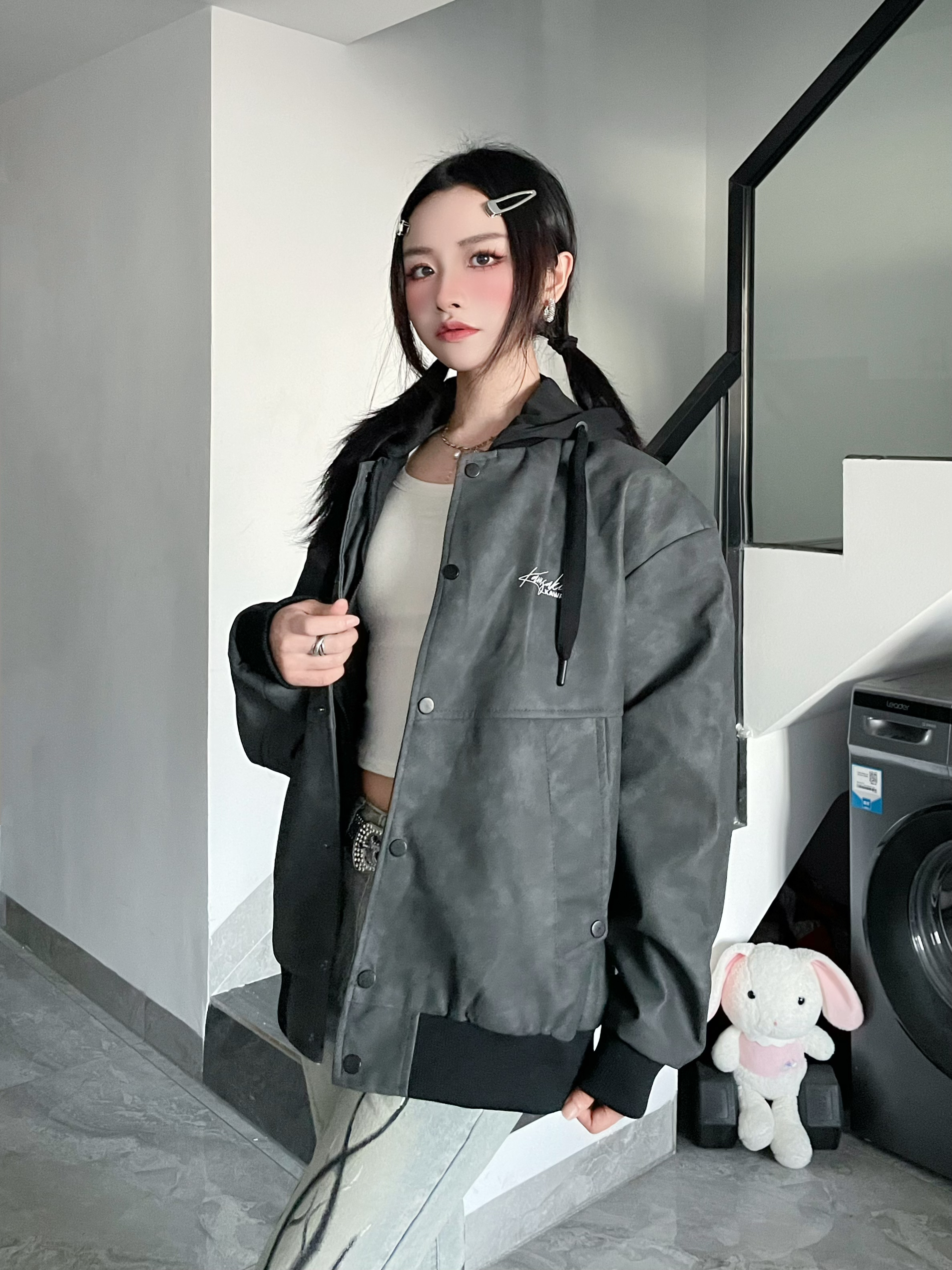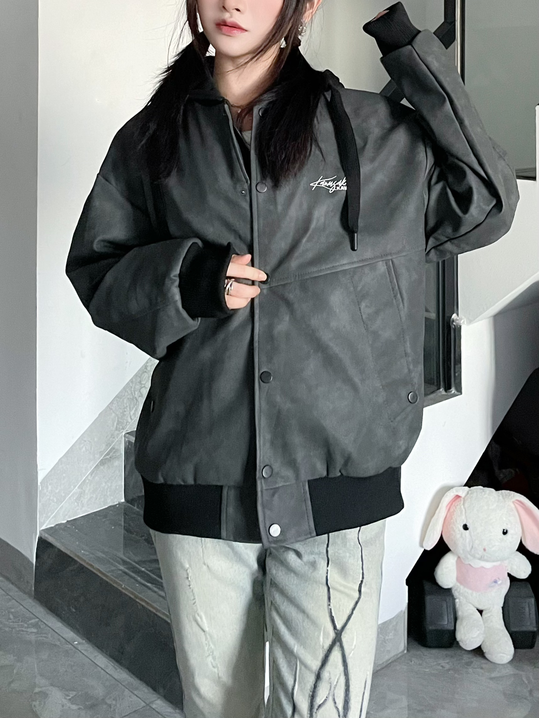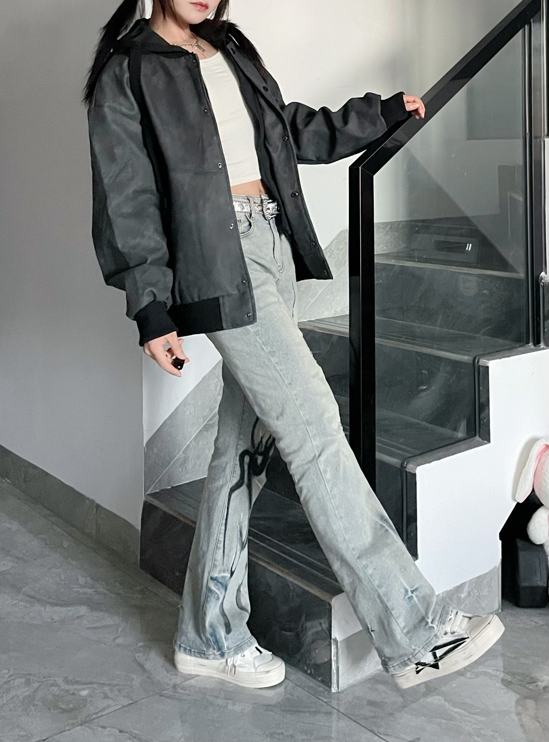 酷女孩不费力首选假两件🤞🏻 搭配微喇牛仔👖好显瘦~ 板鞋👟呼应内搭很有层次感哦 这件 Kawasaki川崎 皮夹克太酷了! 皮面是有纹理滴很有质感~ 敞开拉上都可以一衣多穿! 秋冬🍂不费力首选啦!