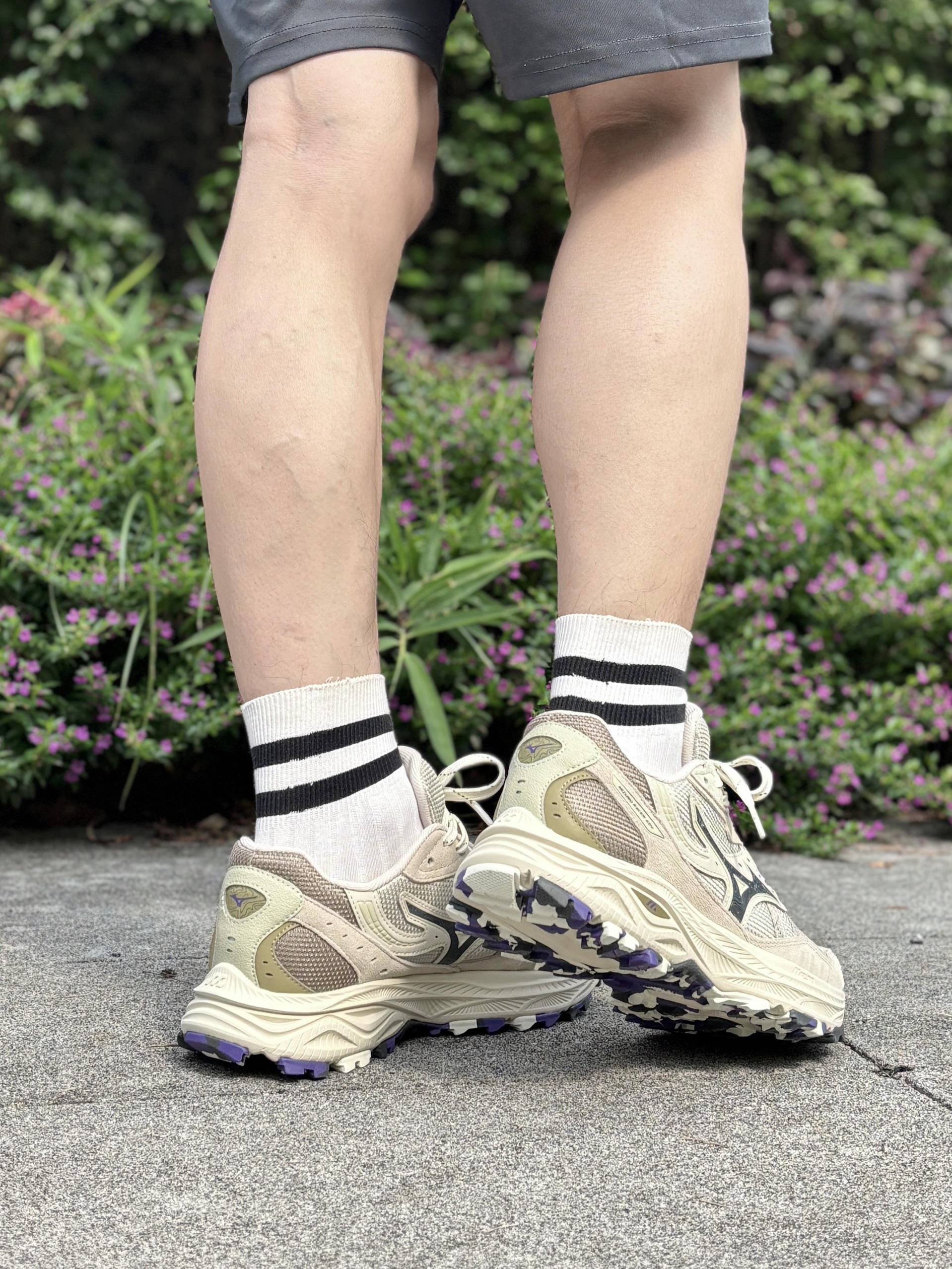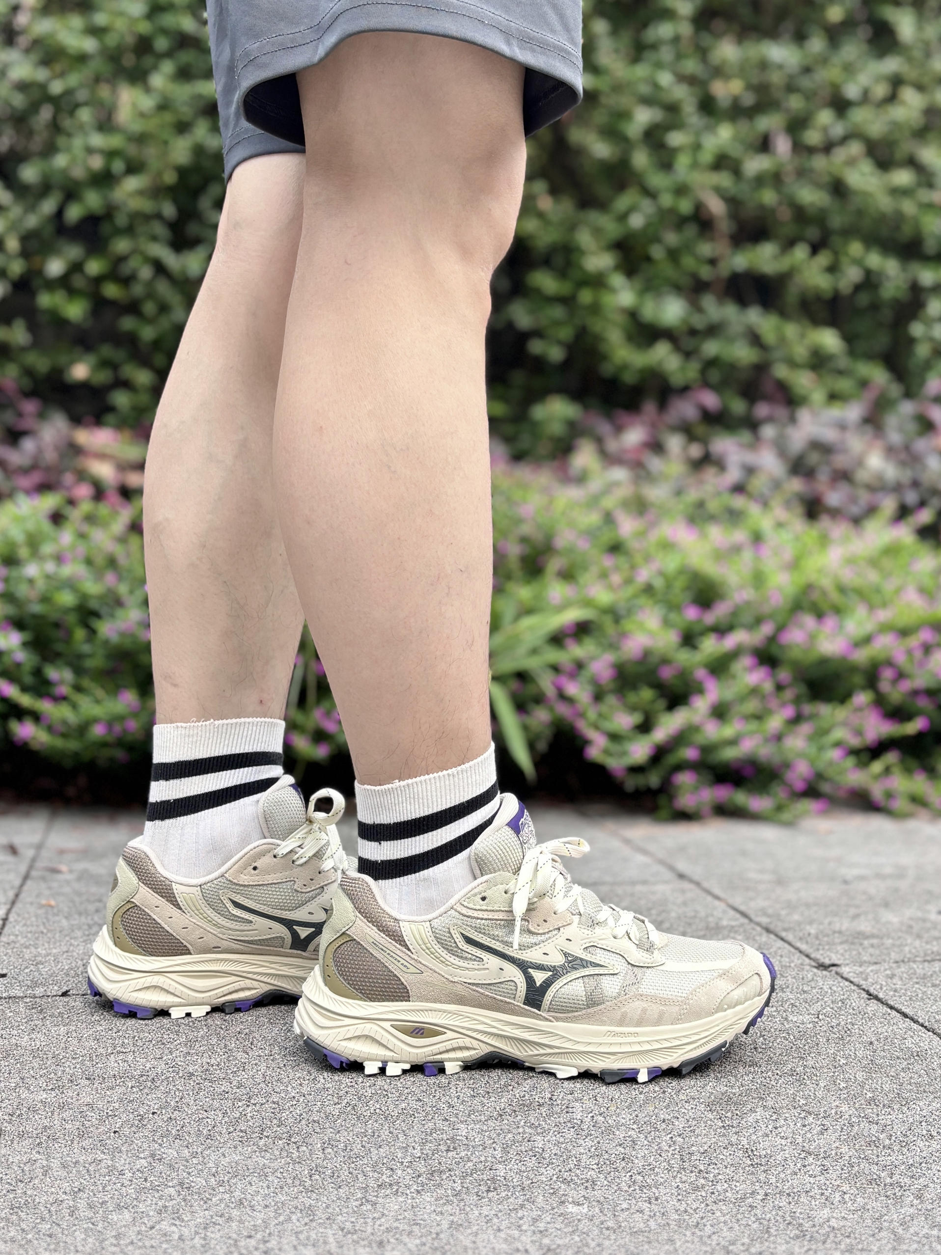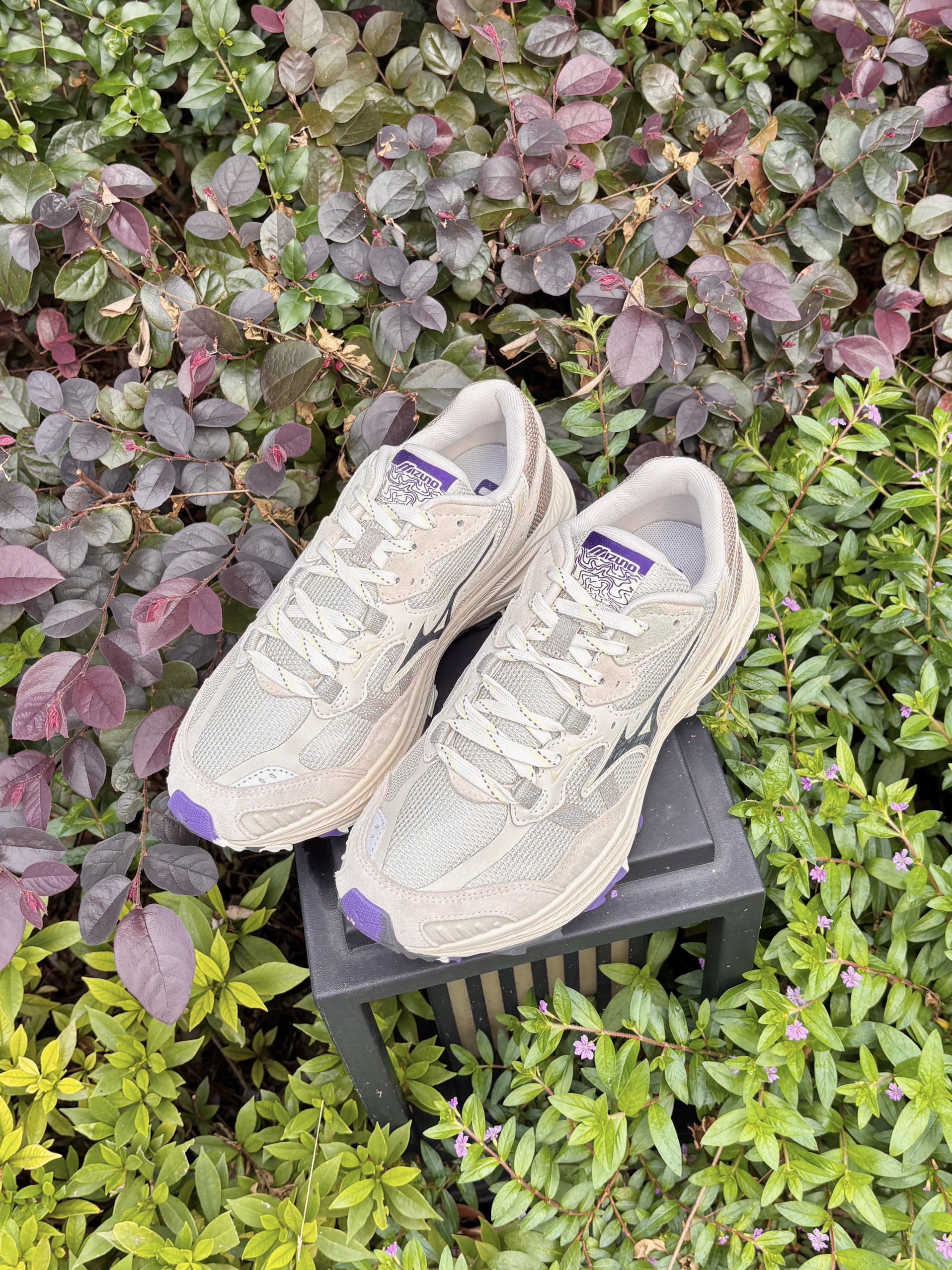 💁♂️:Hi~ 这里是大大纳mi~ 分享一双我很喜欢的Mizuno跑步鞋 国庆假期准备穿它出去走走啦! 以米色为主色调,紫色点缀💟 版型也还是一如既往地复古味儿 有被它的颜值好看到,上脚也很帅 平时搭裤装🩳小裙子👗都是可以的! 网布鞋面+韧弹中底+橡胶大底 兼顾透气和脚感,适合轻运动和通勤穿!